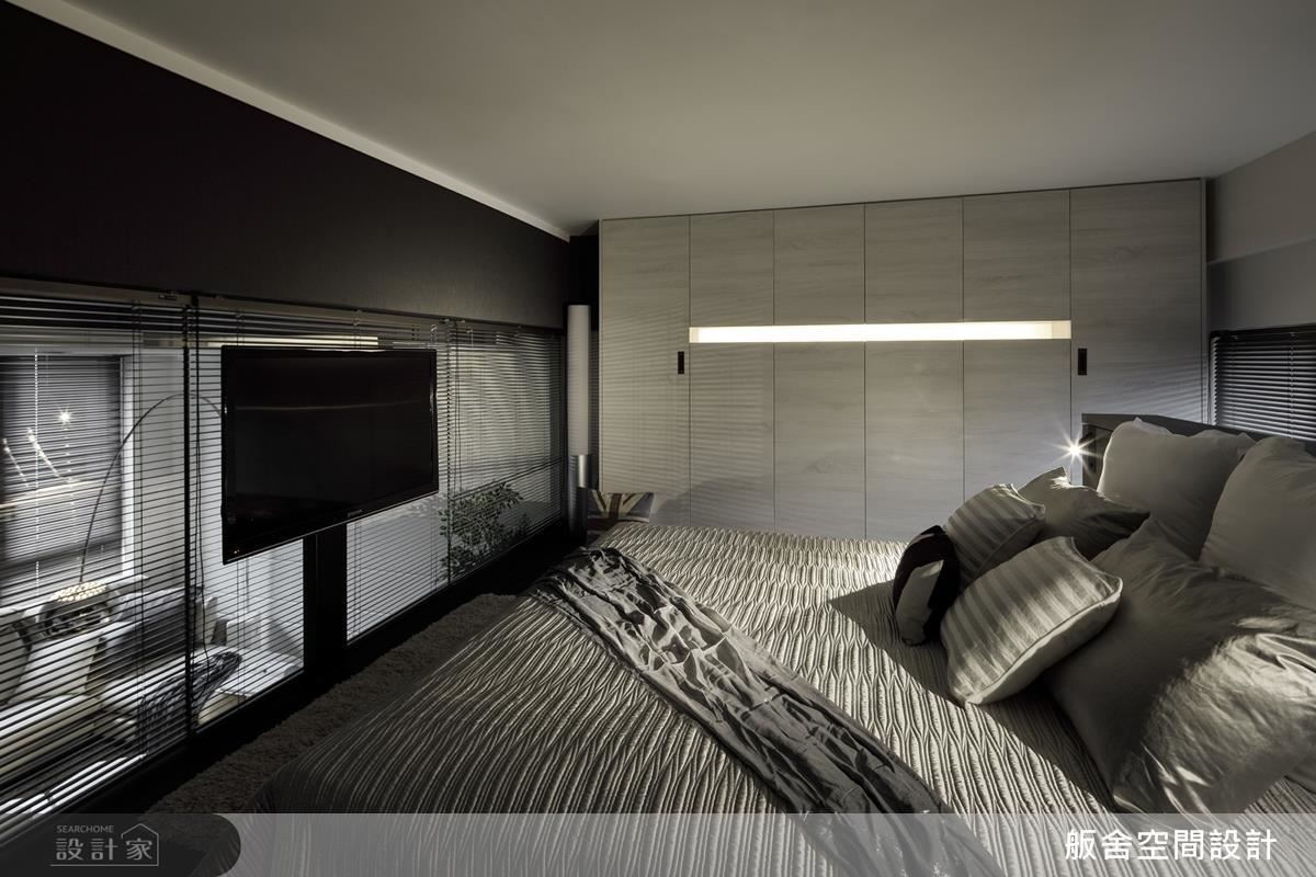 主臥以開放式的手法呈現,在上下軸線中拉起一座簡潔純白梯座,鋪面以深色木地板作為對比,帶著雕塑感的梯座延伸成為端景,亦為平面視域添入了縱向維度。此外,空間隔間利用木百葉做區隔,設計師提到,百葉是做為虛實手法相當好的材料,大片的玻璃搭配木百葉,每座木百葉中採取細緻的 Truss 剛好也成為玻璃的分割線,視覺效果相當不錯,也讓光線可隨需求調整,展現出不同的光影效果,也讓客廳與臥室的前後關係可相互延伸與放大。