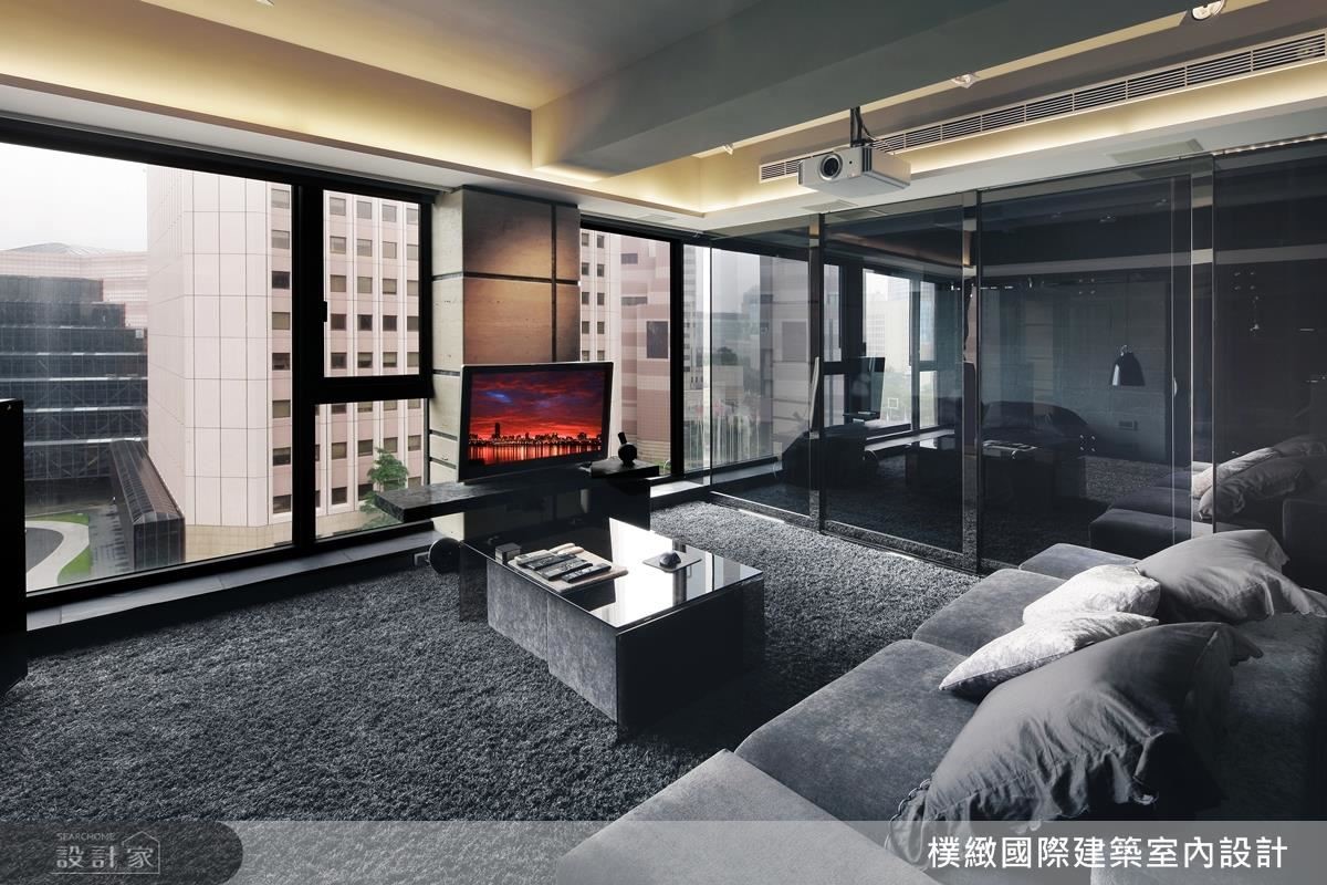整體而言,屋主期待居住的空間,偏深黑冷調的個性。但家是身心安頓之所,設計師仍希望注入些許的溫馨感,讓空間不會太冷;因此用灰色的軟件淡化整體的黯黑和玻璃的冷冽,進而讓空間的表情更富於層次,好比灰色的沙發、柔軟的地毯、灰黑的板岩、暖色系的投射燈、大地色的牆柱等。