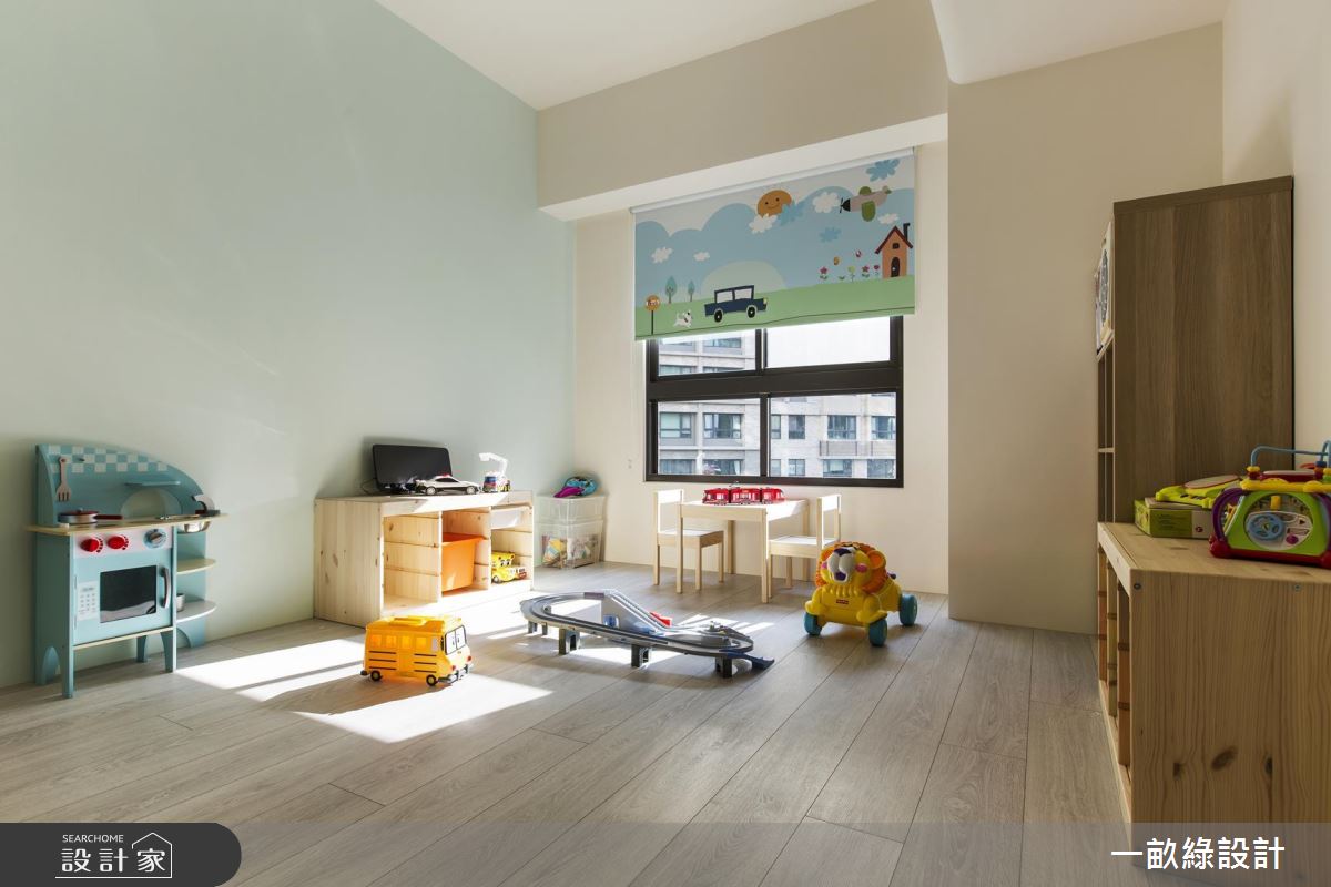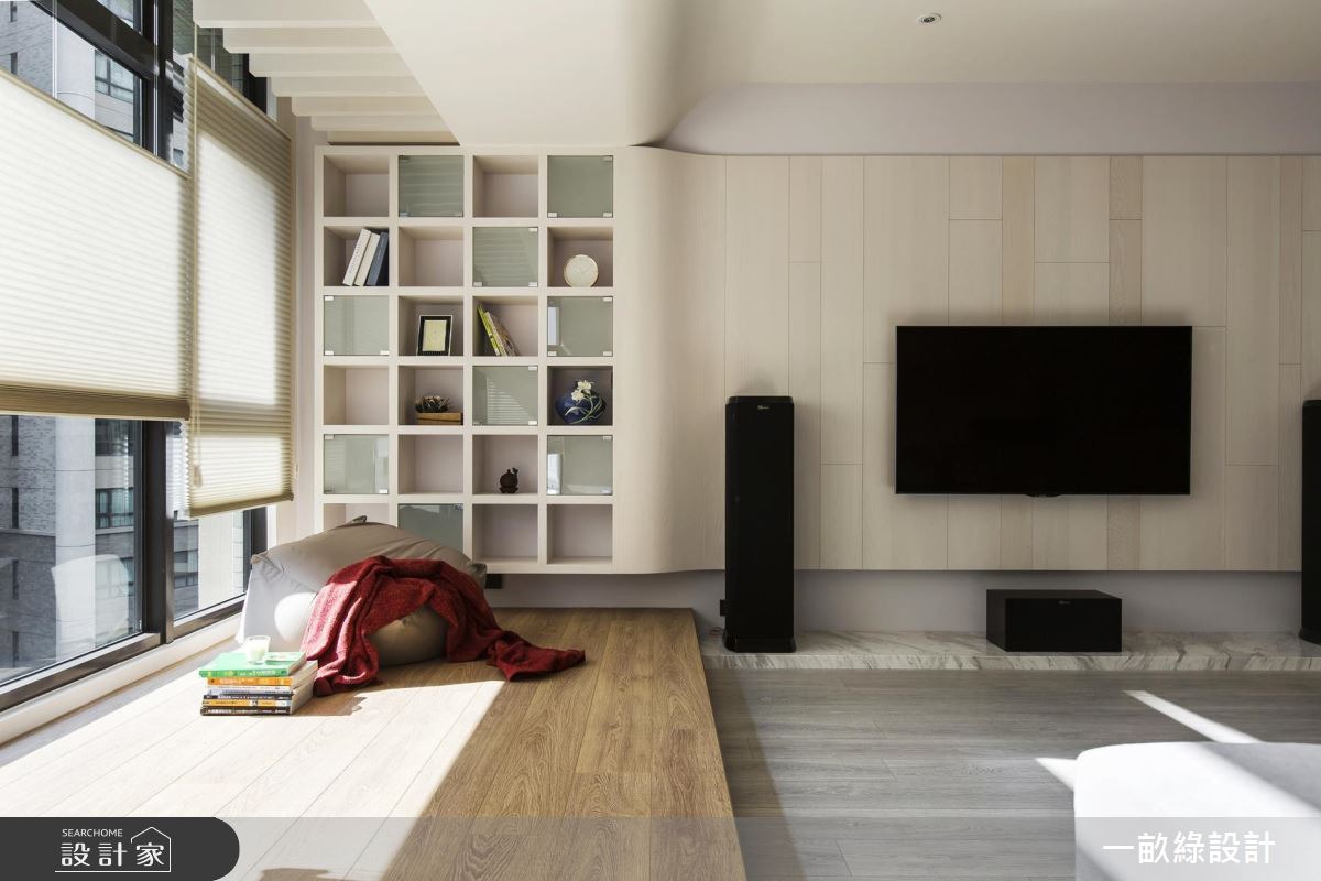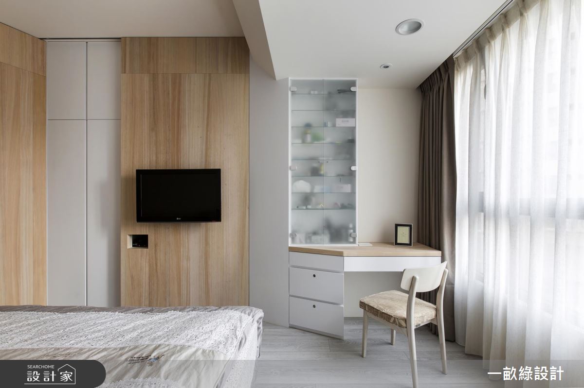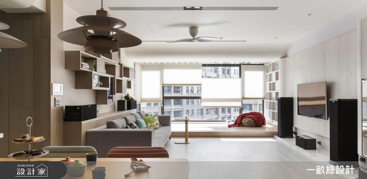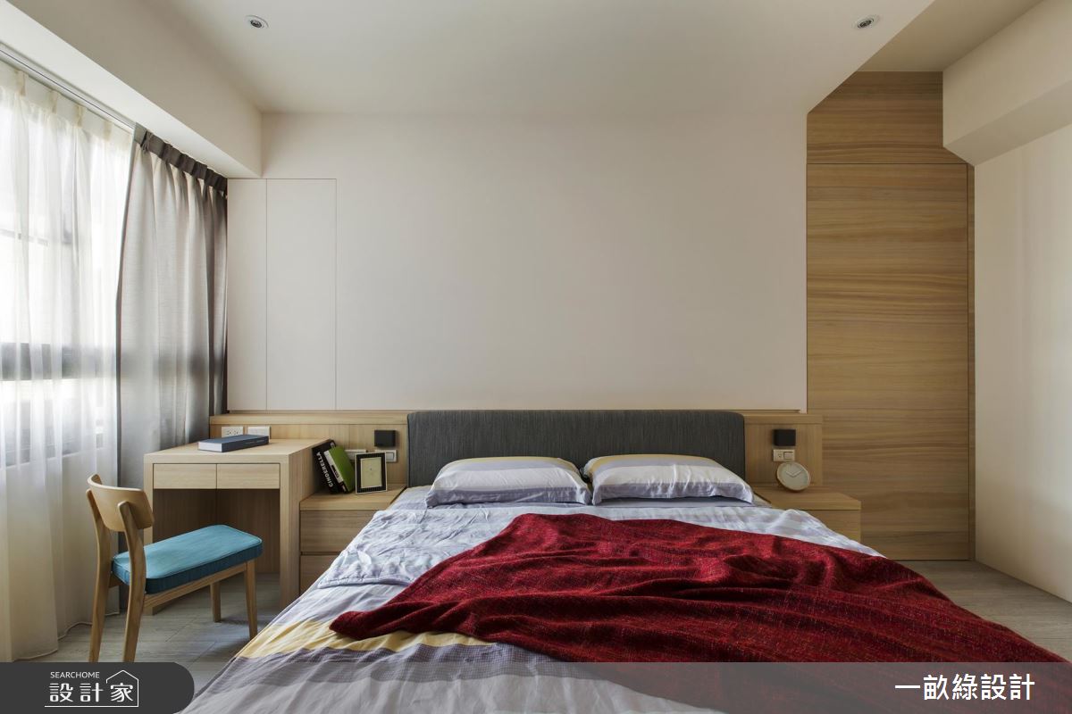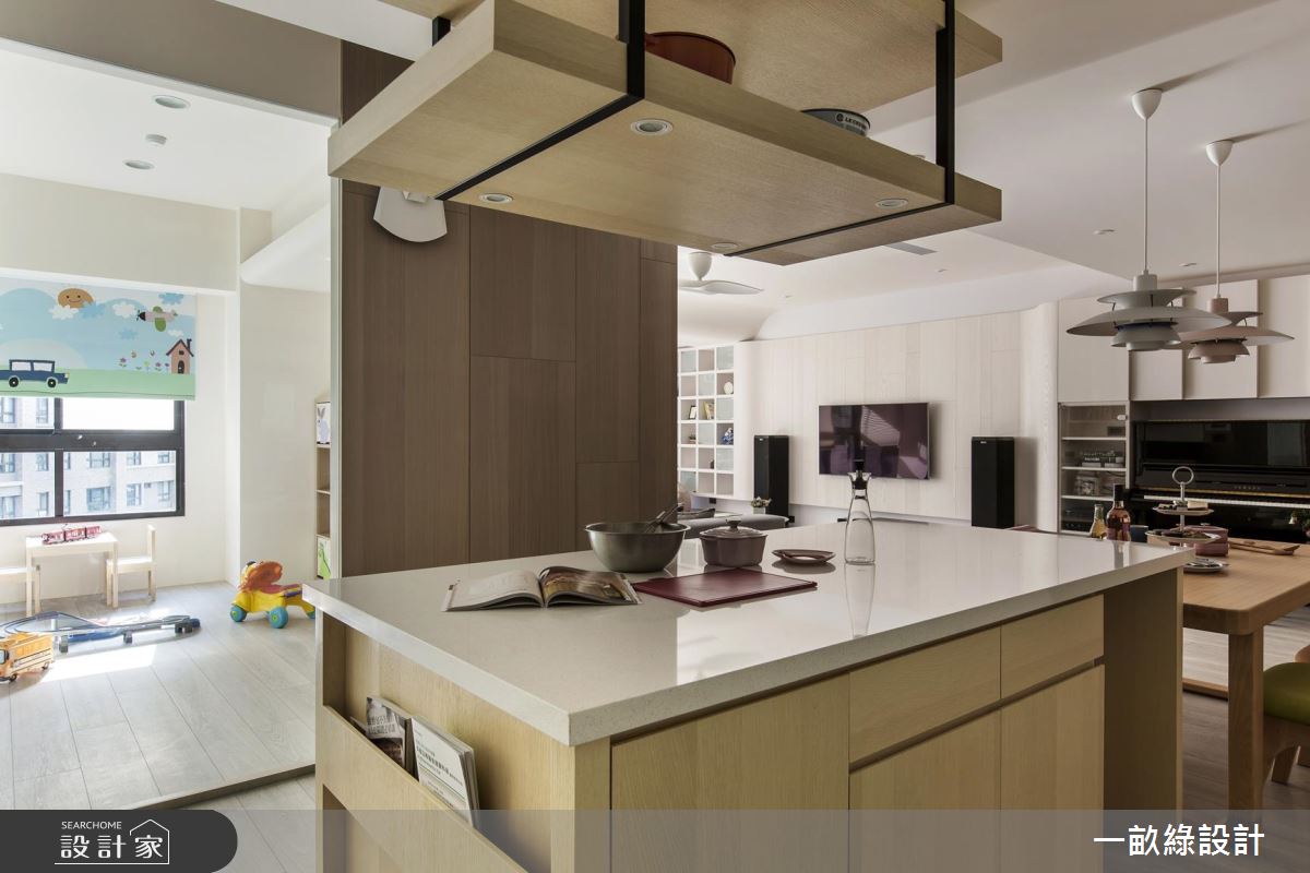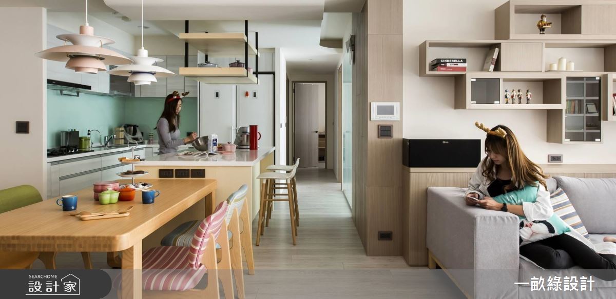 以療癒、溫潤的淺木色調為基礎,搭配柔潤的弧形線條,使天花板樑體的稜角轉換更加溫和不壓迫,落地窗邊特別將木地板架高,隨時可以慵懶舒適地享受陽光,也可以是親子間一起閱讀、相處的休閒空間。餐廚中島採用開放式設計,除了用餐區外,也延伸吧檯座位,即使招待客人也不擔心位置不夠。至於餐廚的收納設計,設計師以懸吊式層架增設廚具、餐具的收納空間,餐桌旁也貼心地設置插座,使用廚房電器時也會更加輕鬆和方便。臥室延續了清爽的木質調性,搭配純白色系的鮮明對比,顯得清新而純淨,設計師更賦予了大量的收納設計,包含衣櫃、梳妝檯,讓日常衣物、保養品都能有專屬的收納空間。