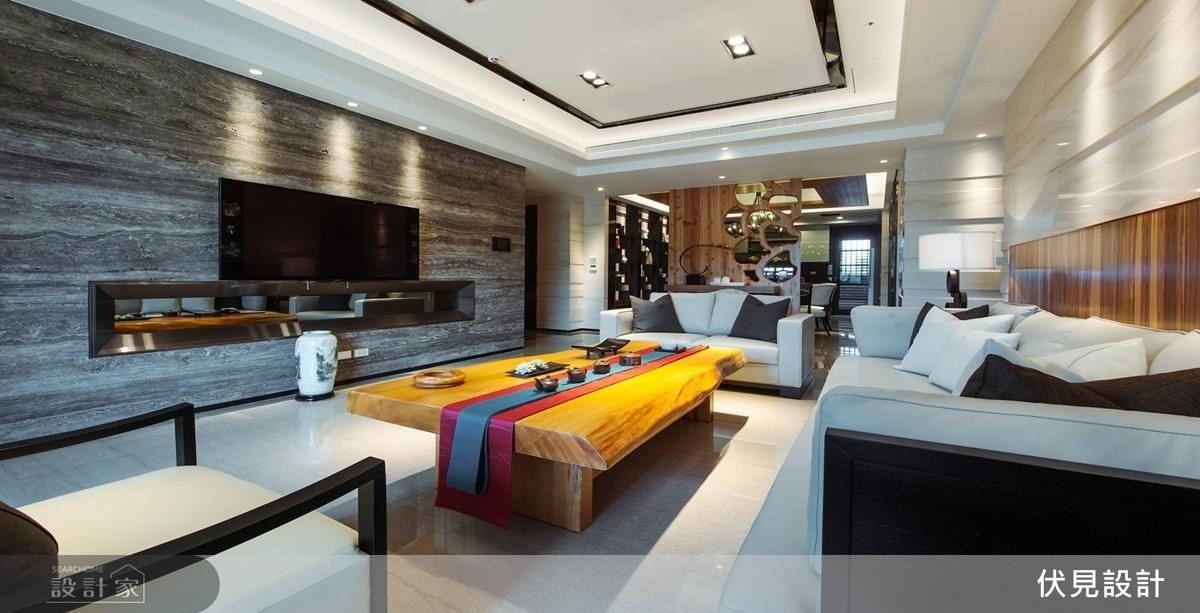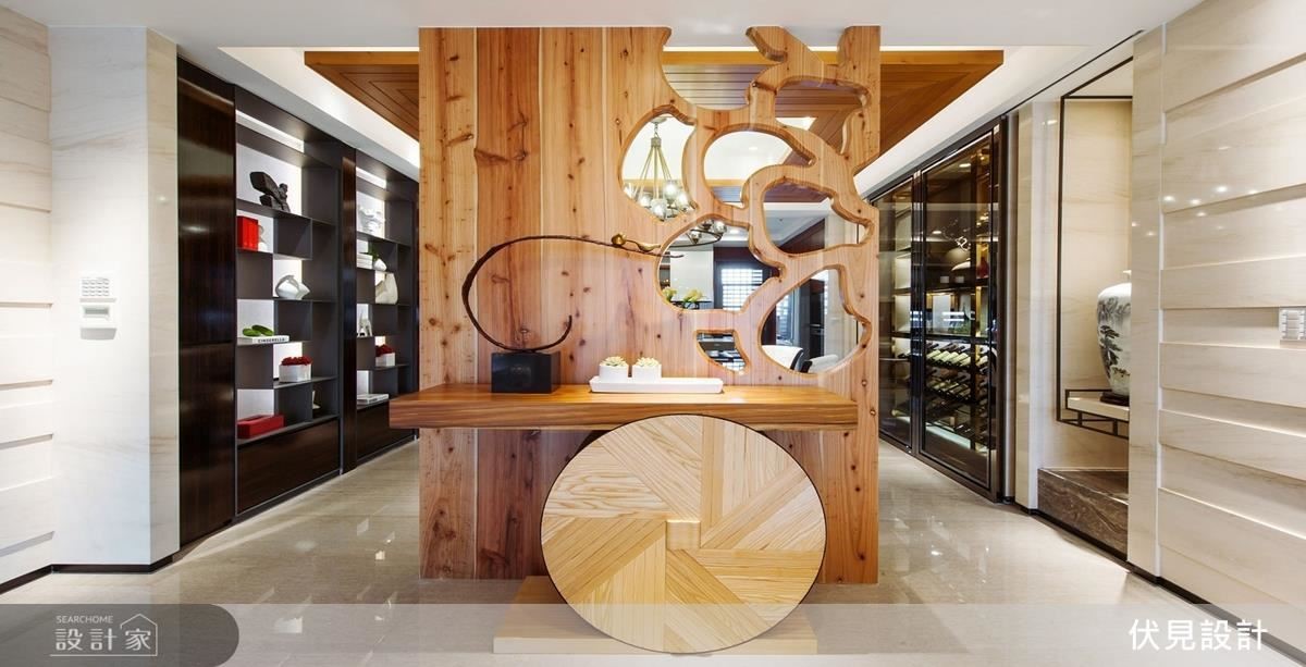 事業有成的男主人,個性成熟內斂而且略有威嚴,雖然話不多,但對居家的設計很有想法而且需求表達十分清晰,除了有品茗藏酒的嗜好外,更特別鍾情東方味的藝術精品,希望居家情境能內斂有品味,有適當的場合設計可以展示自己的精心收藏;也重視風水考量,以及招待朋友的體面大氣。伏見設計團隊精準掌握男主人的性格特色與希望家人常相聚交流的期盼,將公私領域串在同一軸線上,私領域則分列兩側,三個小孩的房間規劃在一起,主臥則在另一邊,藉由中間客餐廳的開放領域,讓一家人的情感甜蜜交織。