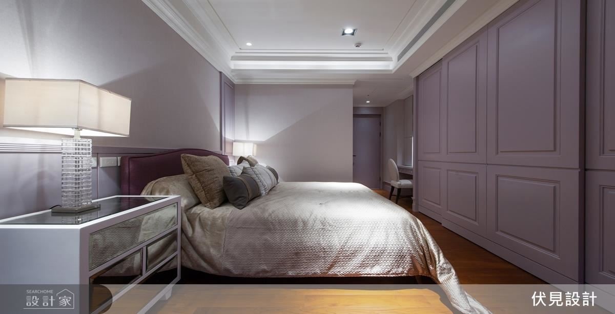 主臥的主導權則回到有著浪漫因子的女主人身上,薰衣草紫的色系,優雅的線板與對稱的檯燈,讓私人天地洋溢溫馨迷人的氛圍。線板門片除了衣櫃外,其實隱藏了一間更衣室,滿足收納需求,也設置了梳妝檯,是獨屬於女主人的空間。