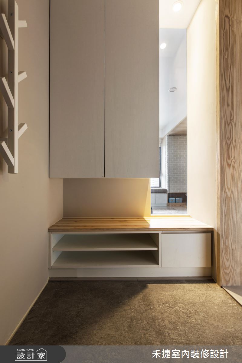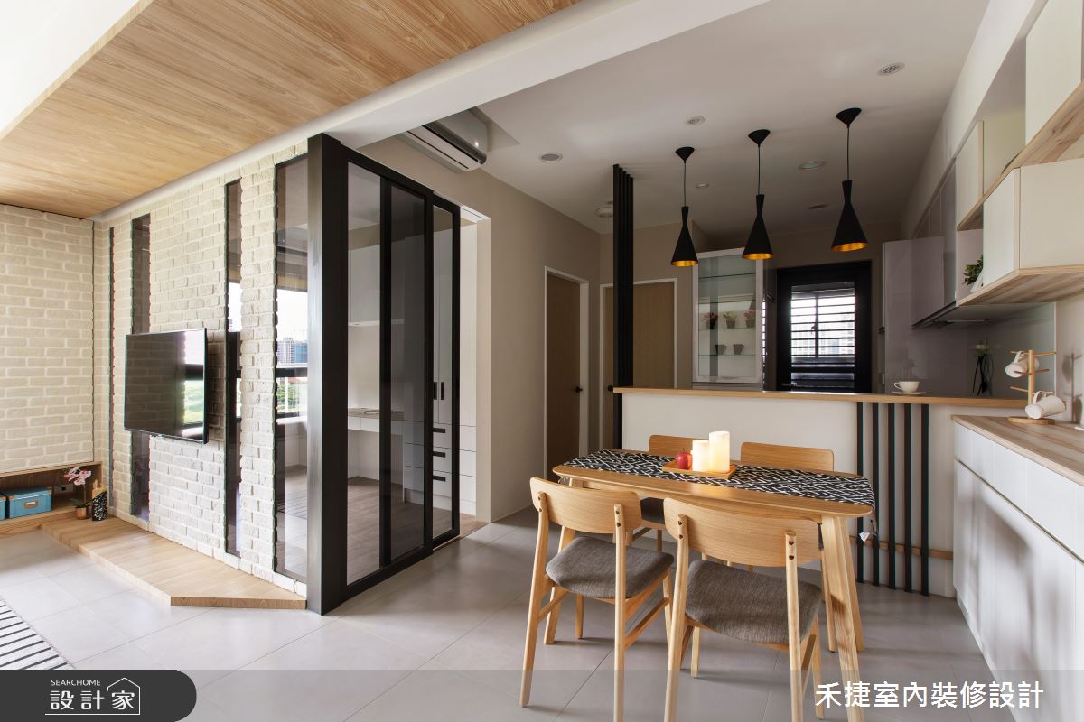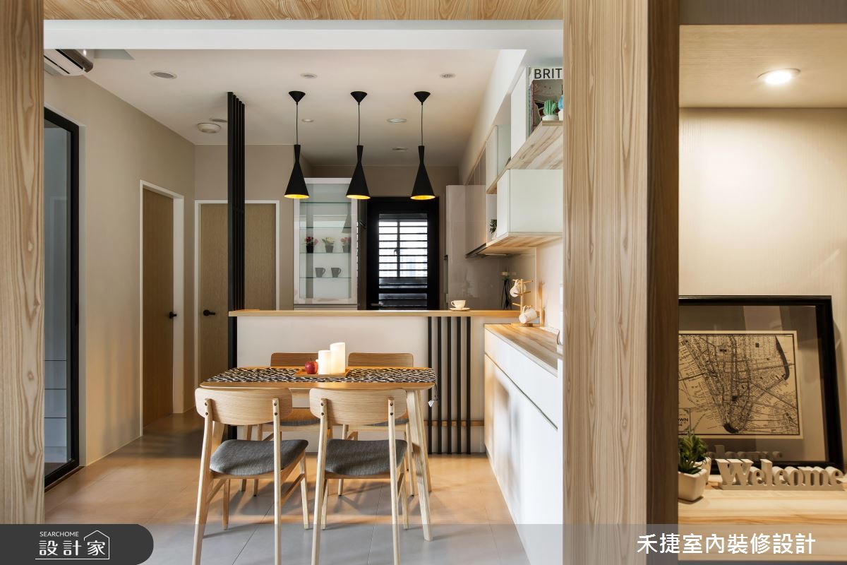 甫入玄關,設計師即加入懸空櫃體與透空設定,網羅輕盈視感及實用機能,並在地坪做出異材質差異,型塑明確的落塵範圍:廳區則避免紛擾色調,以柔和色彩貫穿基底,搭配溫潤木質、天然文化石等,凝聚自然人文的氣息,同時,藉由開放式設計串聯客餐廳,以木作包覆橫樑串接場域,打造敞朗無障礙的公共格局;電視牆捨棄了視聽櫃的存在,保留牆面完整性,刻意做出局部透空,形成客廳、書房之間的關聯,引領光線和視線的密切流動;書房內則採用深色玻璃拉門,敞開時可與餐廚領域產生互動,緊閉時兼具隱私性與透光度,並在室內鋪述溫暖的木地坪,暗示空間屬性的轉換,呈現宜人舒適的居室溫度!