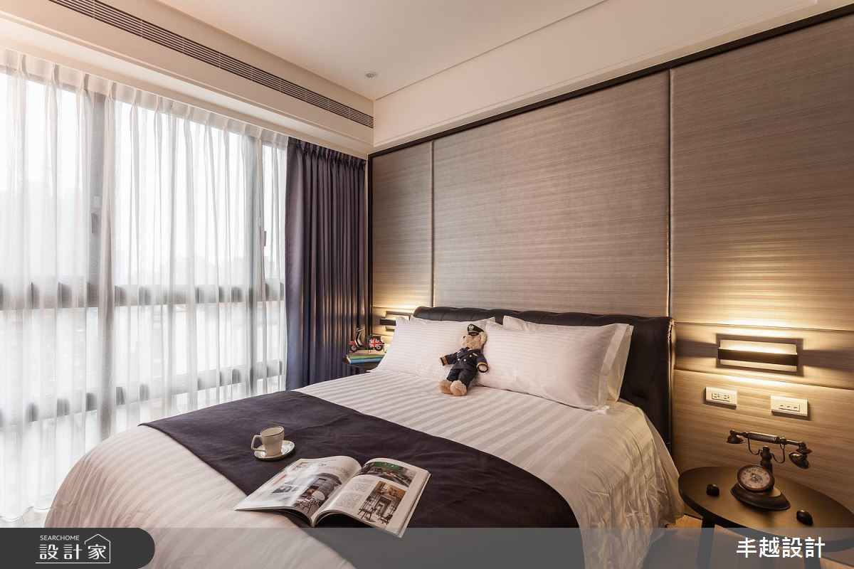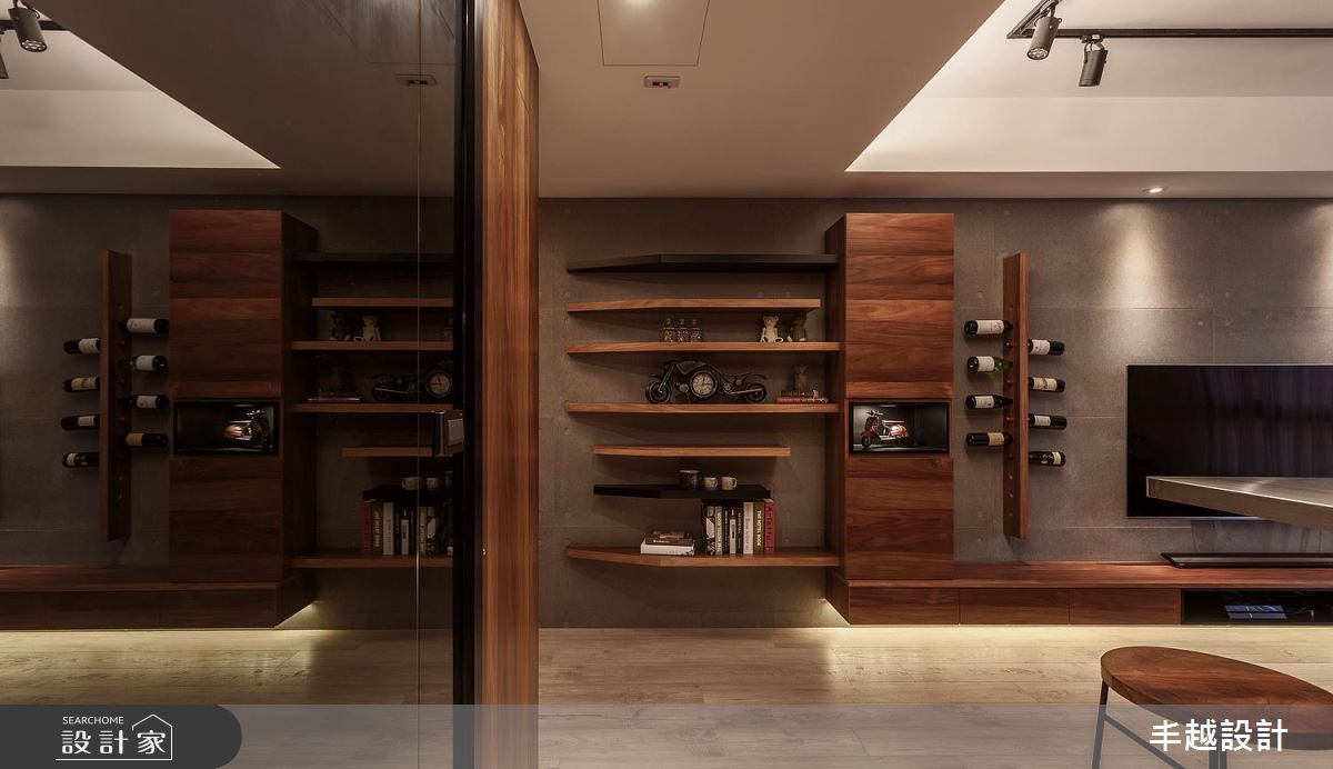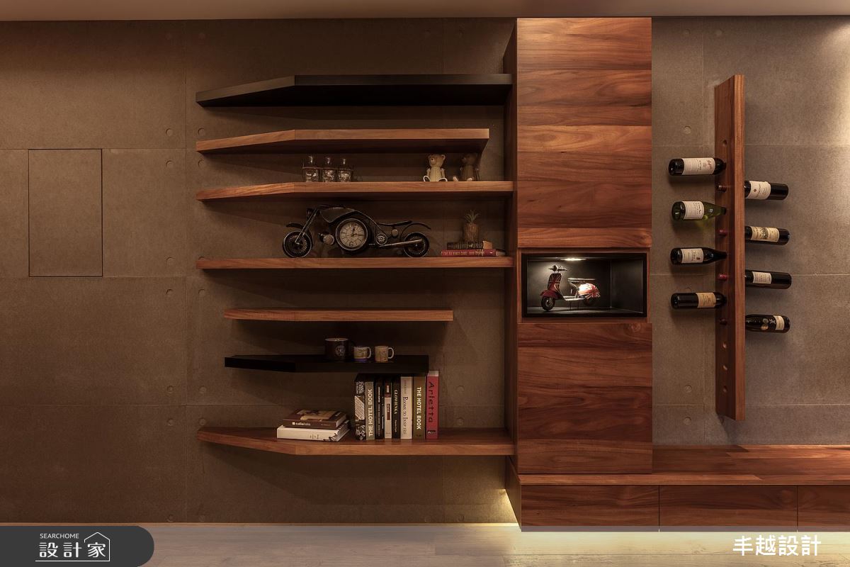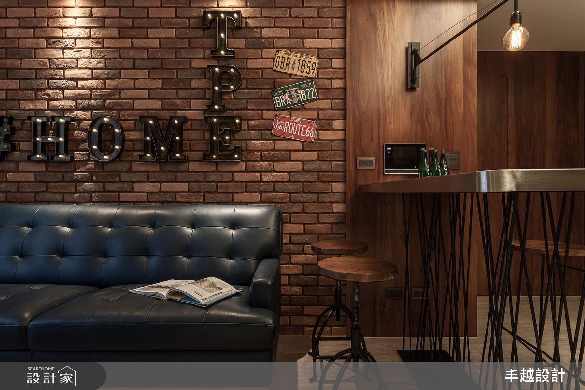 設計師利用開放式手法,將公共領域的尺度放大,並鋪陳暖意木地板,在紅磚沙發牆妝點英文字母裝飾,於電視牆配置開放式藏酒收納,展演單身者的自由奔放;客廳旁規劃為簡易餐區,以長型桌體攬納餐桌和吧檯機能,透過俐落的桌椅腳搭配金屬檯面、造型壁燈,成就極具個性的用餐領地,讓屋主可在此工作、餐飲或小酌,一側立面則加入大面積鏡面,讓空間感獲得延伸,並反射燈光、獲得提點光線亮度的作用;寢臥內則回歸舒適,以窗戶借引採光、營造清爽明亮的氛圍,再以輕質皮革包覆床頭,顯現私領域的明朗特質!