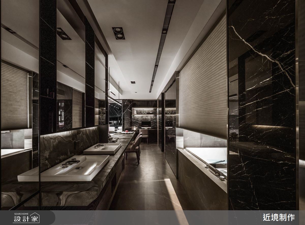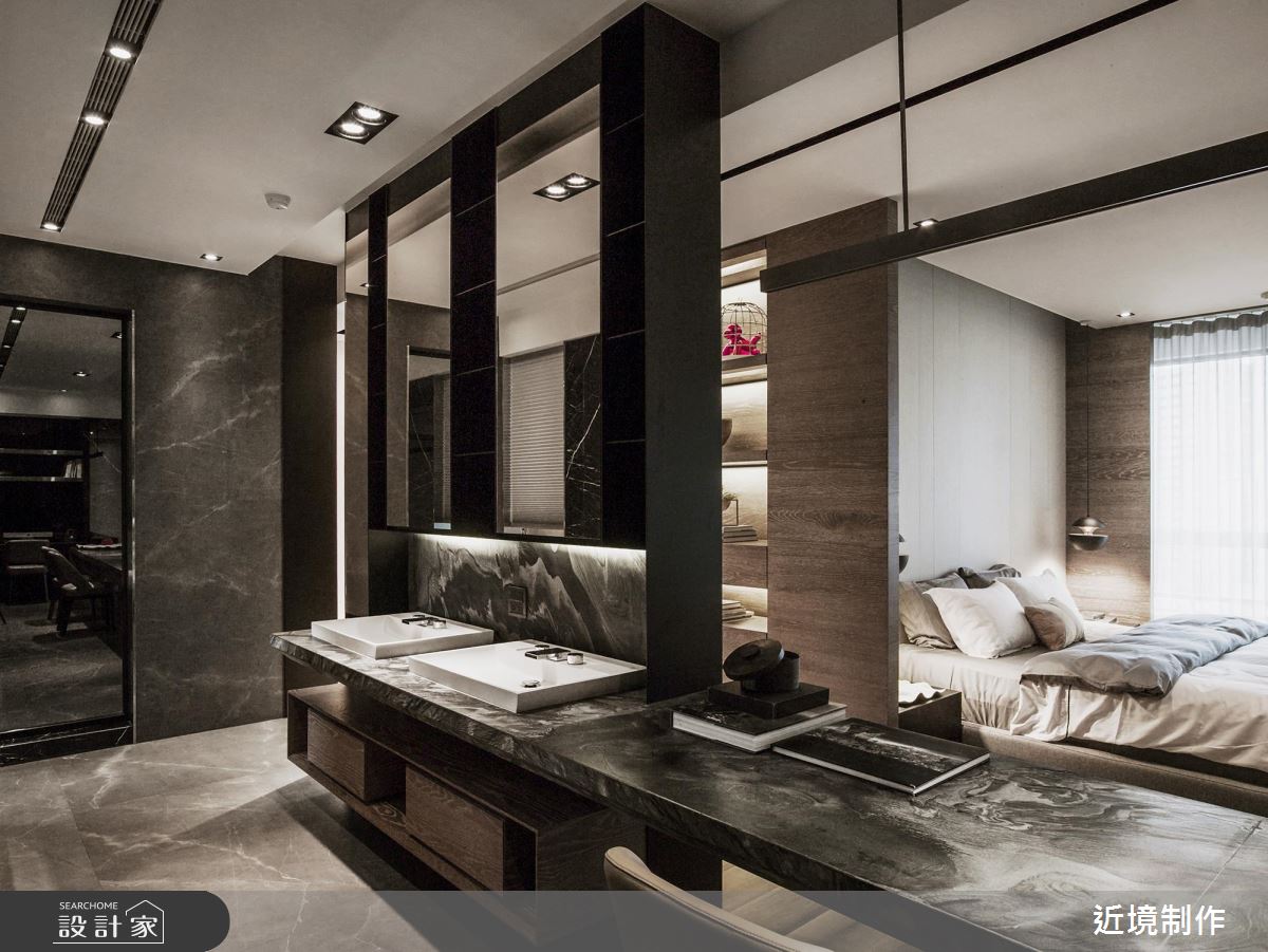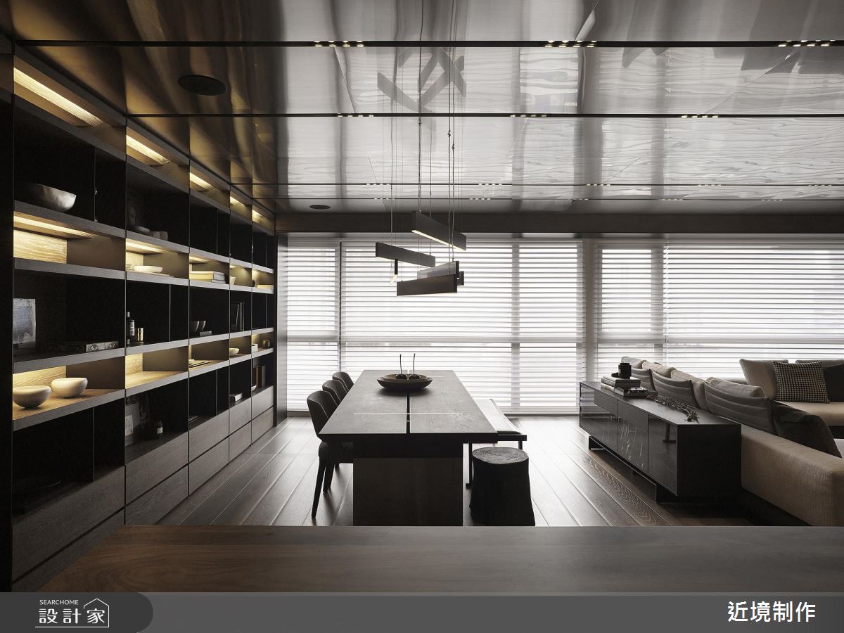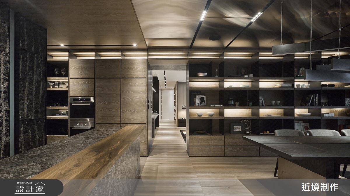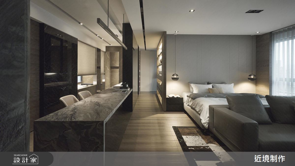 場域分配上,採以合理的量體劃分,打造自然順暢的空間線條,展現通透並具連貫性的佈局,吧檯則透過大面積石材營造磅礡畫面,搭襯不鏽鋼塊體與天花的呼應,呈現異材質的驚喜對比,同時加入溫暖木材挹注舒適氛圍,巧妙藉由不同溫度的材質、量體的錯落鋪排,型塑視覺上的未來感;並給予深具層次感的燈光規劃,讓燈光形成延伸脈絡,由客廳串接至飯廳,引申出漸進的流動感;步入主臥,藉著多功能長桌的配置,讓主副場域屬性分明但保有聯繫,除了石材、金屬、木質之餘,亦加入淨透鏡面的鋪敘,獨創私領域中的多元風貌!