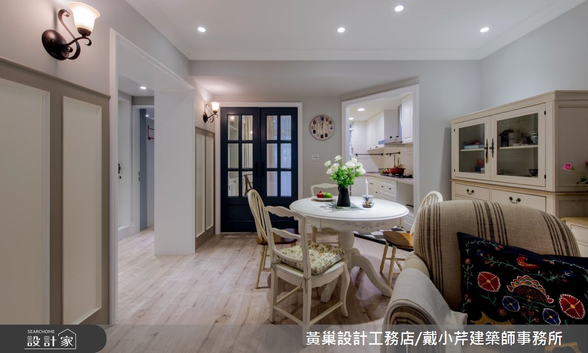 甫入門,即在玄關刻意拼貼復古地磚,軸線盡頭則安置一座深藍色烤漆鞋櫃,凝聚略帶鄉村的質樸況味;公領域選用大面積的淺色木紋地坪,並在牆面佐以簡約線板框架,勾勒清爽無壓的場域印象,同時搭配跳色的抱枕、地毯、軟件等,創造空間的活潑律動感;餐廳位置也經過深思熟慮,考量到廚房、書房、廊道的開口方位,將餐桌作為核心,向周遭發展出流暢的起居動線,且營造光線的自由穿梭;書房門片則同樣揮灑迷人的深藍色調,藉此呼應玄關櫃用色,內部規劃半開放書櫃,搭配局部的灰色文化石處理,奠定此處不受干擾的沉靜氛圍!