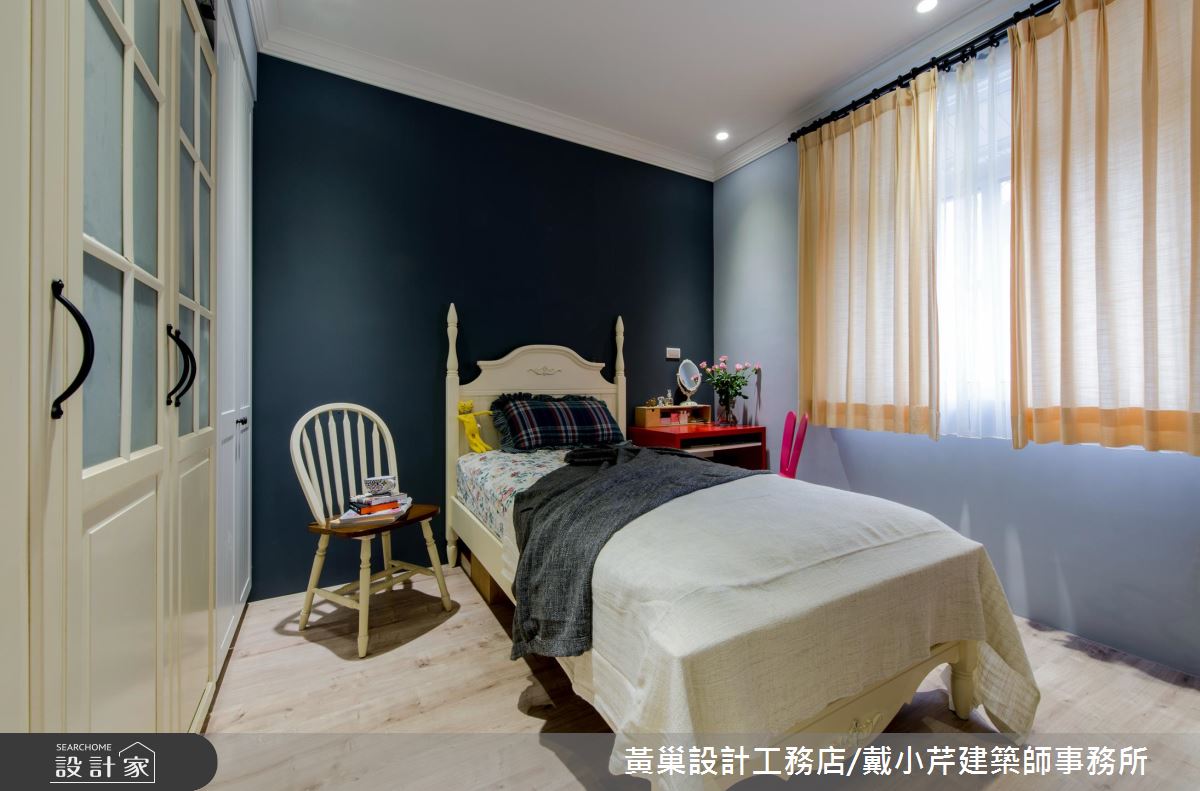 臥房內,以深藍色定調床頭主牆,對照搶眼的紅色書櫃,在淺色基底之中繽紛卻不顯雜亂,反倒跳出鮮明復古之美!