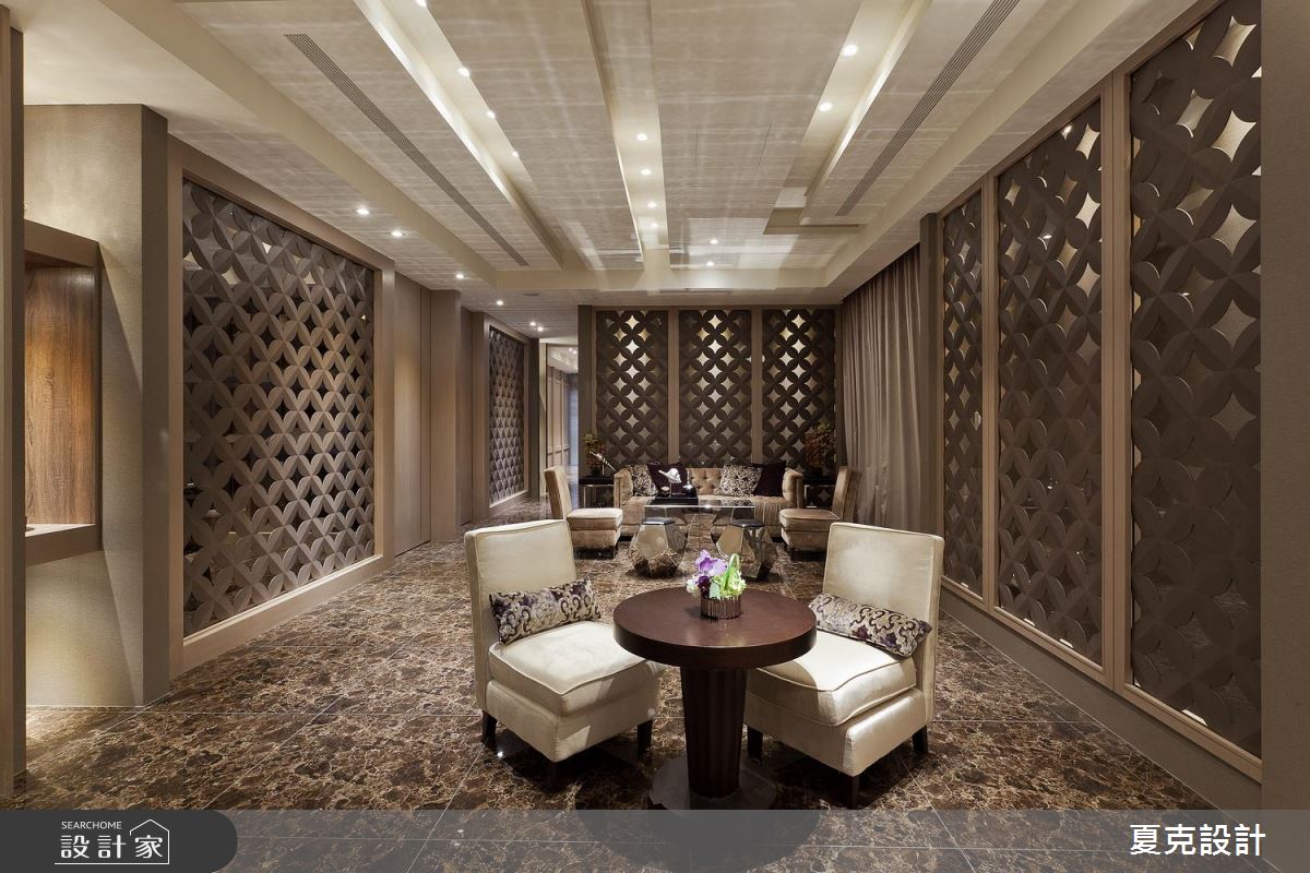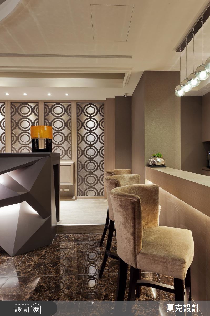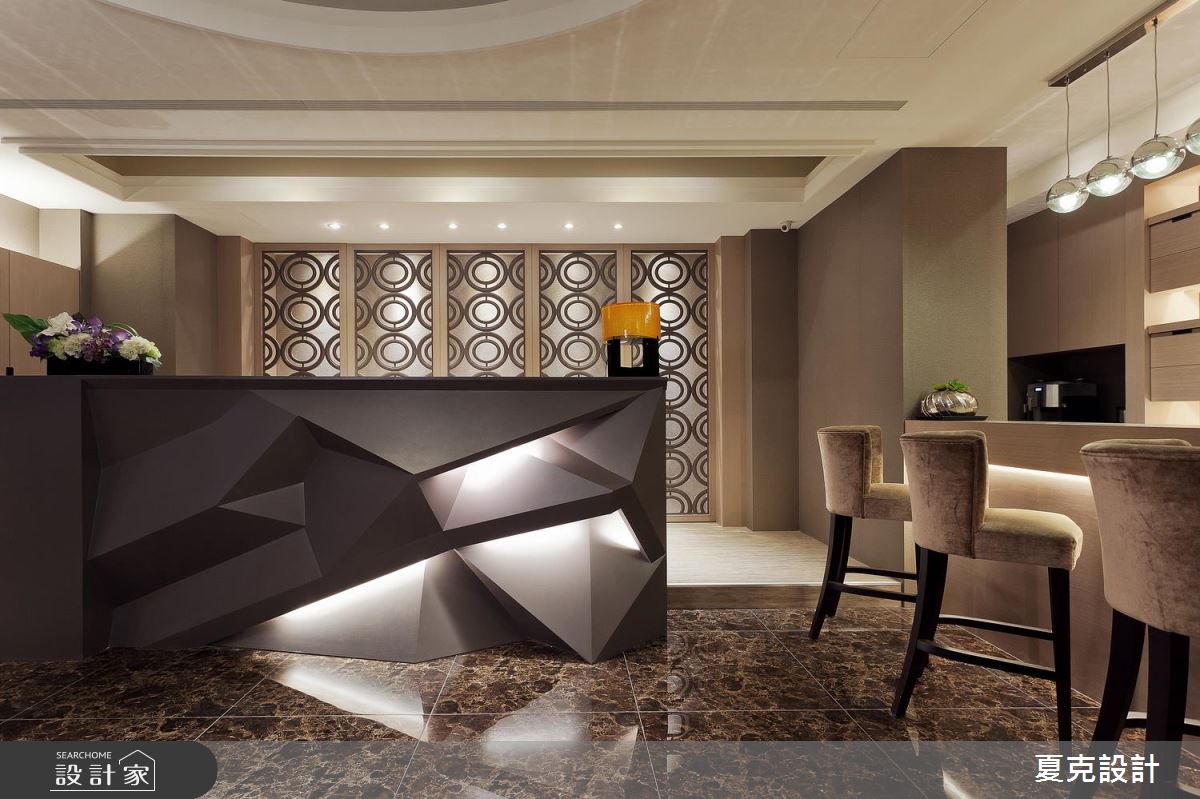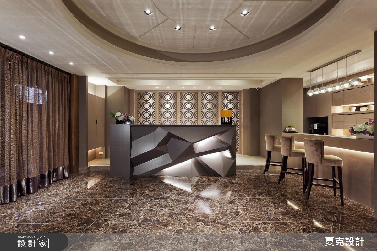 天花呈現劇場式的挑高格局,搭配間接燈光的妝點投射,演繹華麗豐美的空間意境,同時突破一般櫃檯造型,加入仿製鑽石切割面立體造型,形成前衛而聚焦的醒目量體,一旁吧檯則兼顧招待機能,使賓客可在此小酌歡聚;開放式的接待區不僅配置TV簡報功能,亦透過窗花語彙塑造立面,帶出雅致的立面表情,兼顧專業功能與美型視野,同時考量到商談的隱私性,另外備有包廂式招待區域,運用塊體堆疊牆面,在幾何建築的意涵之中,圍塑出深具層次變化的表情!