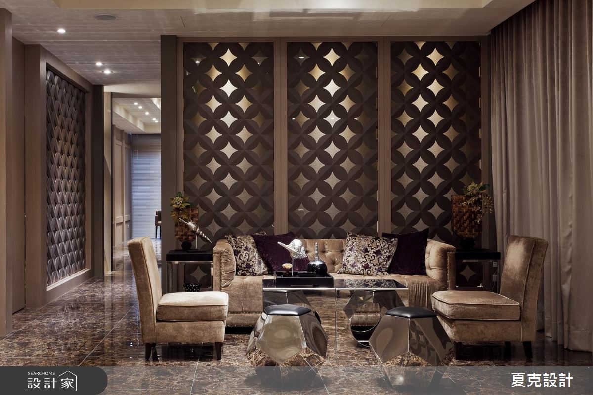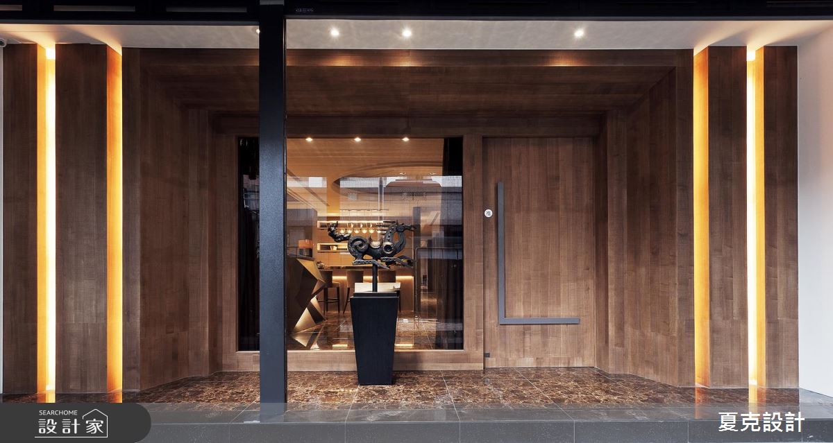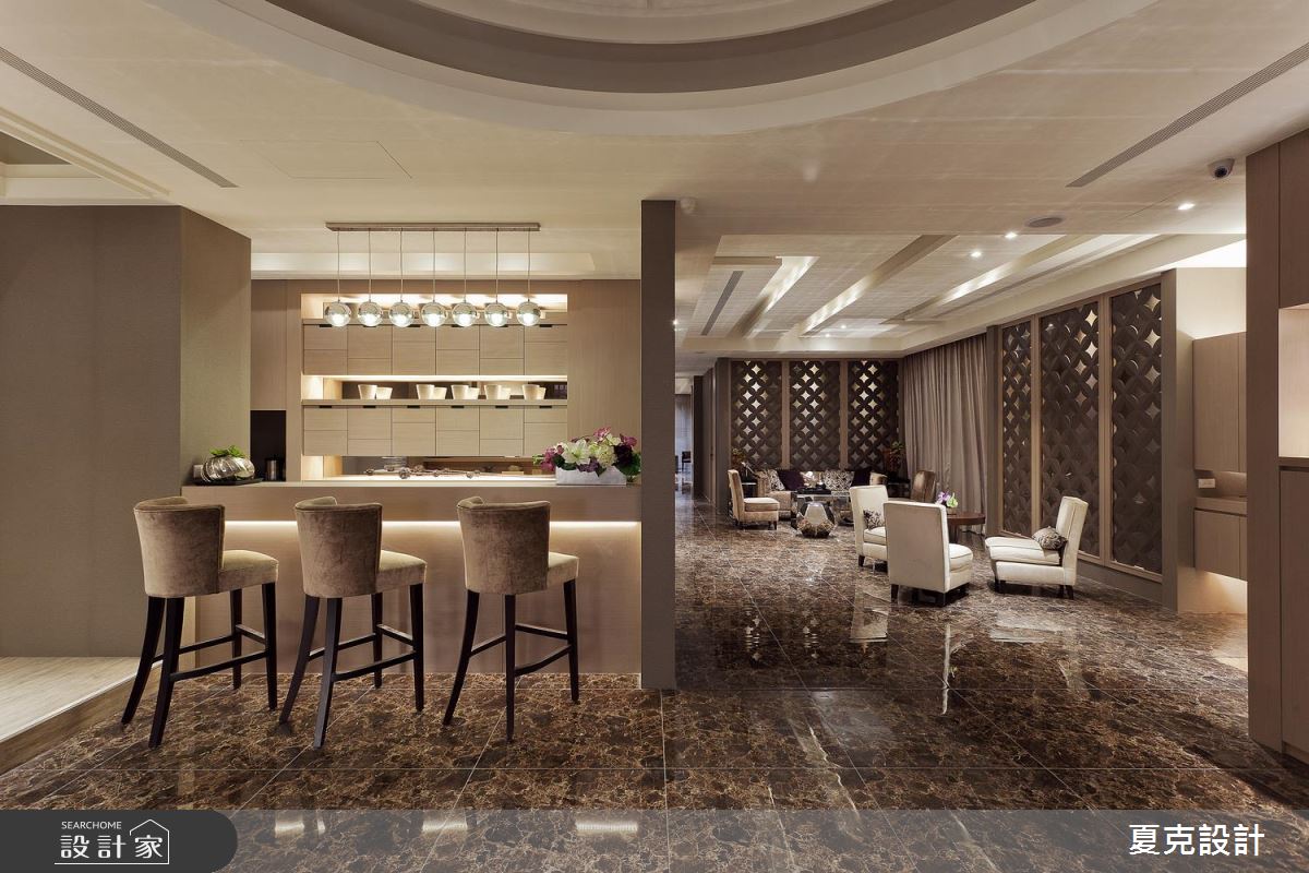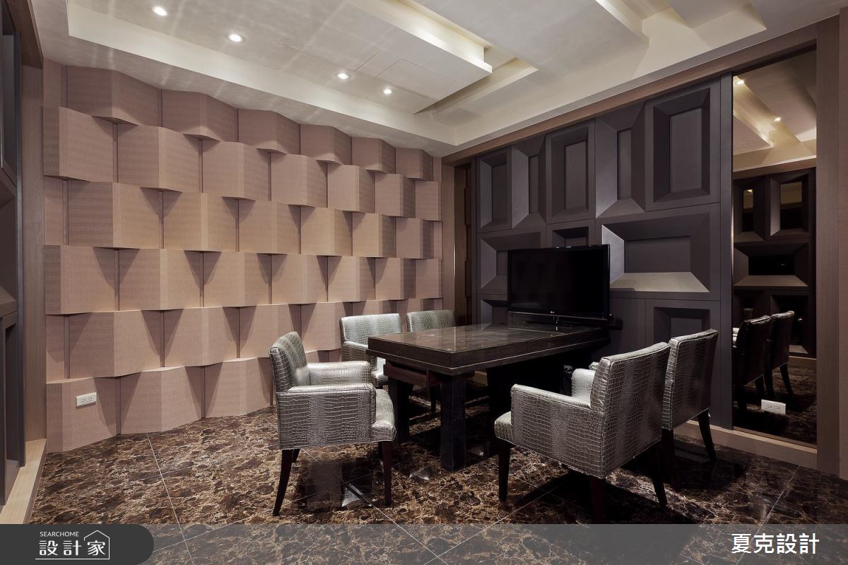 天花呈現劇場式的挑高格局,搭配間接燈光的妝點投射,演繹華麗豐美的空間意境,同時突破一般櫃檯造型,加入仿製鑽石切割面立體造型,形成前衛而聚焦的醒目量體,一旁吧檯則兼顧招待機能,使賓客可在此小酌歡聚;開放式的接待區不僅配置TV簡報功能,亦透過窗花語彙塑造立面,帶出雅致的立面表情,兼顧專業功能與美型視野,同時考量到商談的隱私性,另外備有包廂式招待區域,運用塊體堆疊牆面,在幾何建築的意涵之中,圍塑出深具層次變化的表情!