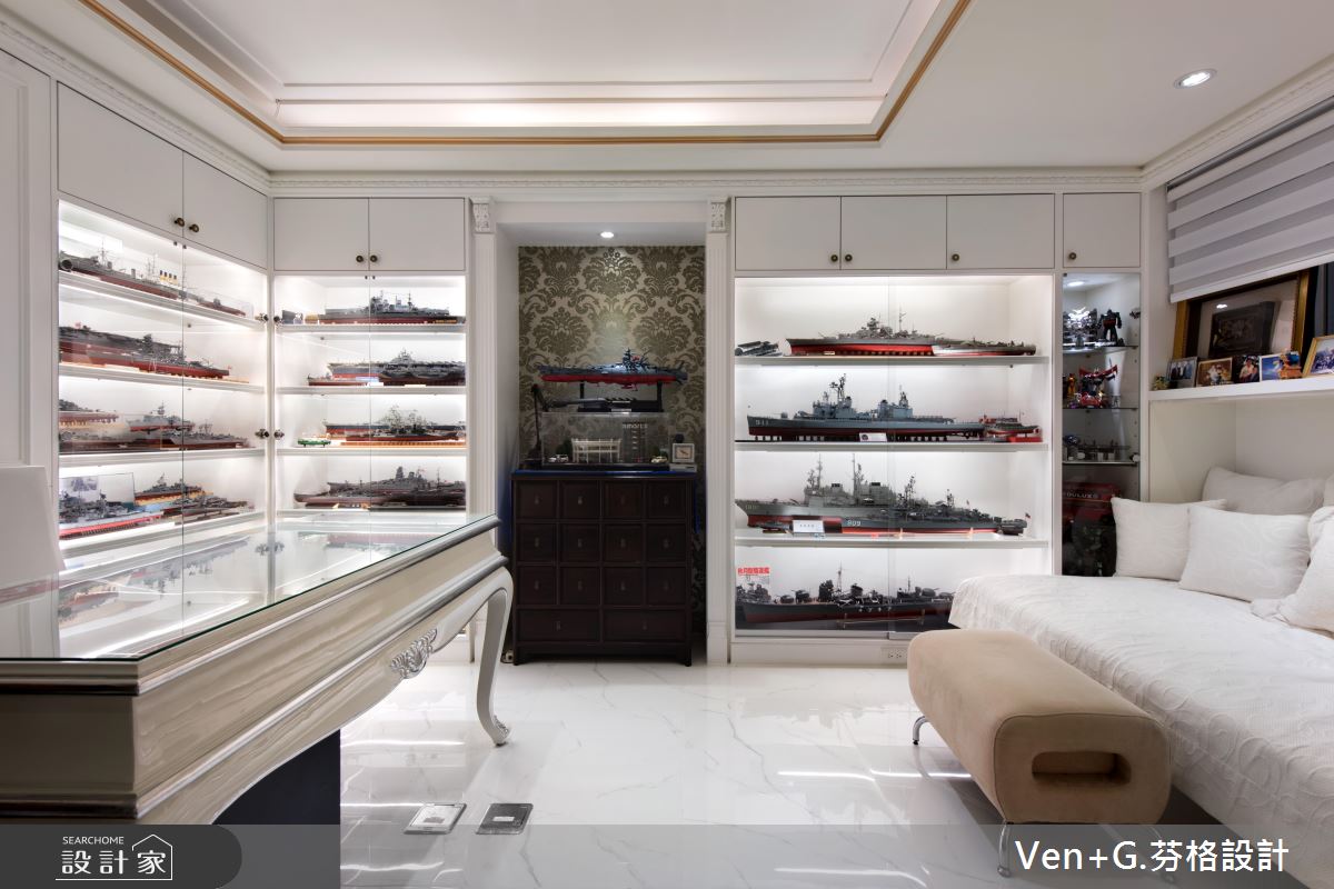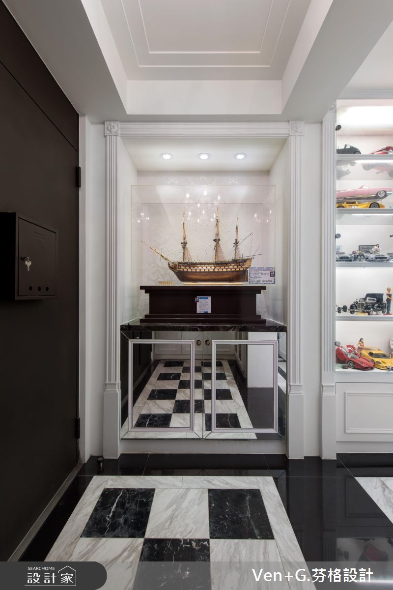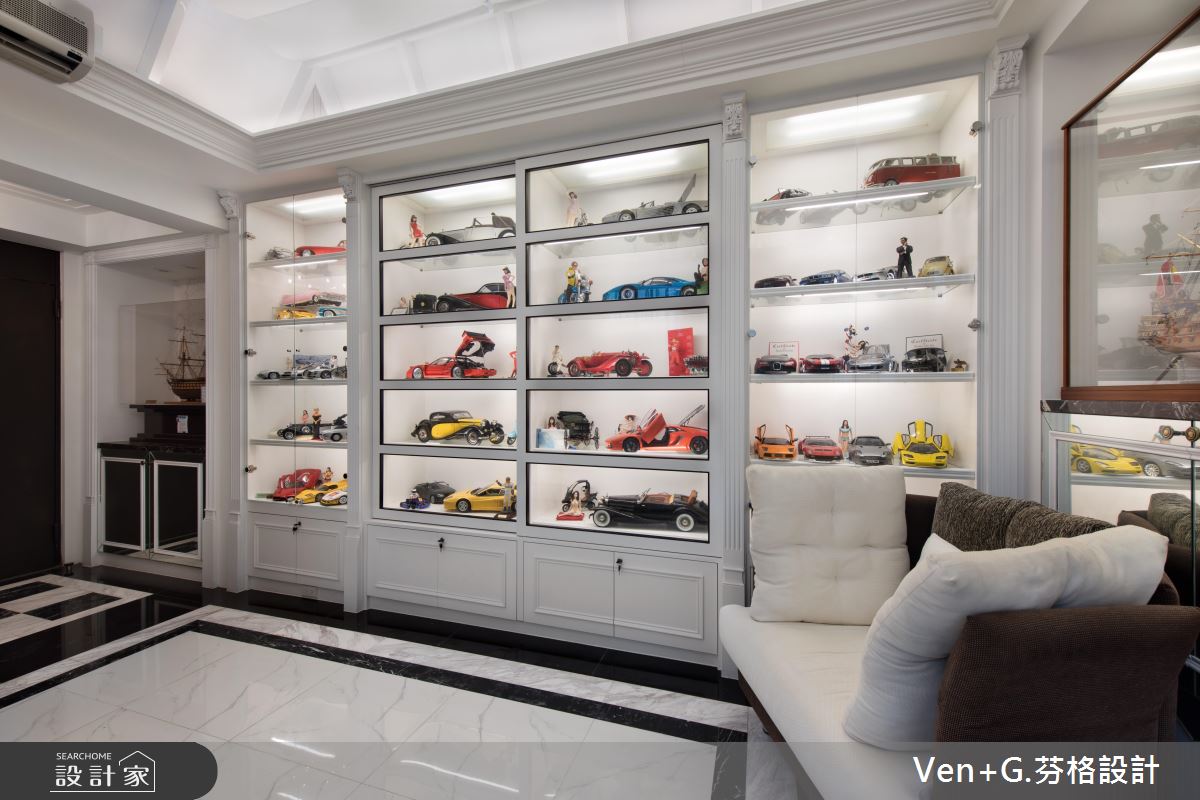 入口玄關區,運用黑白色系結合線板語彙、搭配鏡櫃與展示物,凝聚第一眼的奢華印象,轉折進入後,可見到猶如櫥窗般的淨透收納櫃,讓收藏物形成空間焦點,引述著生活的趣味;循著踏階來到公共場域,則藉由線板、家具、燈飾等框造每一幅如畫場景,同時讓窗面結合風雅窗簾,在優美布藝中引述新古典的雍容大器,而不所無在的珍藏飾品,也輕巧陳設於櫃體之中,達到畫龍點睛的效果;起居室,除了大量的公仔模型裝飾,也在壁面妝點細緻的古典圖騰,並搭襯帶有東方古韻的座椅,將多種元素無違和相容於一室,成就屋主的獨享天地;臥房內,融入浪漫紫色輔以銀色系家具,搭配溫婉的雕花流線、鮮明獨特的床頭表情等,以大膽但不突兀的設計,詮釋新古典特有的空間魅力!