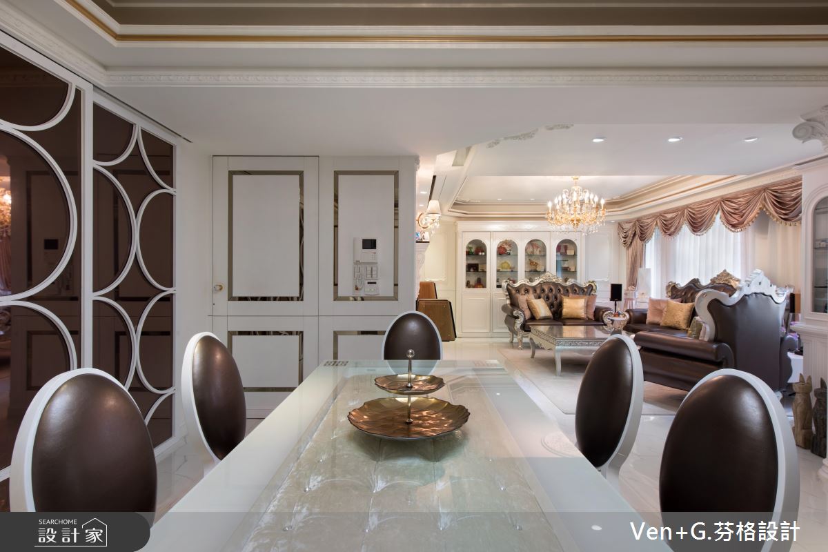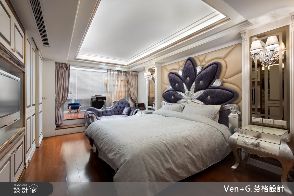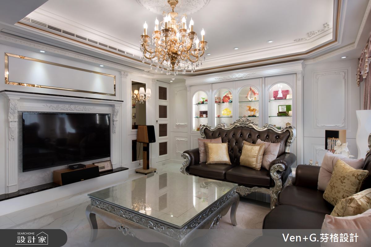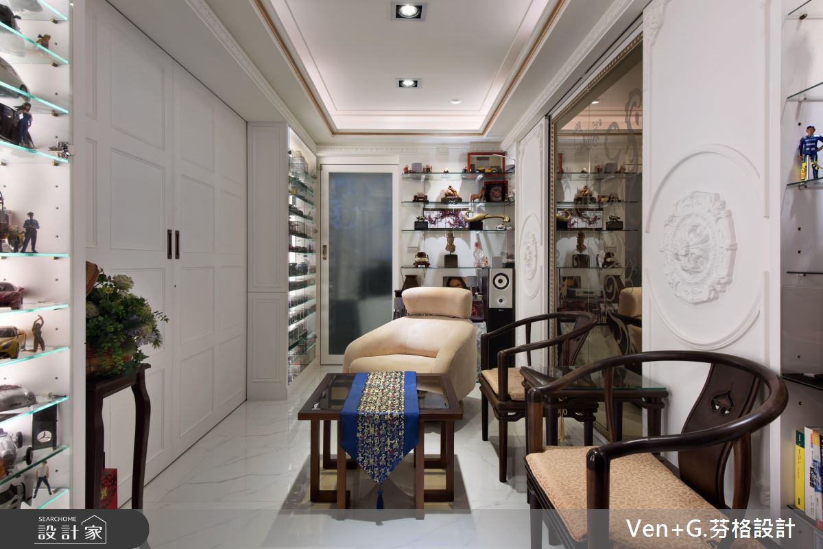入口玄關區,運用黑白色系結合線板語彙、搭配鏡櫃與展示物,凝聚第一眼的奢華印象,轉折進入後,可見到猶如櫥窗般的淨透收納櫃,讓收藏物形成空間焦點,引述著生活的趣味;循著踏階來到公共場域,則藉由線板、家具、燈飾等框造每一幅如畫場景,同時讓窗面結合風雅窗簾,在優美布藝中引述新古典的雍容大器,而不所無在的珍藏飾品,也輕巧陳設於櫃體之中,達到畫龍點睛的效果;起居室,除了大量的公仔模型裝飾,也在壁面妝點細緻的古典圖騰,並搭襯帶有東方古韻的座椅,將多種元素無違和相容於一室,成就屋主的獨享天地;臥房內,融入浪漫紫色輔以銀色系家具,搭配溫婉的雕花流線、鮮明獨特的床頭表情等,以大膽但不突兀的設計,詮釋新古典特有的空間魅力!