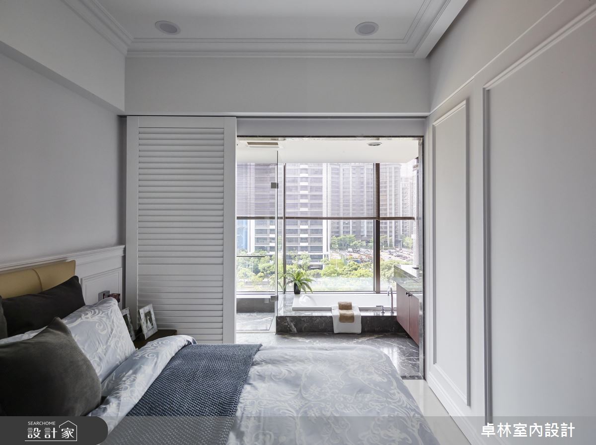 推開寢臥內的百葉門扉,可見到充滿驚喜的衛浴場景,設計師規劃有如飯店般的降板浴缸,不僅選用高級石材,還納入美好的視野景觀,替屋主打造出專屬的五星級盥洗時光!