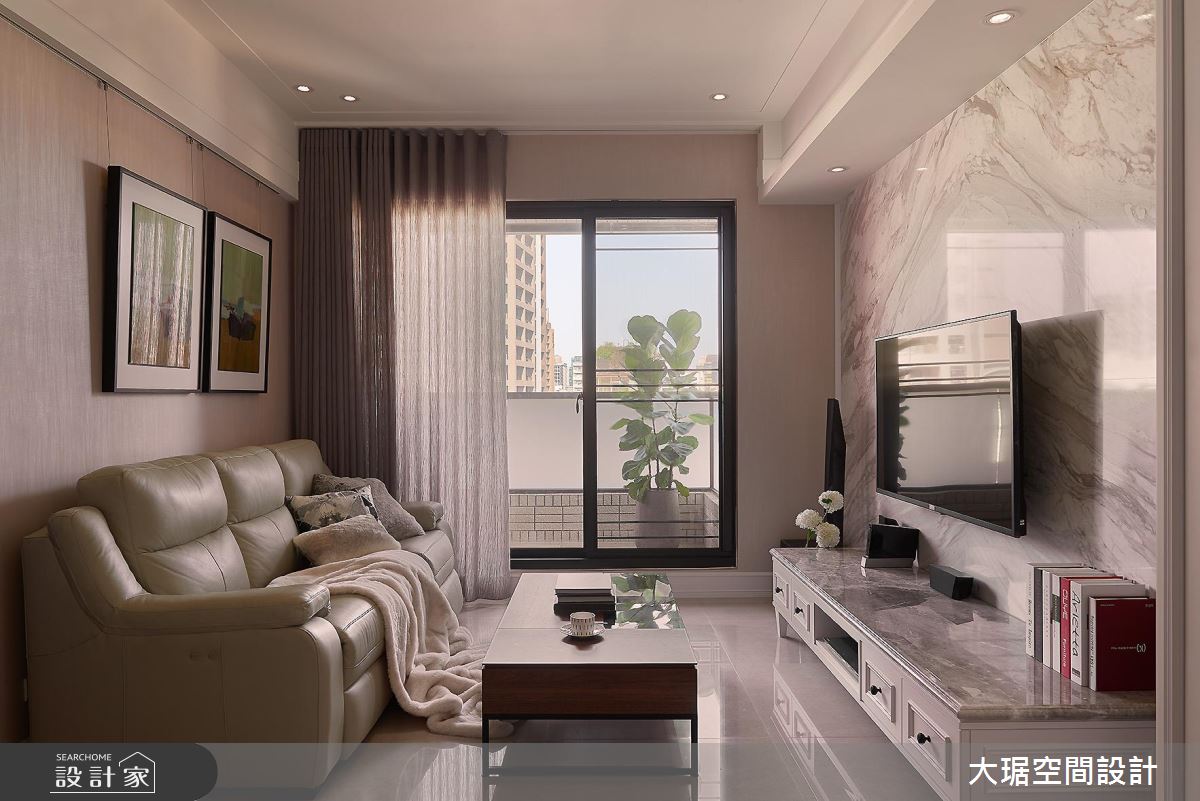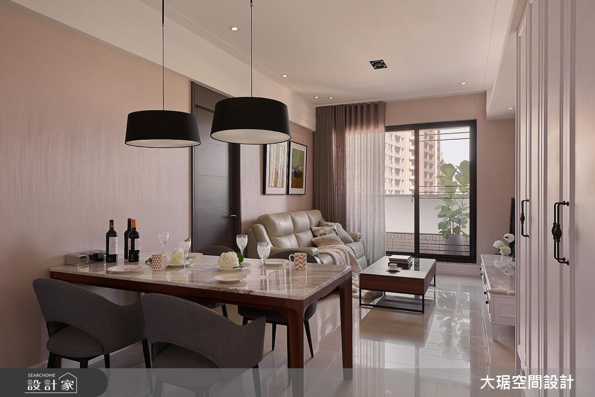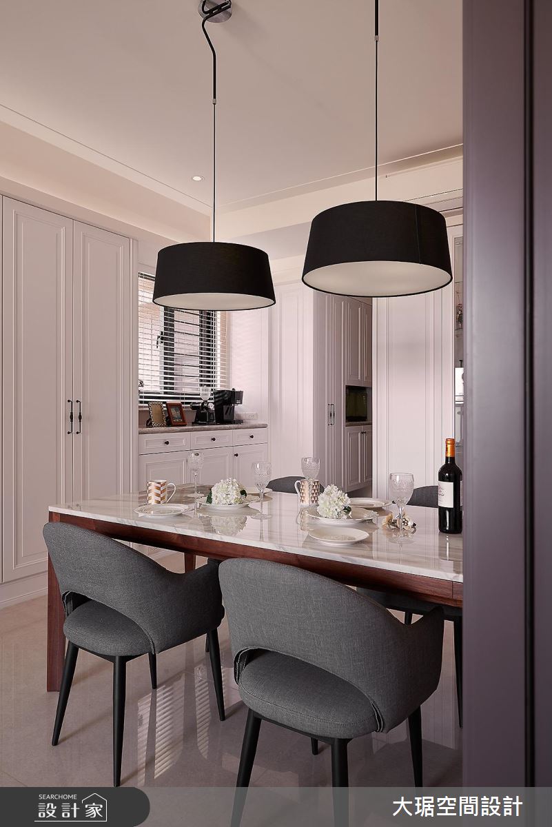 推開大門來到玄關,兩側以白色線板的造型門片打造鞋櫃,並銜接起室內的收納機能,靠近玄關左右兩側的櫃體結合展示平台,讓屋主可陳列收藏或旅行時帶回來的風格物件,醞釀人文美學的迎賓氛圍。呈現自然紋理的大理石材成為電視主牆,呼應新古典的非凡氣勢,而從陽台隱約透露的綠意生氣延伸至公領域,融入自然生命力,軟化講究對稱、比例的裝修工法;淡褐色的背景牆面,從客廳沙發延伸到餐廳領域,中間經過咖啡色系的臥室門扇,以漸層的大地色系鋪陳,再搭佐風格畫作,挹注溫潤的空間氛圍,餐廳區再搭配黑色吊燈,替純白的室內基底,創造豐富的生活風貌。
