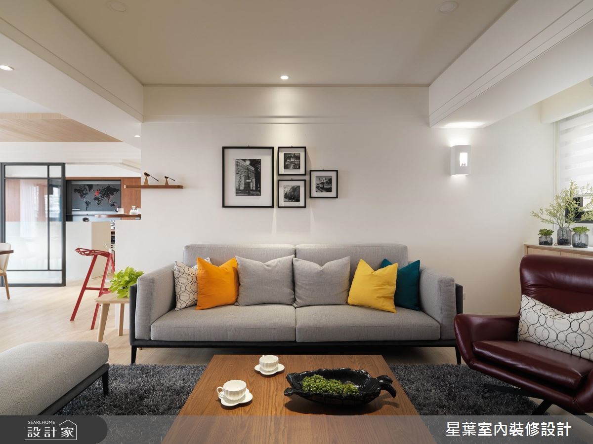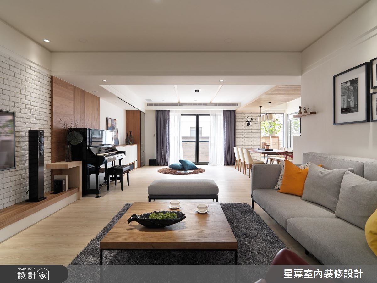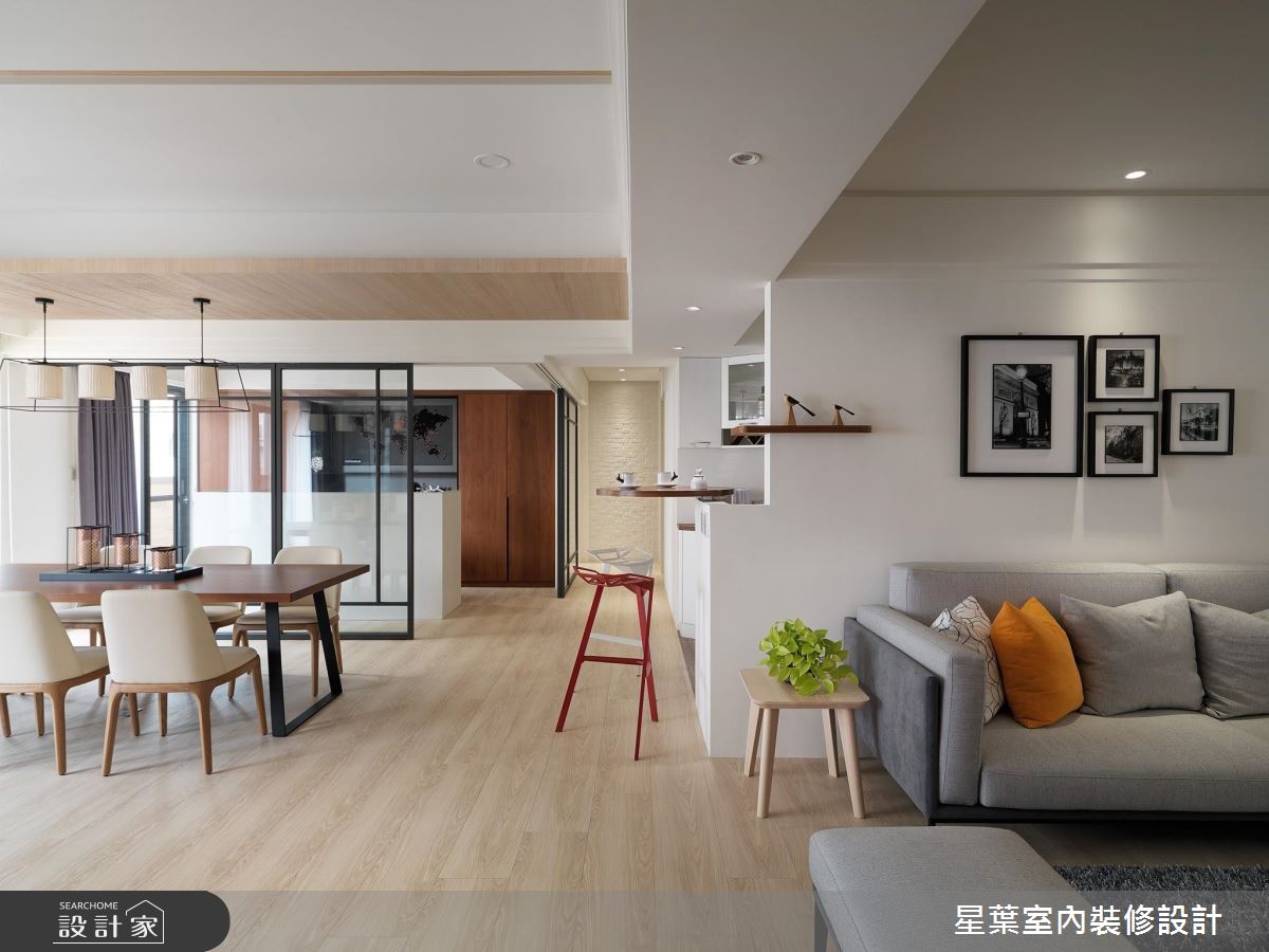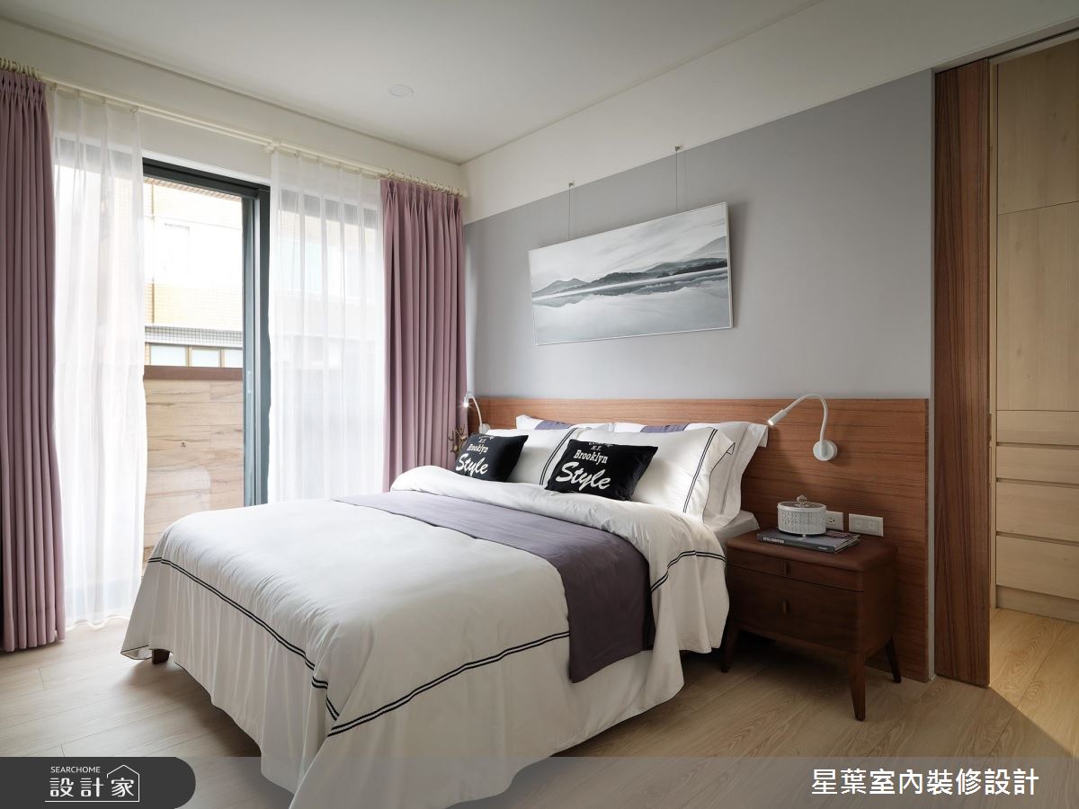 設計師特別於入口處的 45 度角、加開一扇固定景視窗,藉由戶外南方松挹注綠意,搭配三面大窗援引採光,達成空氣與光線的自在流通,同時給予開放式的公領域規劃,讓天花展現簡潔線條,創造寬闊敞朗的視野感受;且配置具通透性的書房門片,延續住宅整體的明亮度,書房背牆採以木作、黑色鐵件打造書櫃,強化空間收納機能性,並在牆面加入地圖裝飾,形成聚焦的美好風景;主臥承襲溫煦的明亮度,呈現簡約舒適的調性,在床頭處拼接木質肌理與淺灰色調,型塑充滿俐落層次的牆面表情!