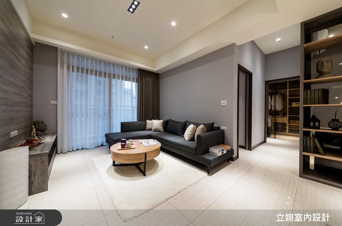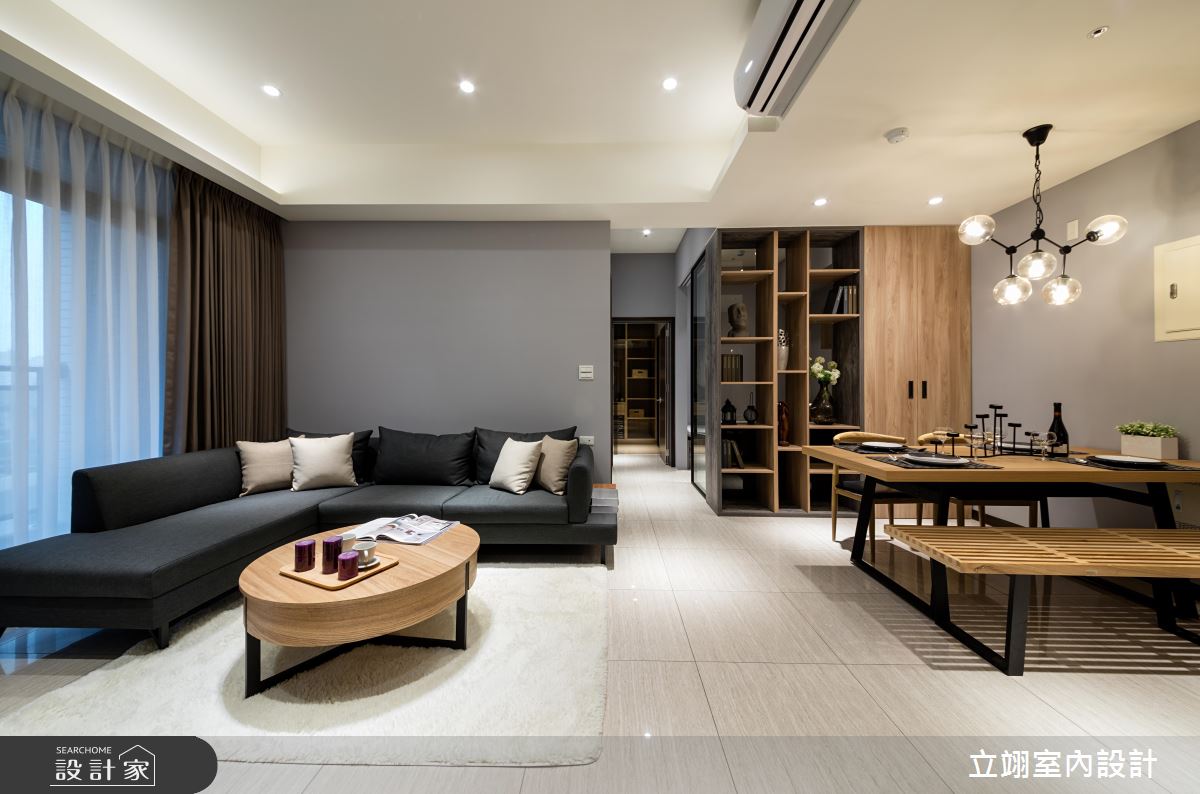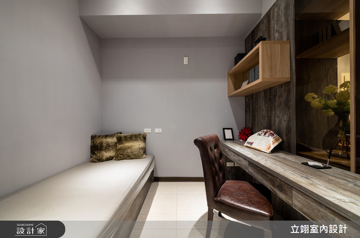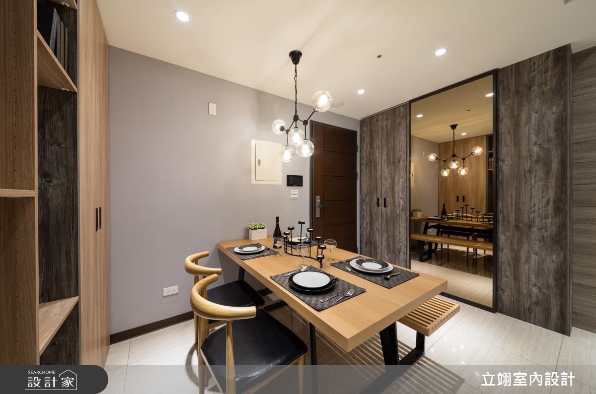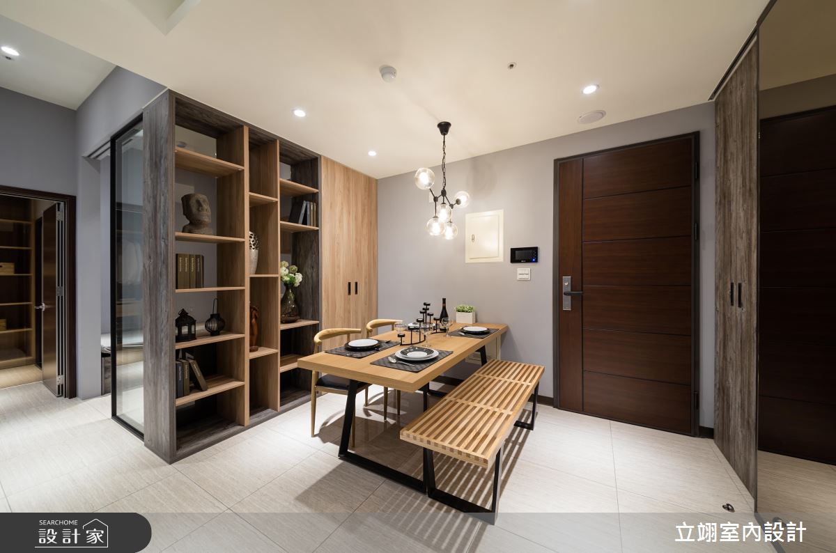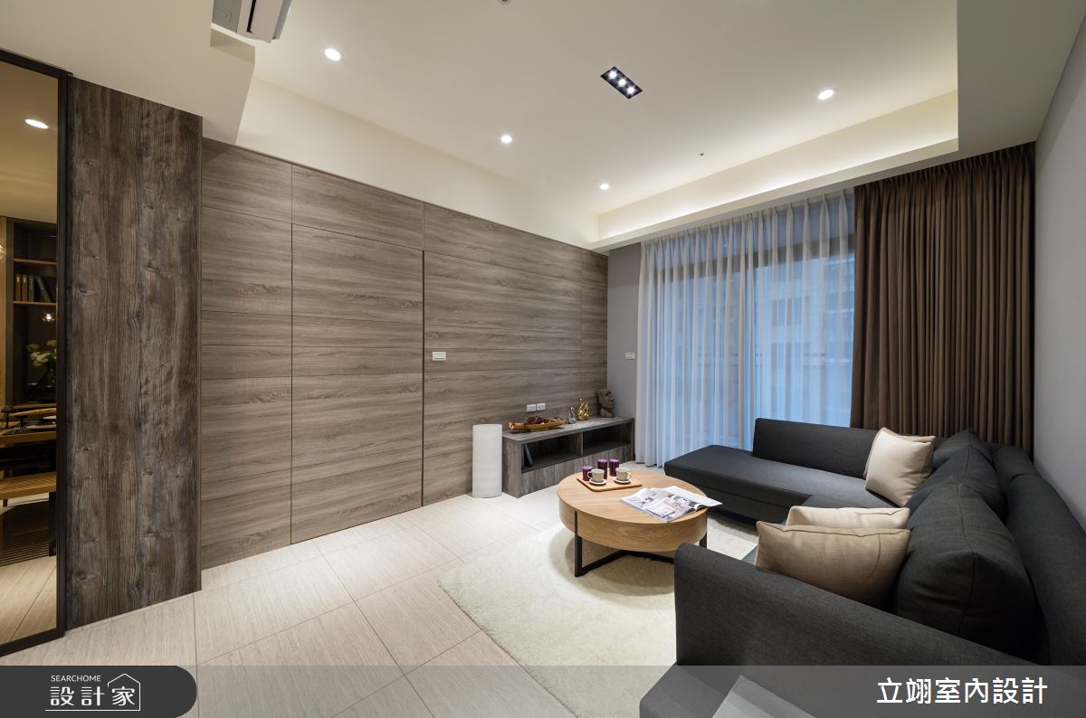 抹除玄關隔閡,以及頂收納櫃搭配鏡面打造入門機能,與餐廳空間平行,並以木皮展示收納櫃結合玻璃取代多功能書房的隔間牆,打造了通透的視覺感受、降低空間浪費。公領域牆面以灰階色彩搭配深淺不一的木皮色彩,散發簡約沉穩卻不顯老氣的風格。半開放的多功能書房內建臥榻,除了平日休閒更可充當客房,拓增小家庭空間機能。在客廳、書房與臥房皆善用系統櫃,除了讓收納機能更趨完整、視覺更加整潔,同時也能達到有效減省預算的目的。