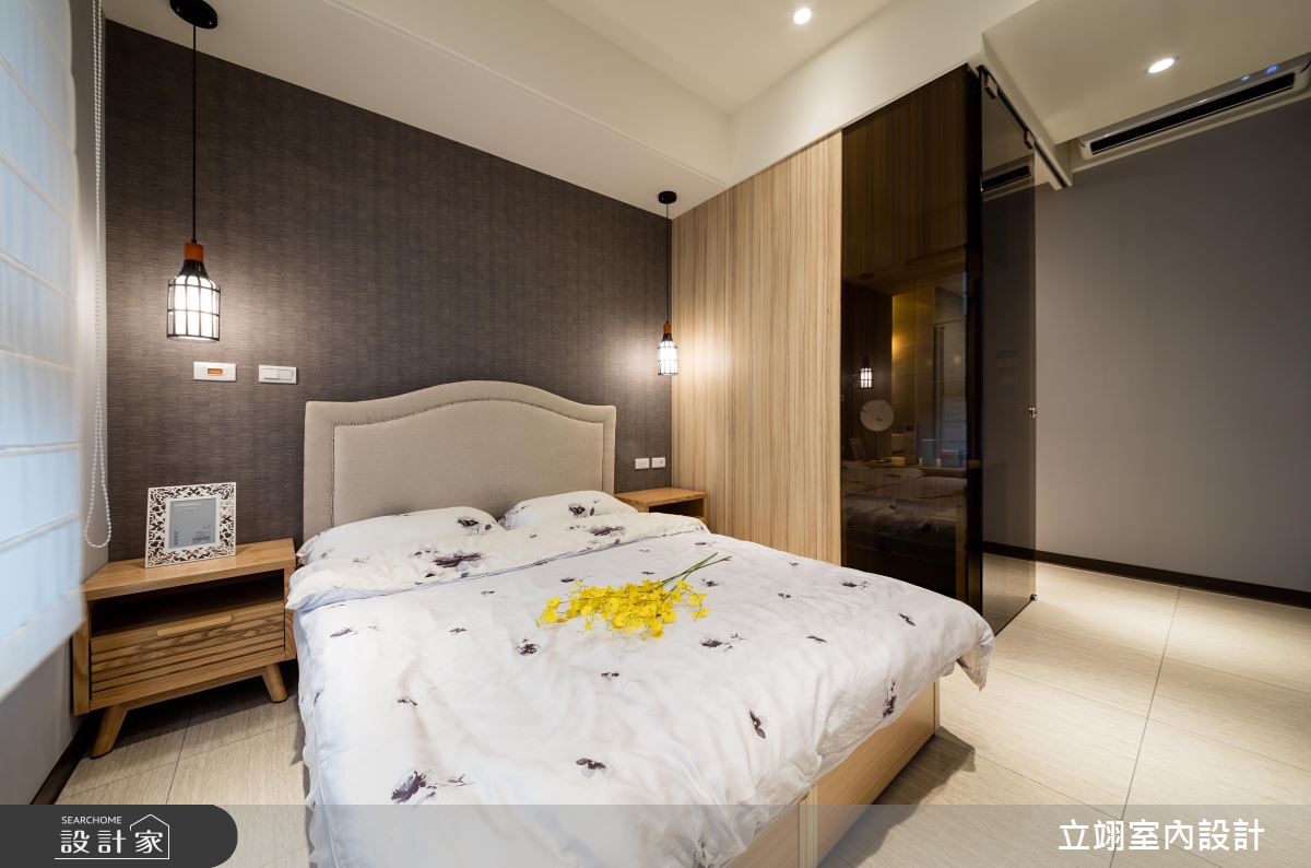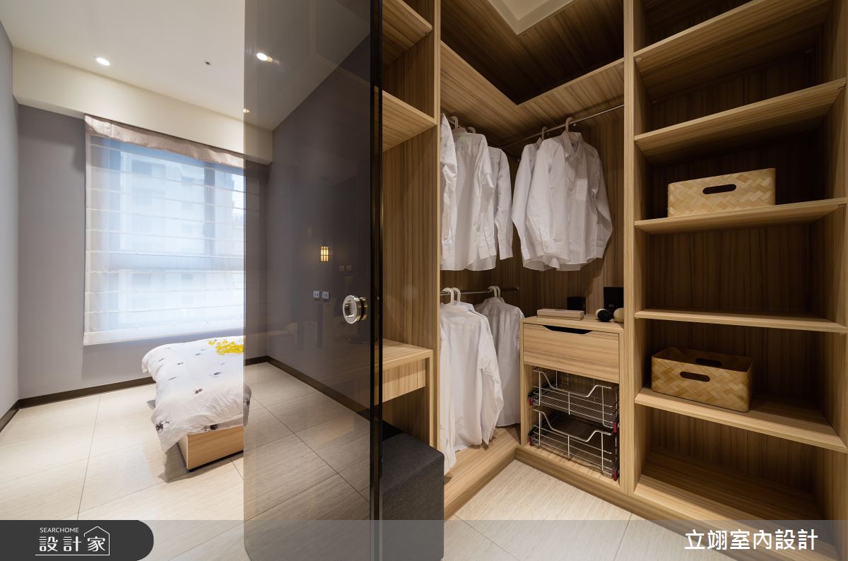 主臥延續公領域的材質與色調,以灰階牆面搭配木元素創造輕鬆的睡眠空間,利用茶玻結合系統櫃創造連通浴室的半開放更衣間,形成流暢的沐浴更衣動線。