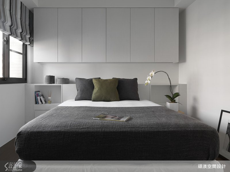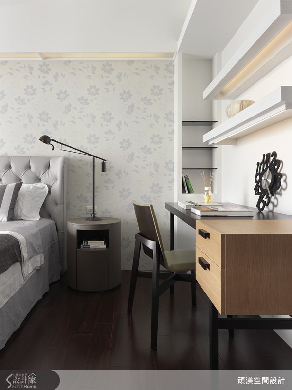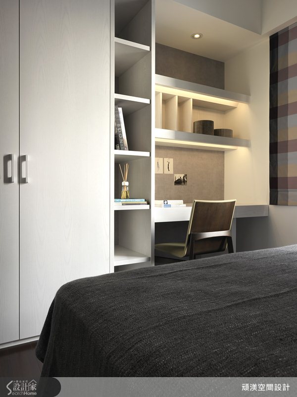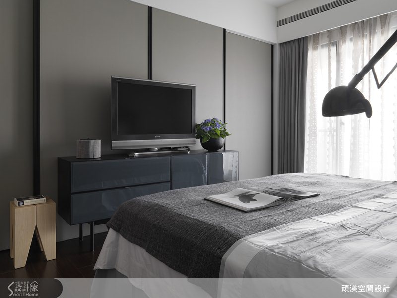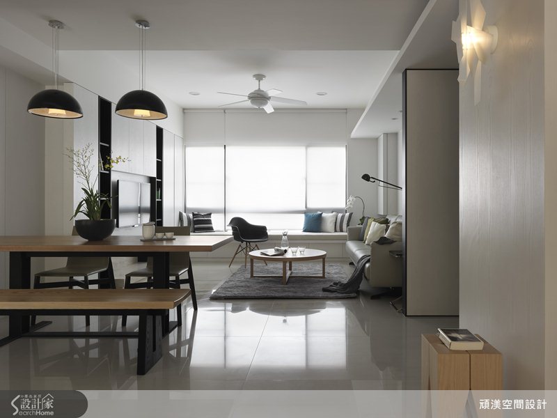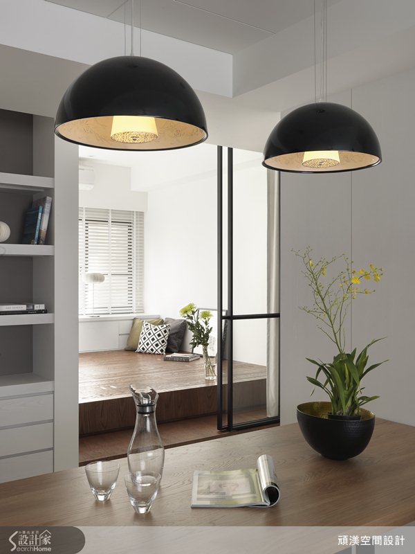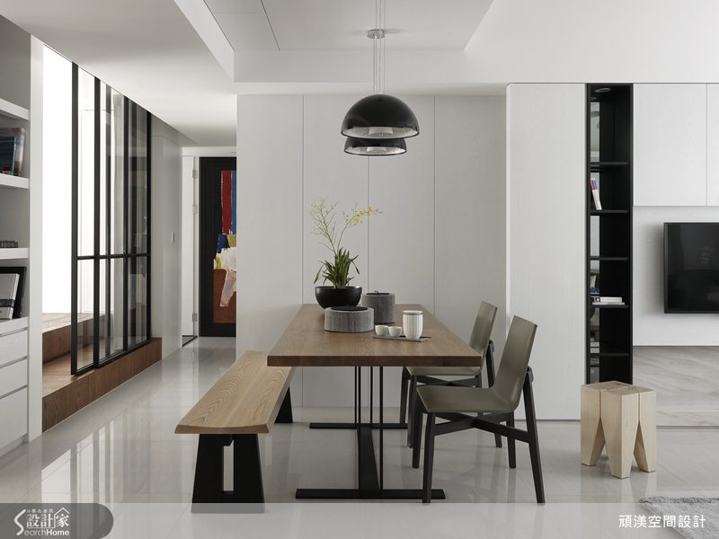 採光良好的客餐區以開放式設計連結,放大了空間的視覺感受,也帶來流暢、靈活的生活動線,並在落地窗旁安排一道臥榻,平時可以坐臥、收納,在窗畔就能享受到舒適的光度。電視牆賦予了充裕的收納,純白色櫃體內嵌入鐵架展示區,顯得俐落而簡潔;一旁的用餐區,以一張溫潤木長桌作為空間重心,溫暖的吊燈燈光,凝聚了全家人溫馨的餐飲畫面。書房空間運用黑框玻璃拉門,使光的穿透更具層次性。臥室承襲了簡約、俐落的設計感,並依據不同的使用者需求,賦予充足的私領域收納。