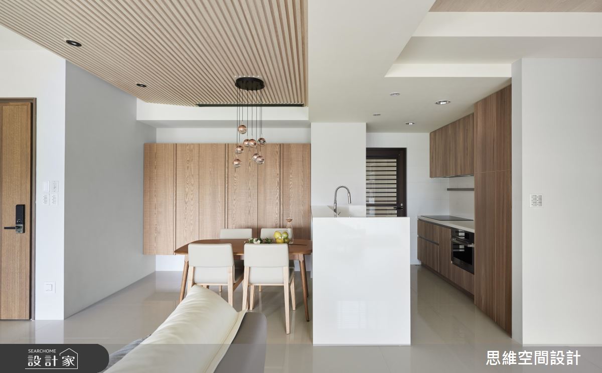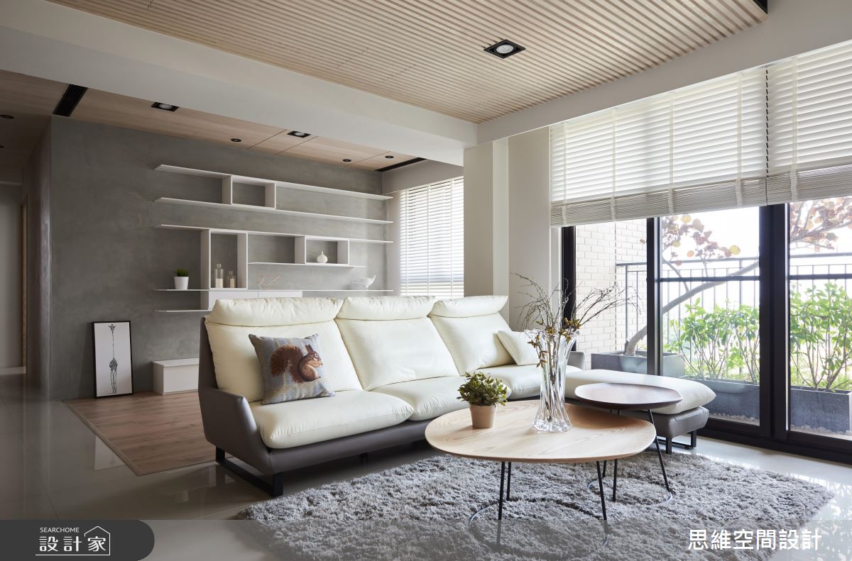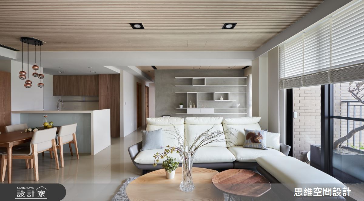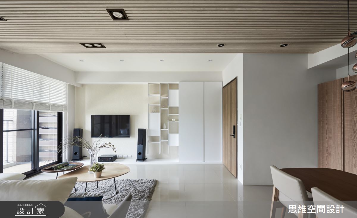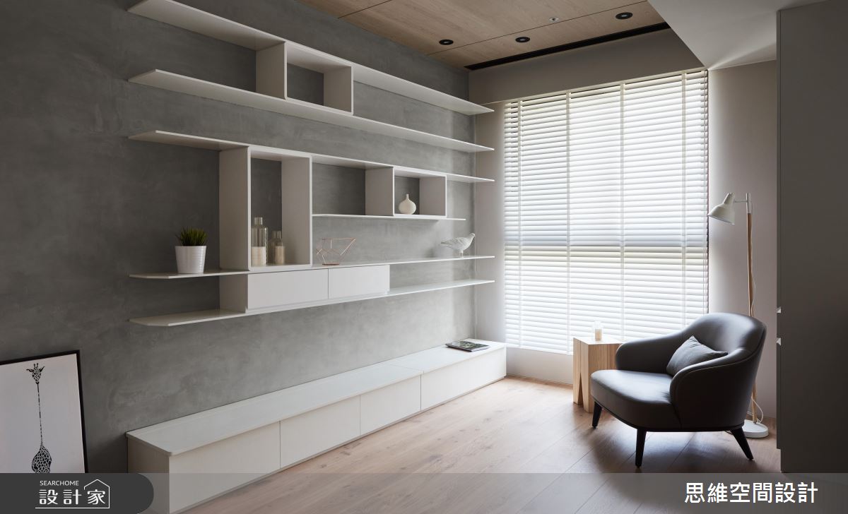 公領域呈現延展開放的視野,於天花板妝點木作格柵,運用線條串起客廳、餐廳,達到視覺延伸效果,型塑擴大的空間感,廳區則以灰、白色型構主要基底,並藉由窗戶延伸室內眼界,將窗外的翠綠導引入內,凝聚鮮明生動的意象;開放式的書房則沒有過多設計,採用木地坪強調溫潤氛圍的轉換,以樂土塗料鋪敘質樸的牆面背景,再搭構白色的層板組合,與電視牆的懸空展示櫃產生無形呼應,在輕薄不壓迫的流線之中,帶出輕盈的量體表情!
