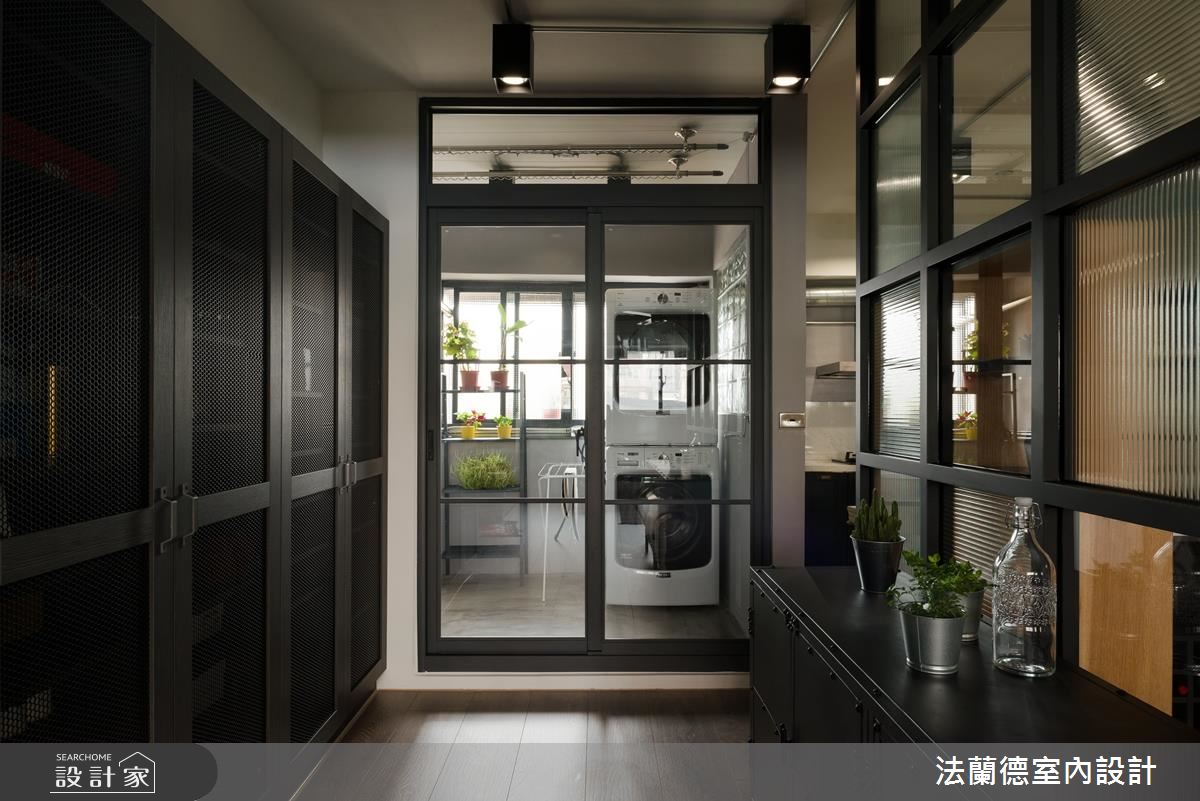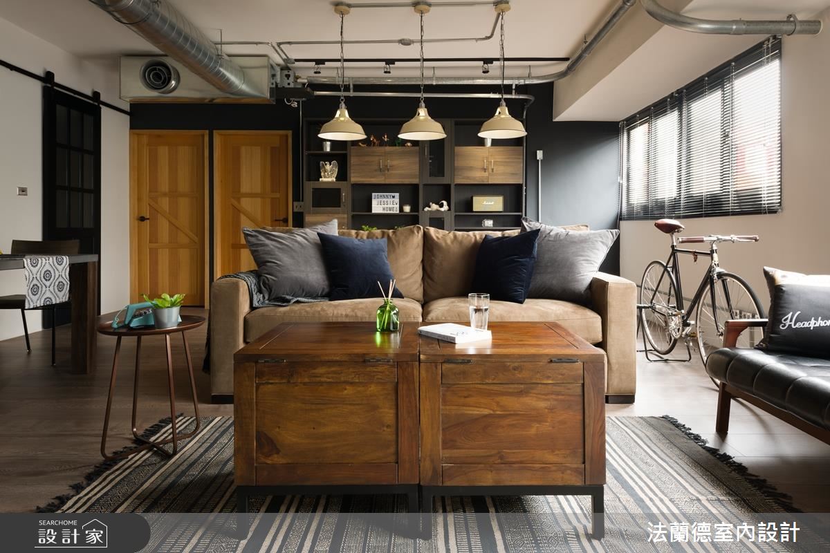 由於主人嚮往大坪數般的空間感受,也相當重視與親朋好友的歡聚時光,設計師以開放設計串連公領域,放大餐廚空間,並讓客廳與餐廚呈現至於同一水平,創造流暢的對話動線。入門處以回字玻璃屏隔搭配大面積櫃體,創造通透且收納量充足的玄關。本案風格以美式工業風格為主軸,天花以裸露管路搭配軌道照明,整體色調更以藍黑油漆塗刷壁面,充分彰顯個性氣息。不僅如此,設計師利用工業風配件如皮件、鐵件燈飾、單椅與櫃體、彷舊木質家具搭配木地板,成功營造經典與復古的平衡。 L 型廚房搭配中島吧台,提升與用餐空間的互動頻率,讓歡聚時刻毫無隔閡、自宅宛如咖啡廳。