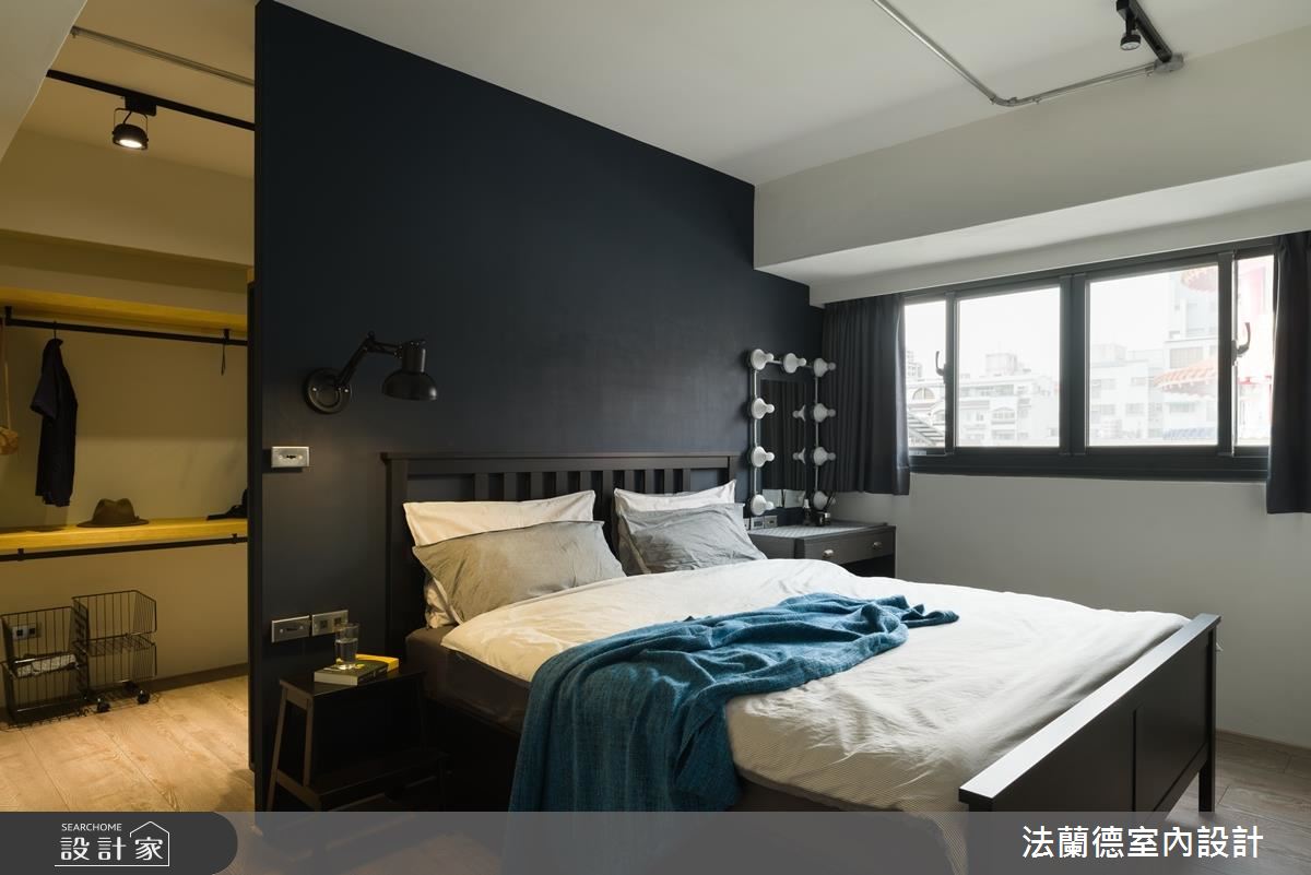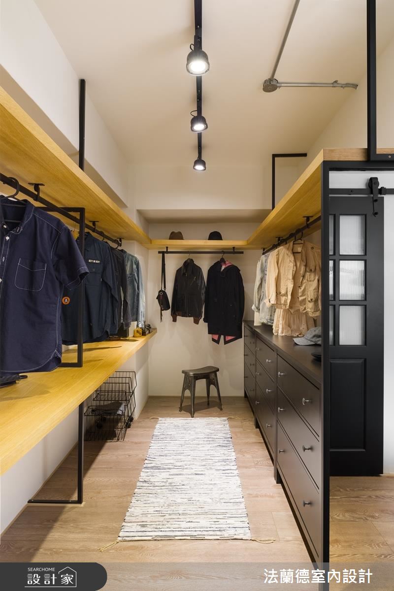 主臥延續公領域色彩,並在床頭後方規劃更衣間,以鐵件與木元素打造工業風收納,讓試裝時光也宛如身處個性服飾店。