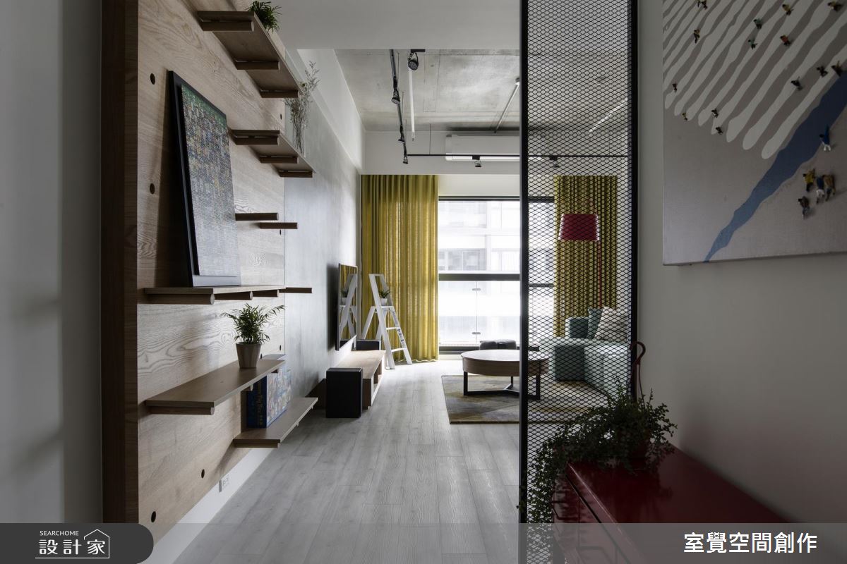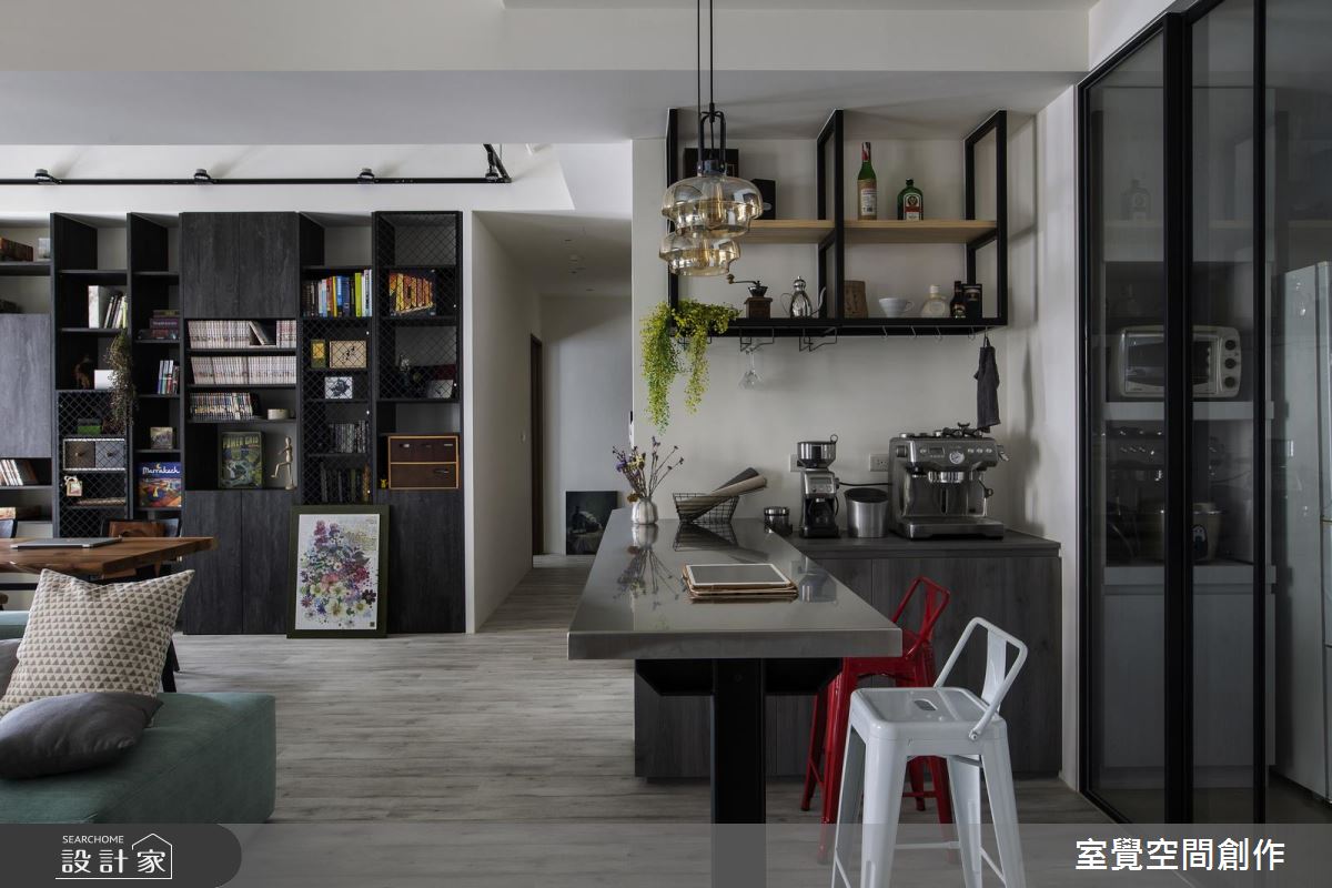 首先,設計師藉由大面積落地窗引入自然光影,搭配公領域開放設計,大幅度延伸視覺感受。巧妙使用鐵網屏隔降低視覺阻礙,並利用訂製洞洞板收納層架串連內外交界。保留原始屋高與管線設計、採用矩形軌道照明,並利用水泥漆塗刷電視牆,與裸露天花板相互呼應;木地板的鋪設也有技巧,順延軸線由入口導向落地窗,雙雙達成無限延伸的感受。開放書房接續於客廳後方,利用系統櫃結合鐵網,打造展示收納兼具的櫃體。由於人口單純,除了將吧台式餐桌結合餐櫃,也開放餐廳置於獨立廚房入口處,以玻璃拉門創造通透感,同時防止油煙逸散。