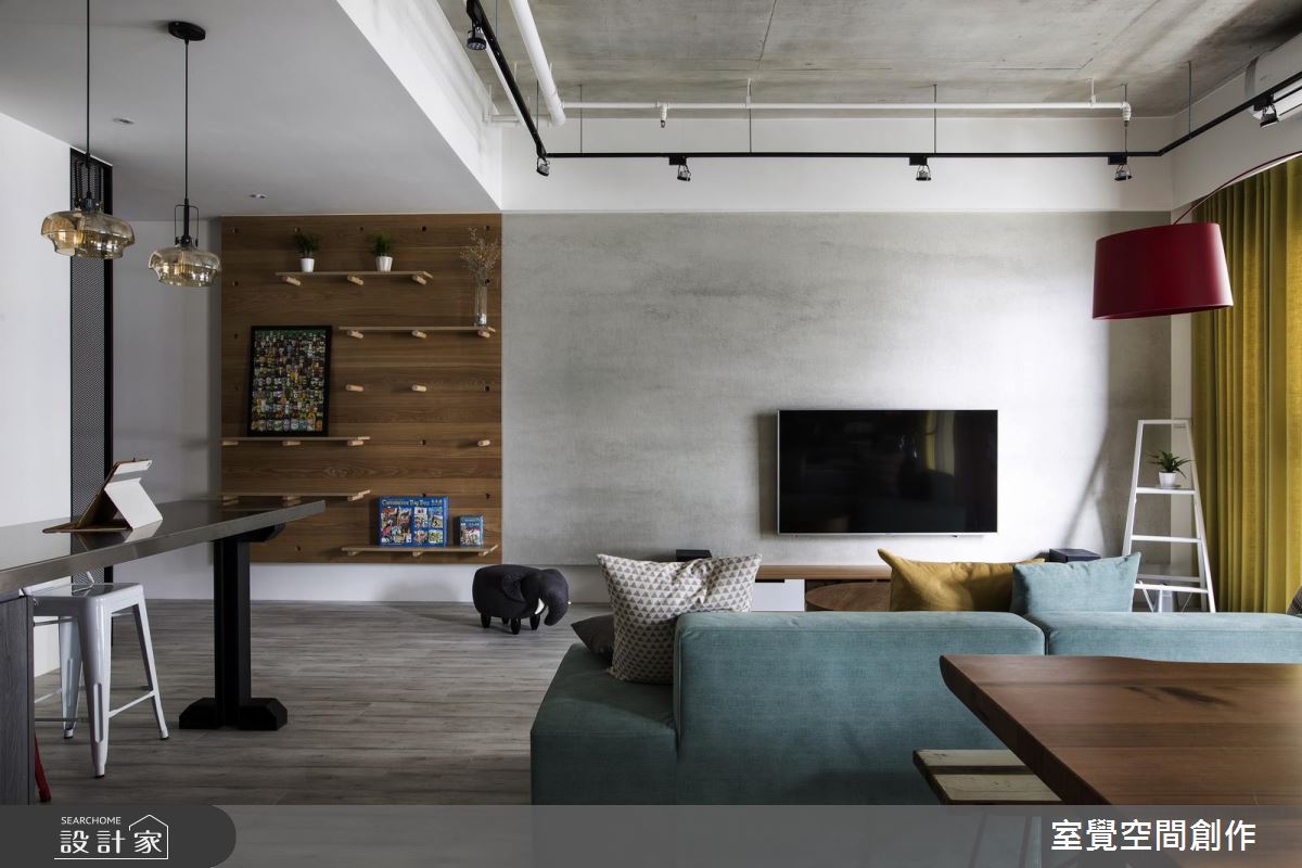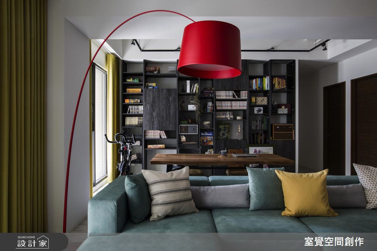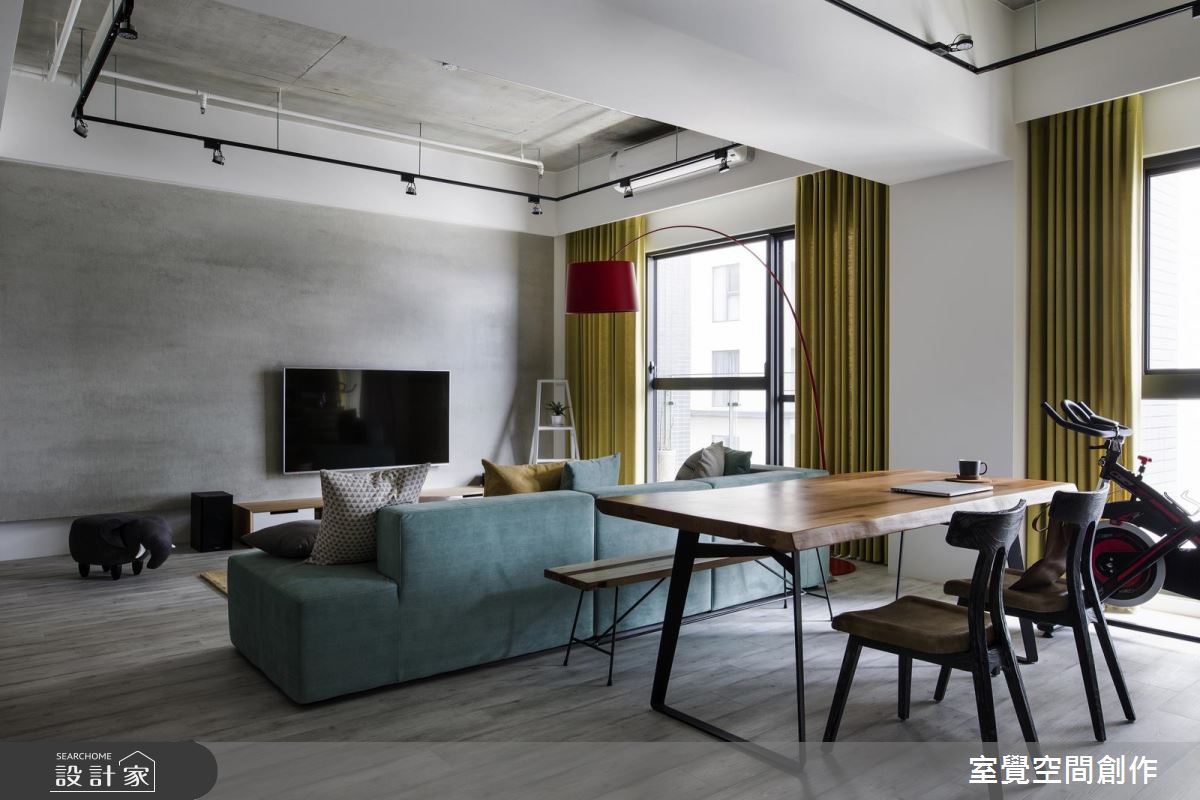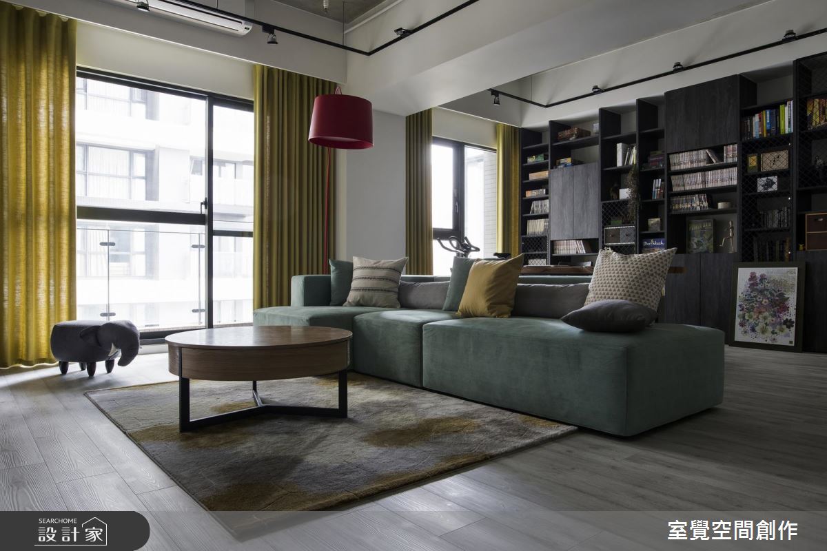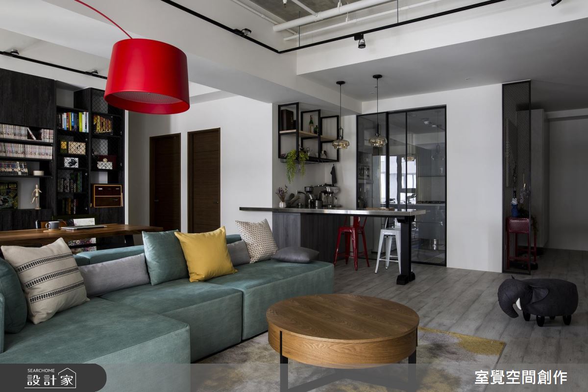設計師以明暗不一的大地色系為基底,接著利用色彩鮮明的家具配件進行點綴,包含芥末黃窗簾、湖水綠絨布沙發、鮮紅立燈與玄關櫃,讓工業風格更添個性風采。