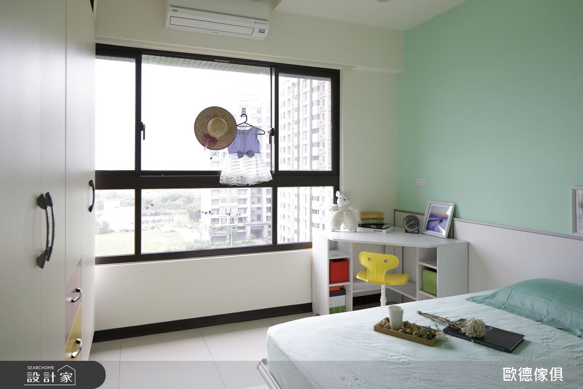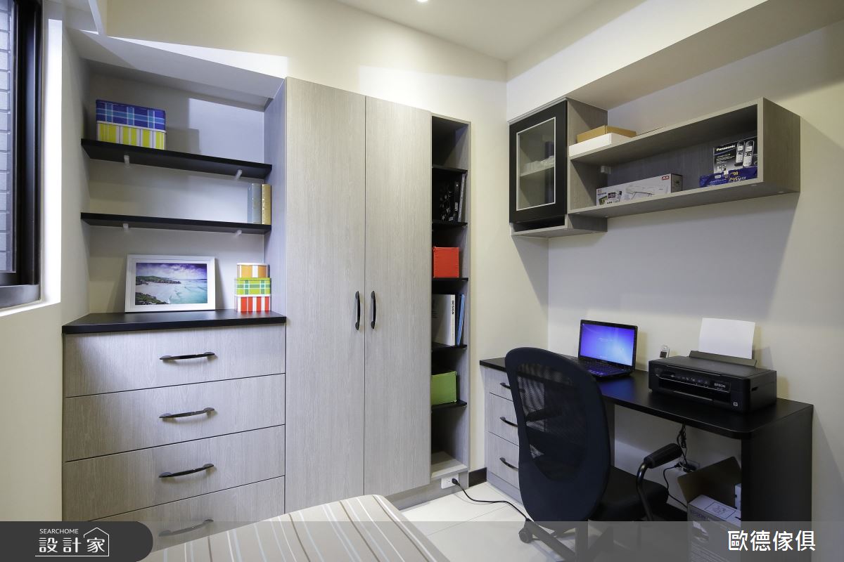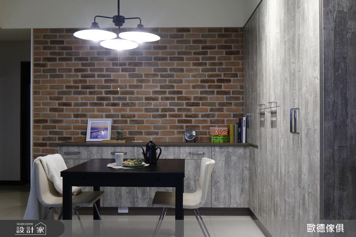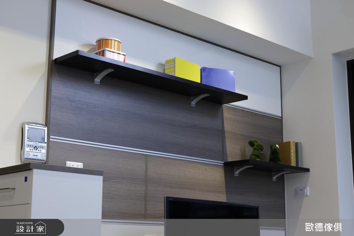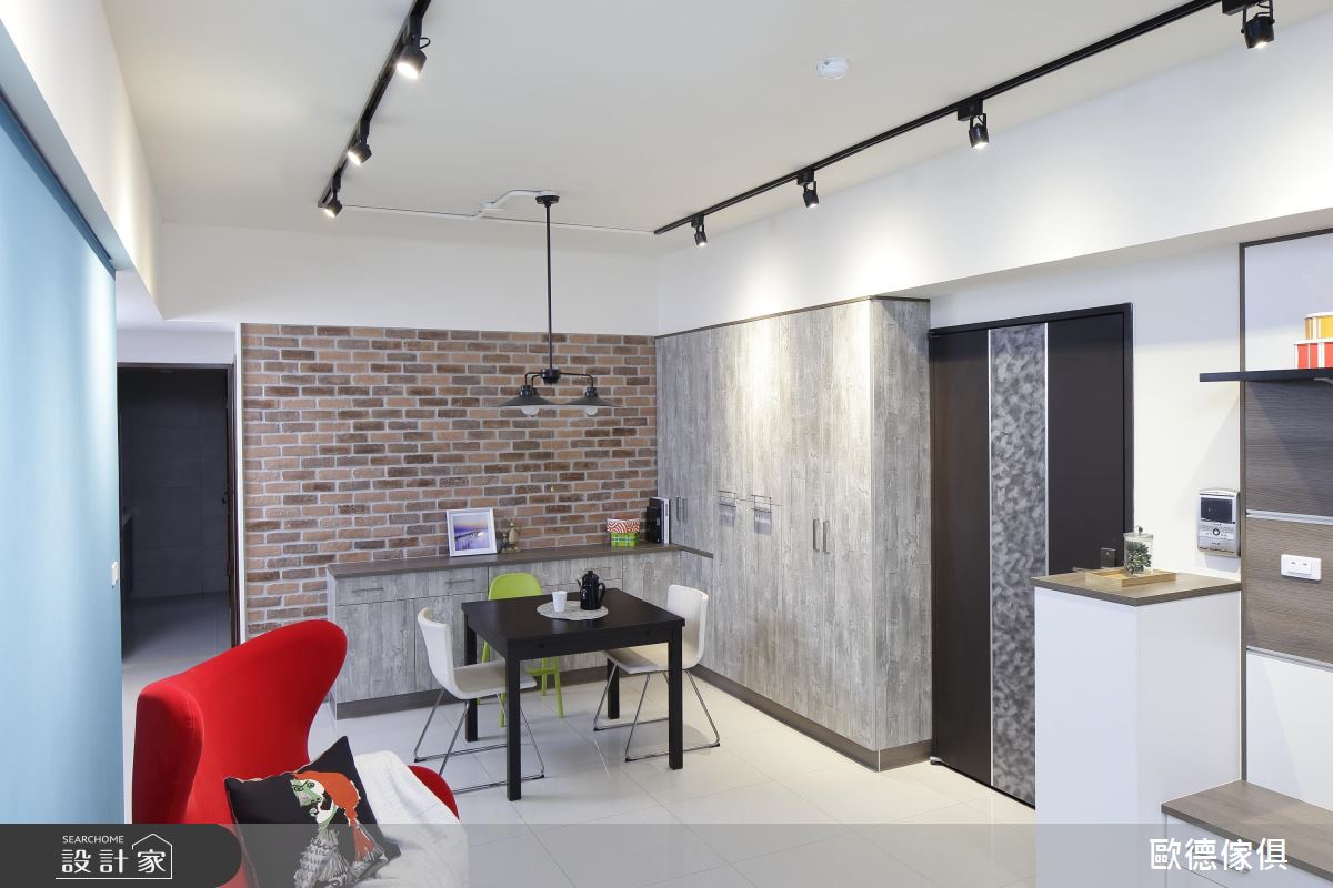 客廳區,於電視牆鋪敘兩種自然木紋板材,再加裝具滑軌的置物層板,讓日後的使用情境充滿彈性,並選擇高彩度水藍乳膠漆妝點客廳主牆,透過顏色凝聚焦點,輕鬆改變居家氣氛;餐廳牆面則鋪陳懷舊的文化石磚,搭佐灰色櫃面凝聚質韻,並依循櫃體坐落位置,規劃不同的門板開闔方式,提高使用便利性;私領域部分,則藉由材質肌理決定風格呈現,於書房使用適合男主人的低調大地色門板,勾勒紓壓情境,且將櫃體統一收整於樑下,創造整齊清爽的機能表現;臥房內,給予湖水綠作為床頭主色,搭配白色的系統衣櫃,雖無強烈而花俏的風格展現,卻令人感到舒適清新!