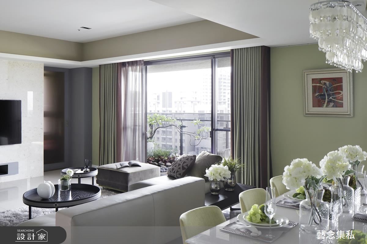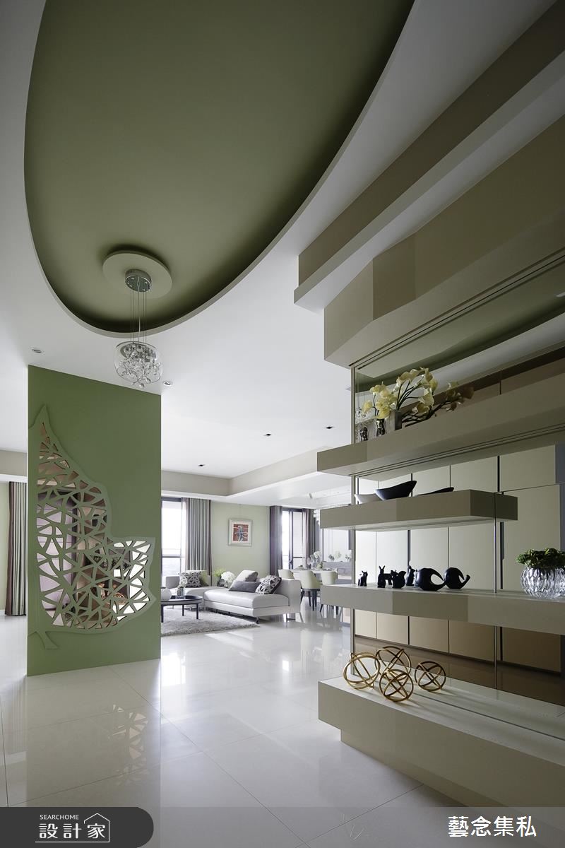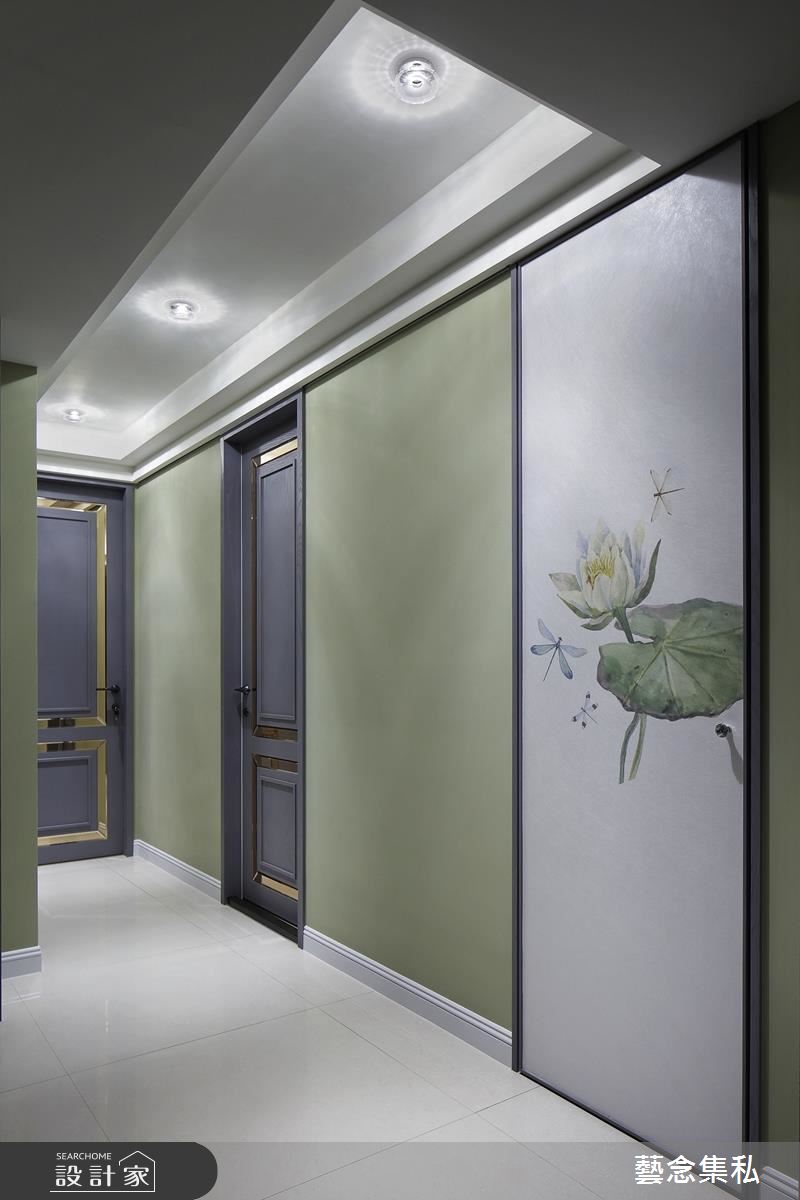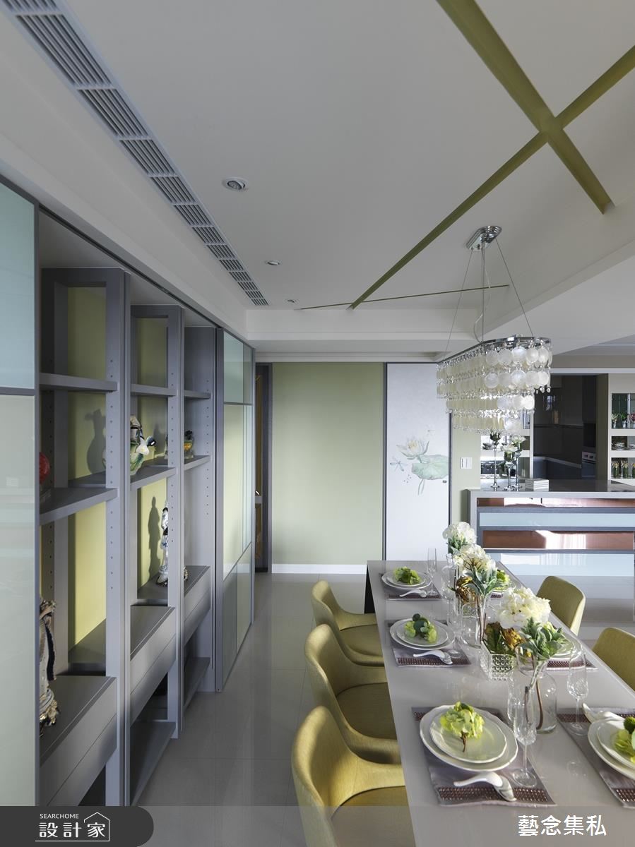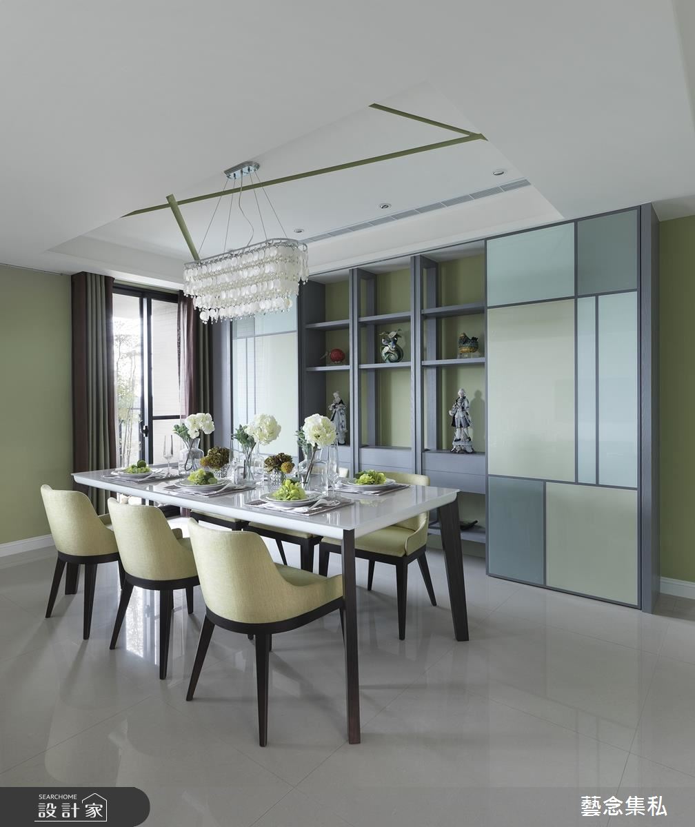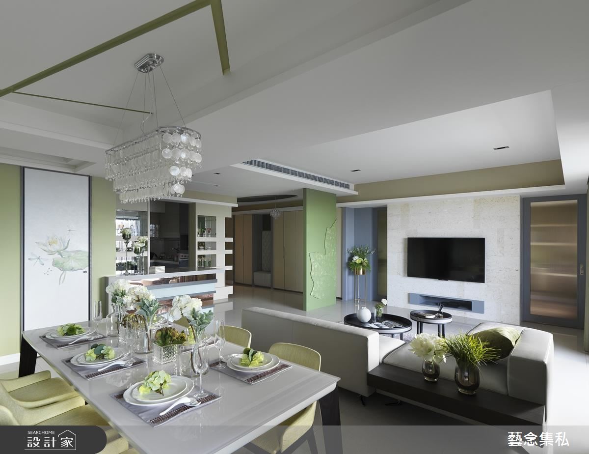 設計師在美學上以薄荷綠為主調,輔以大自然的意象,塑造法式優雅氛圍,定調設計主軸。一走進這個60坪的紓壓的空間,就可以看到引喻葉脈的鏤空玄關屏風,不但架構了綠意端景,同時避掉了風水上的穿堂煞。薄荷綠則以詩般的韻腳,低調但穩定的在公共空間中形成清新的語法。夏日清蓮的素雅壁紙呈現於牆面,讓居住者在視覺上也有呼吸的空氣感、身為大自然素材的珠貝吊燈更輕盈的餐廳空間中呈現了海洋意象的奢華氛圍。為了增加舒適度,實用機能一樣沒少,像是餐櫃除了作為收藏展示之用,亦加入烤漆玻璃打造書寫平板,廚房外的吧檯規劃更兼具輕食、品酒功能,滿足不同時刻的使用需求;主臥則以木地坪強調溫潤氛圍,搭配典雅的壁紙鋪敘、完善的機能設計,替屋主定義舒適的生活型態!