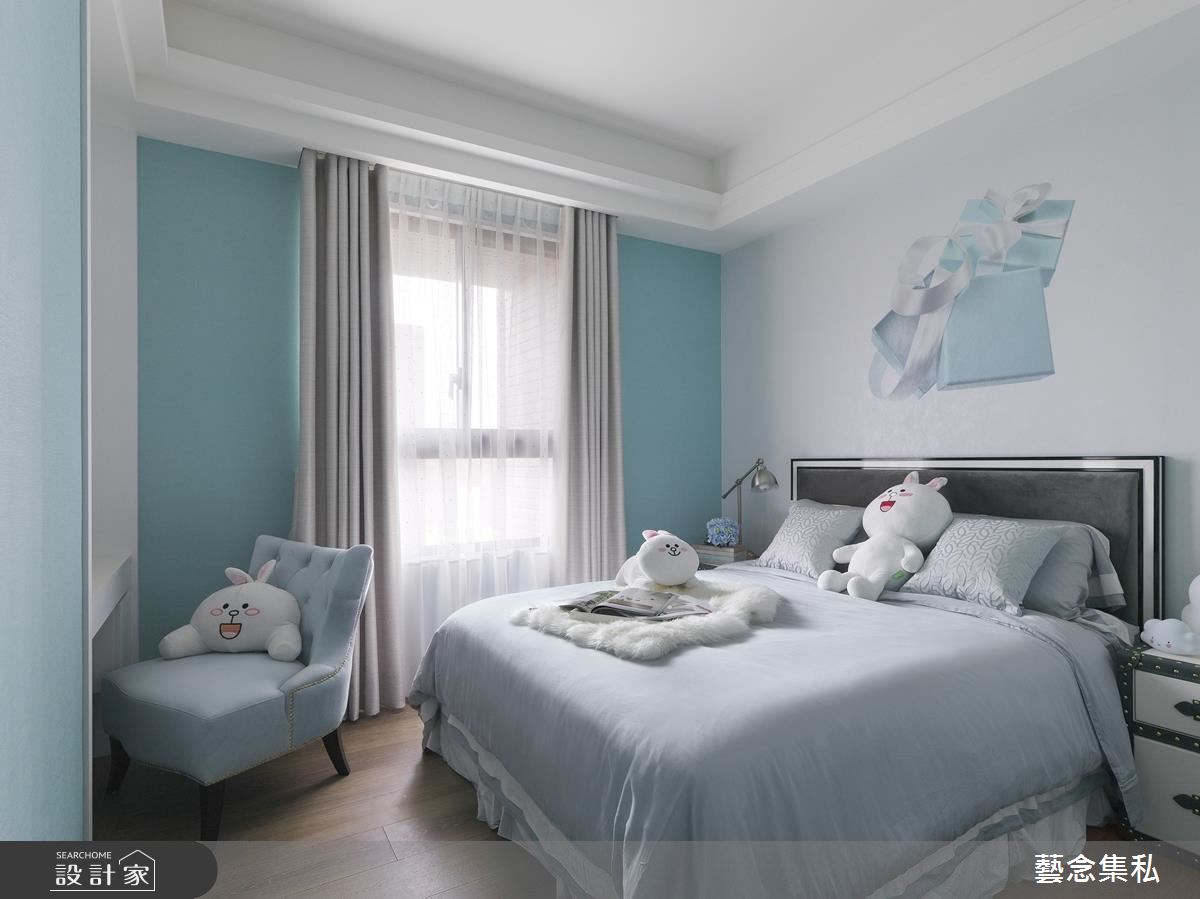 設計師的顏色搭配充滿法式的時尚調調,公共空間以溫婉的紫藍伴奏薄荷綠,房間門片用的金色框是增加亮點的三連音,女兒房則以清新的 Tiffany 藍為主旋律,藉由純淨的空間主軸,帶出純真與優雅重奏的感官絮語!