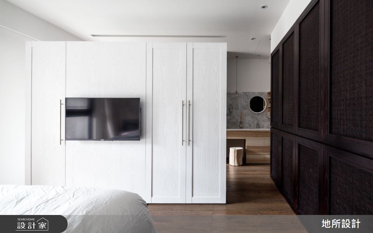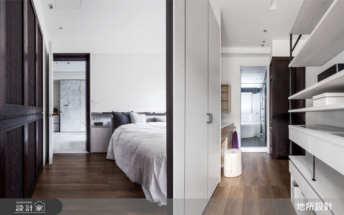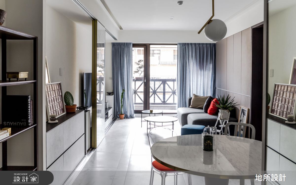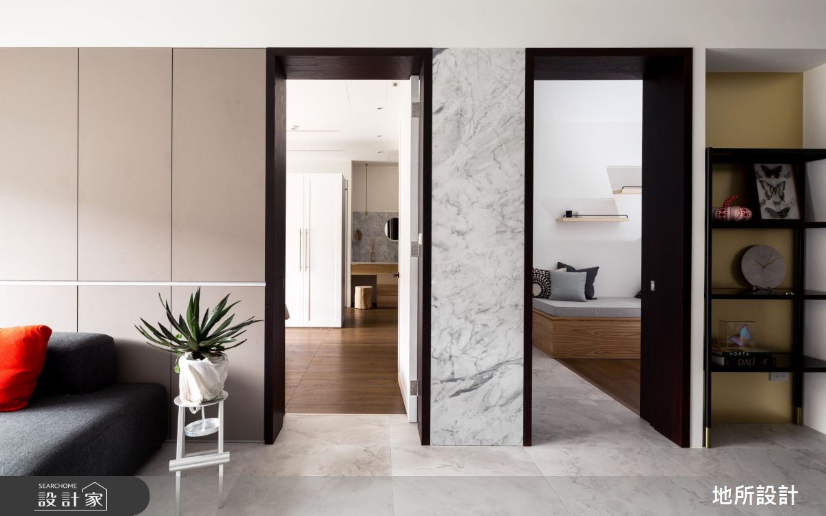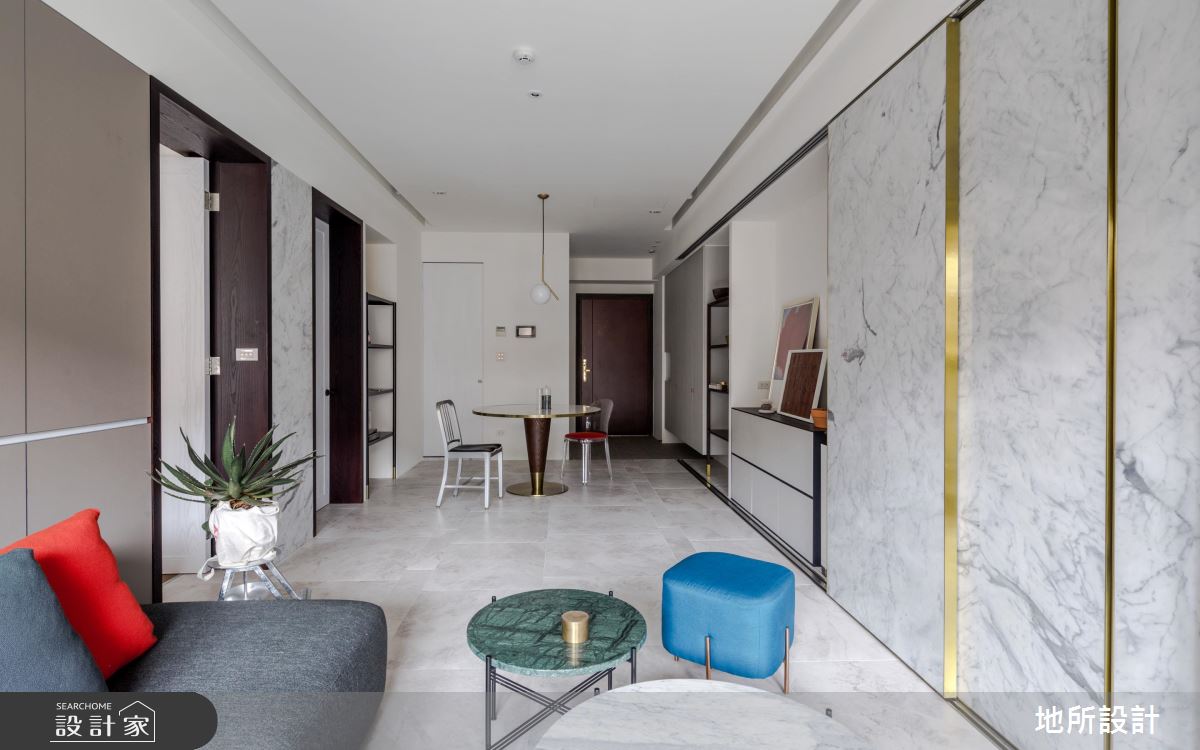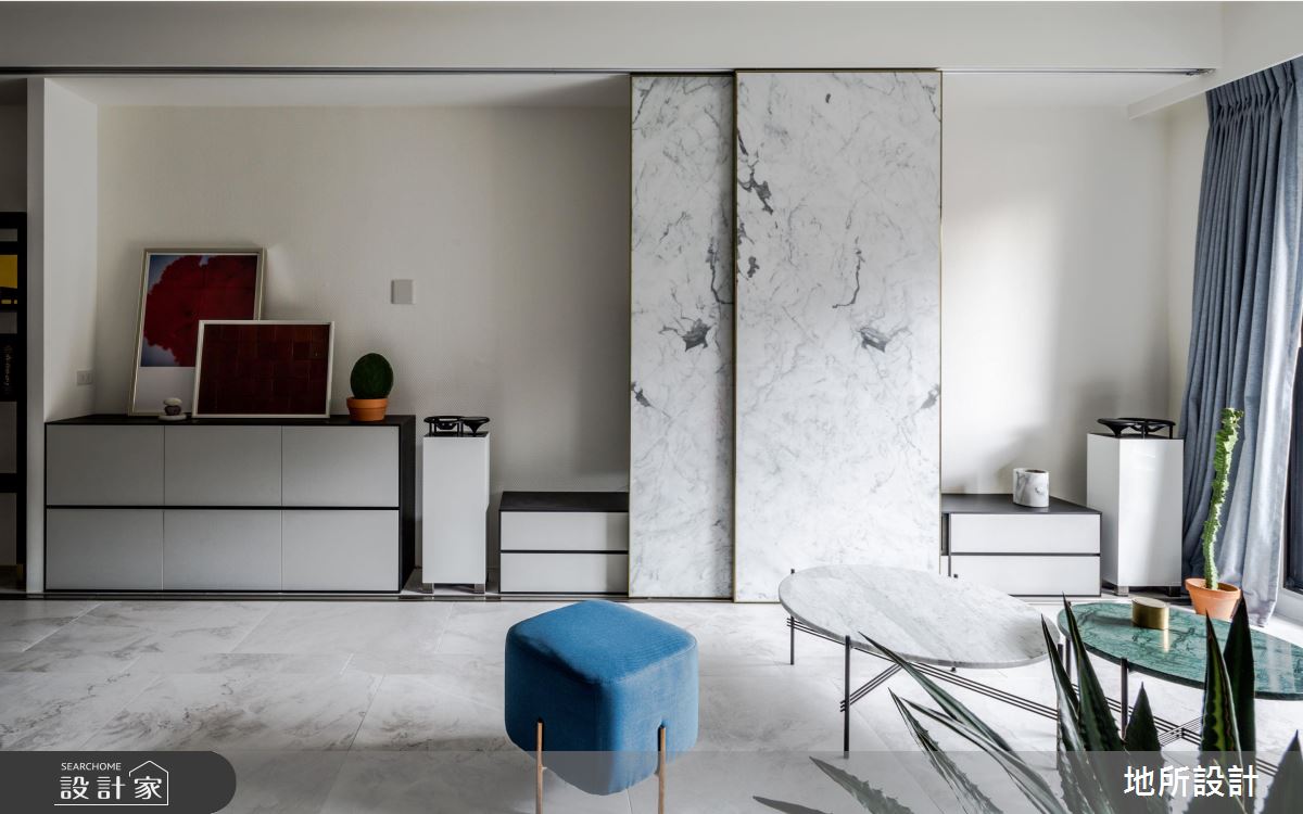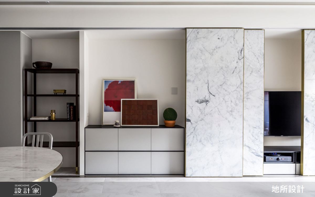 設計師首先讓玄關、餐廳、客廳串聯一氣,而主臥與多功能客臥、廚房則收整於一邊,藉由分明的公私領域佈局,型塑更敞亮的空間視野;在機能安排上,將長型屋的大跨距壁面化為焦點,規劃成一道多功能主牆,集結鞋櫃、生活用品收納、展示功能、電視牆等豐富主題,並額外設計4片大理石金色鍍鈦框滑軌門片,讓屋主可依需求彈性推移,開啟不同的立面風景;同時加入灰白色的大理石紋理,增添整體空間的質感,地面亦鋪設仿大理石紋地磚,巧妙從公領域延伸進入客房,形成趣味的指引;主臥內,則透過衣櫥與量體界定領域關係,劃分出睡眠區與進入主浴的動線走向,且同步網羅視聽、更衣、休憩、衛浴等機能,量身客製屋主理想的起居模式!