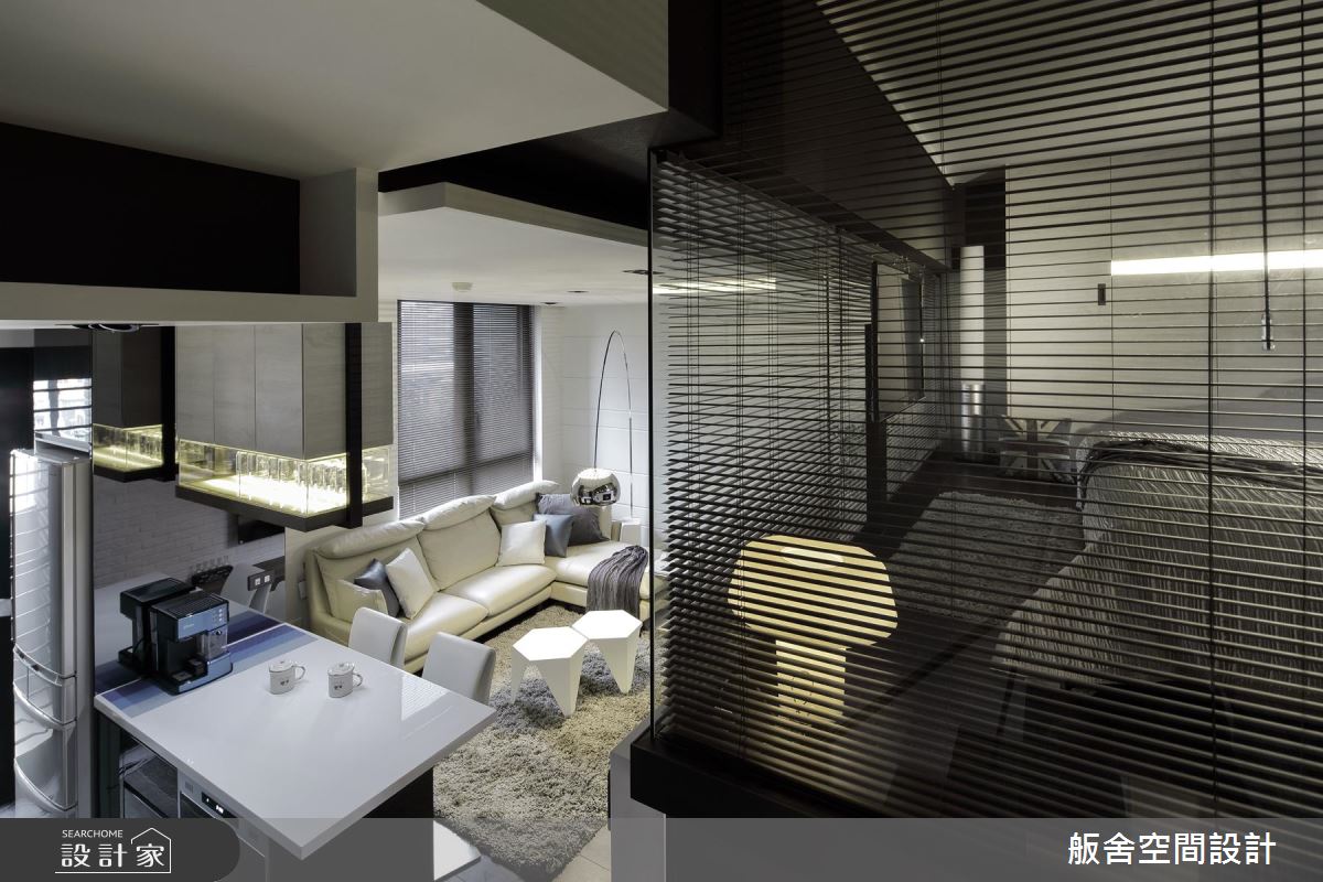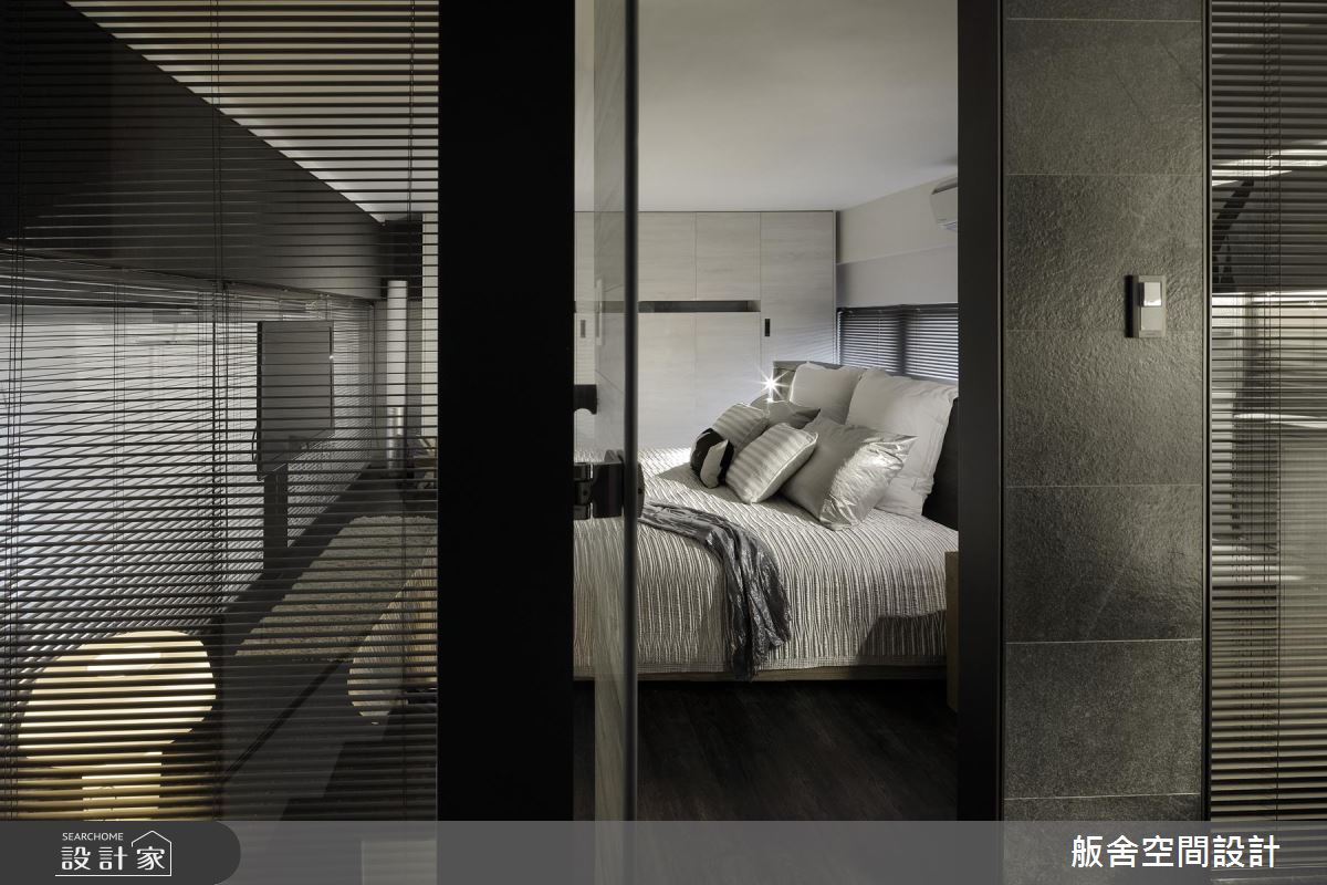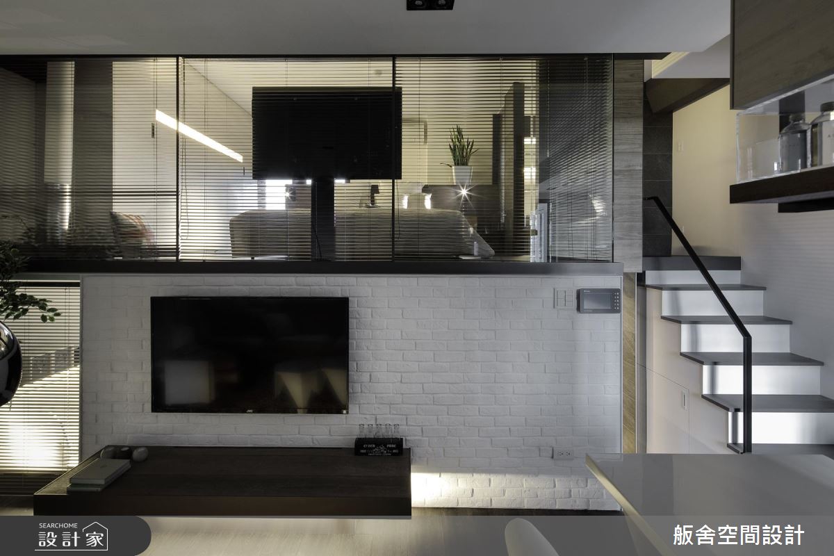 設計師善用挑高四米的優勢,採木百葉搭佐清玻璃型構隔間,增添上下層的視覺通透感,並挹注極簡與工業風元素,引用純白文化石及陽剛鐵件,創造充滿個性的低彩質感;餐廚則與中島結合,不只是女主人的料理天地,更可作為居家使用的工作檯,於中島上方增設吊架,增加收納的同時亦保有量體輕盈化;電視牆旁,則可通往書房兼客房的多功能領域,考量到未來的變因,不施作過多櫃體,讓空間更可被彈性應用;沿著階梯走上二樓,進入主臥,除了透過床頭窗援引日光,也藉由與廳區連結的窗面互通光線,營造明亮無礙的休寢氛圍,搭佐深色木紋或石材磚面的鋪敘,使小空間顯得極為俐落,坐擁著飯店套房般的高雅氣質!