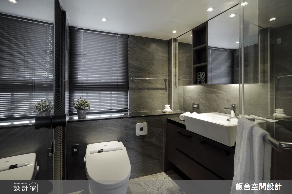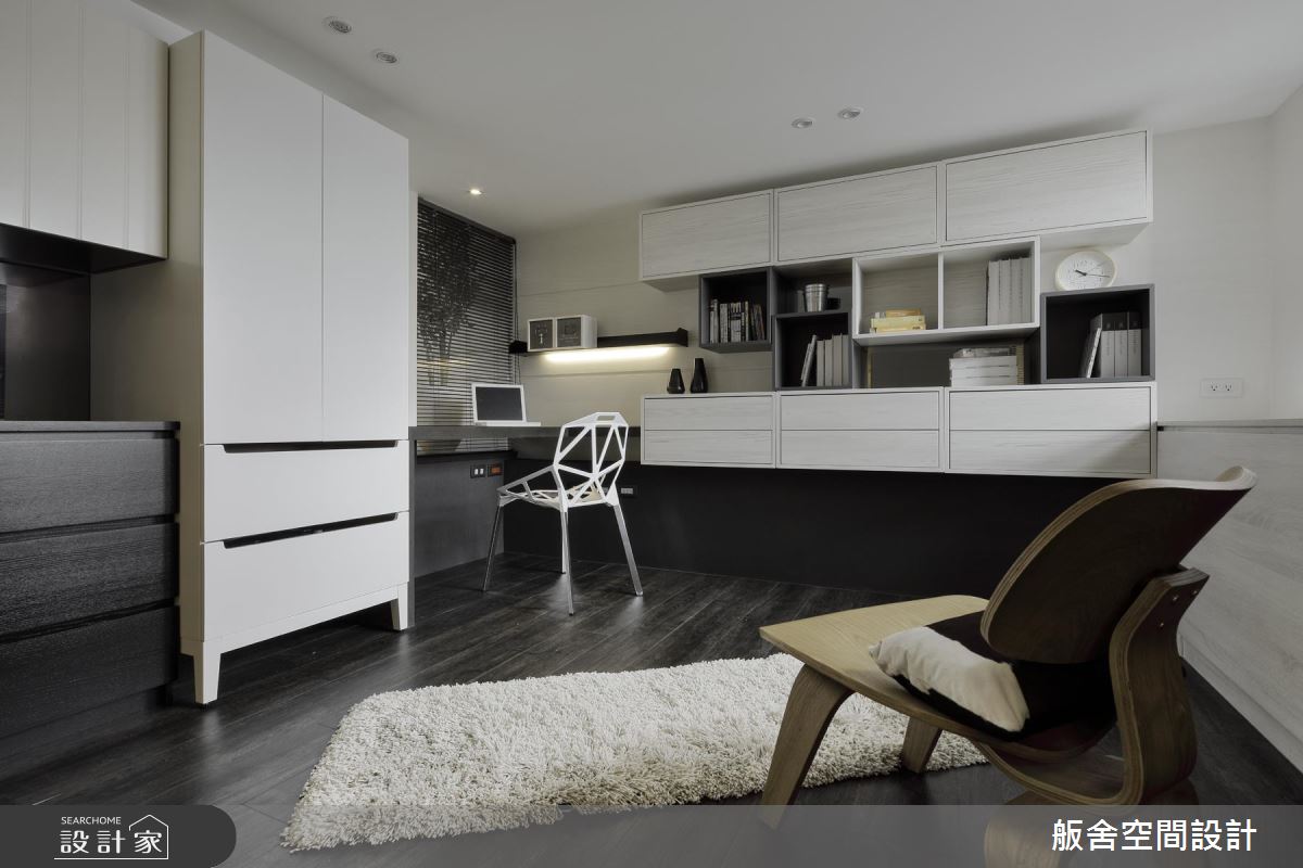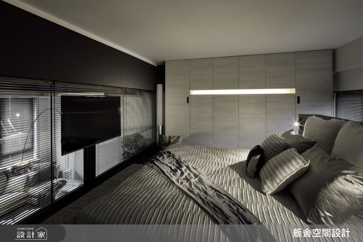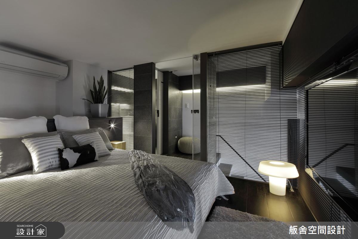 設計師善用挑高四米的優勢,採木百葉搭佐清玻璃型構隔間,增添上下層的視覺通透感,並挹注極簡與工業風元素,引用純白文化石及陽剛鐵件,創造充滿個性的低彩質感;餐廚則與中島結合,不只是女主人的料理天地,更可作為居家使用的工作檯,於中島上方增設吊架,增加收納的同時亦保有量體輕盈化;電視牆旁,則可通往書房兼客房的多功能領域,考量到未來的變因,不施作過多櫃體,讓空間更可被彈性應用;沿著階梯走上二樓,進入主臥,除了透過床頭窗援引日光,也藉由與廳區連結的窗面互通光線,營造明亮無礙的休寢氛圍,搭佐深色木紋或石材磚面的鋪敘,使小空間顯得極為俐落,坐擁著飯店套房般的高雅氣質!