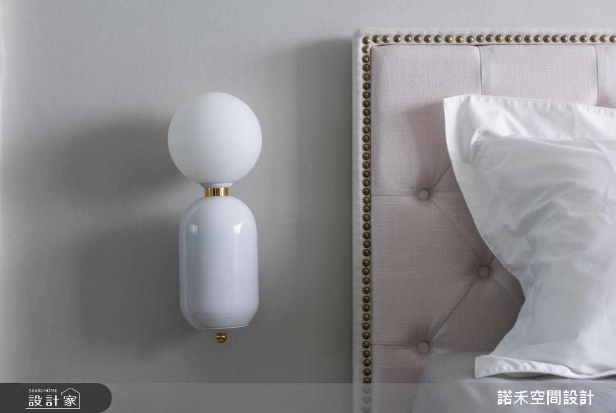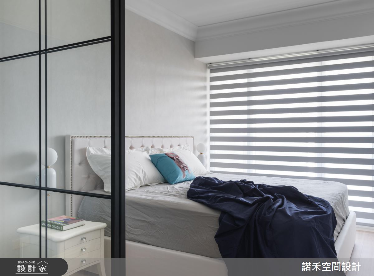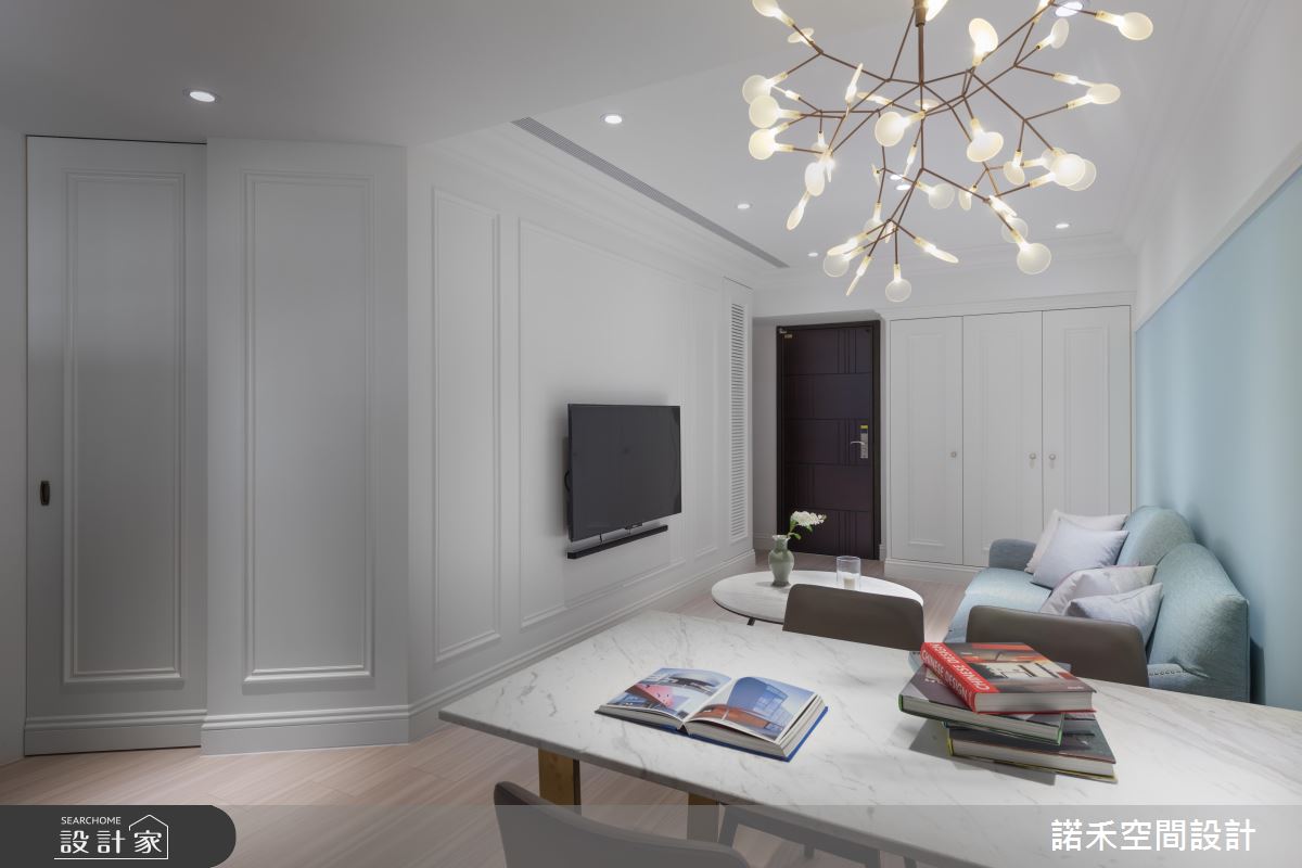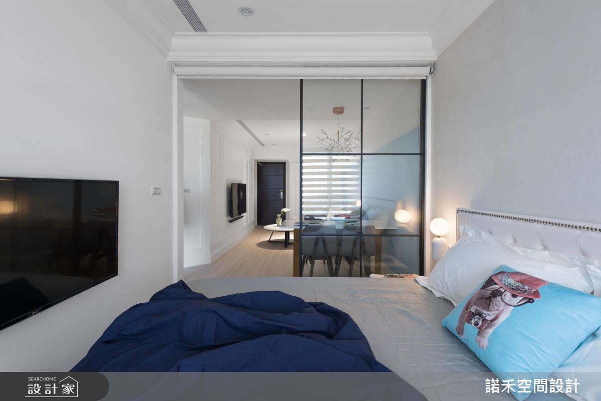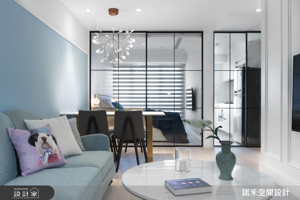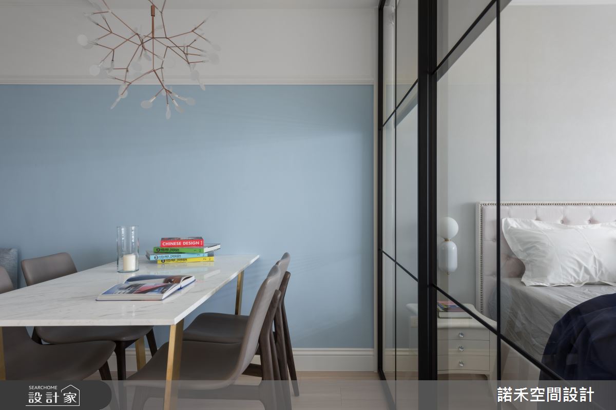最大的設計特色之處,在於採用玻璃橫拉門當隔間,順勢將臥房窗外採光及景觀帶進客餐廳,並藉由通透的玻璃建材,型塑開闊無礙的空間感,同時於壁面揮灑淺藍色調,帶入藍色海洋的浪漫愜意,搭佐簡約不繁複的線板雕琢、不厚重的家具選配,使公領域整體顯得明亮不狹隘;臥房則運用白色作為基底,勾勒出純淨的空間質地,以抱枕、造型床頭燈等點亮視覺焦點,並透過與公領域暢通的視線連結,以及輕柔的木百葉窗配置,促成輕盈好感的寢居質地!