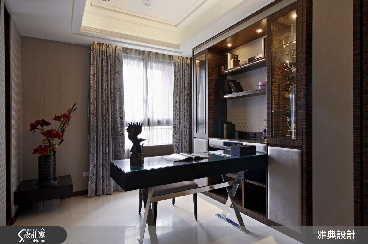書房裡,擺設俐落線條的現代感書桌,一旁壁面則打造開放展示櫃體,嵌燈的光源灑落在書籍與風格物件,流露精緻美感。
