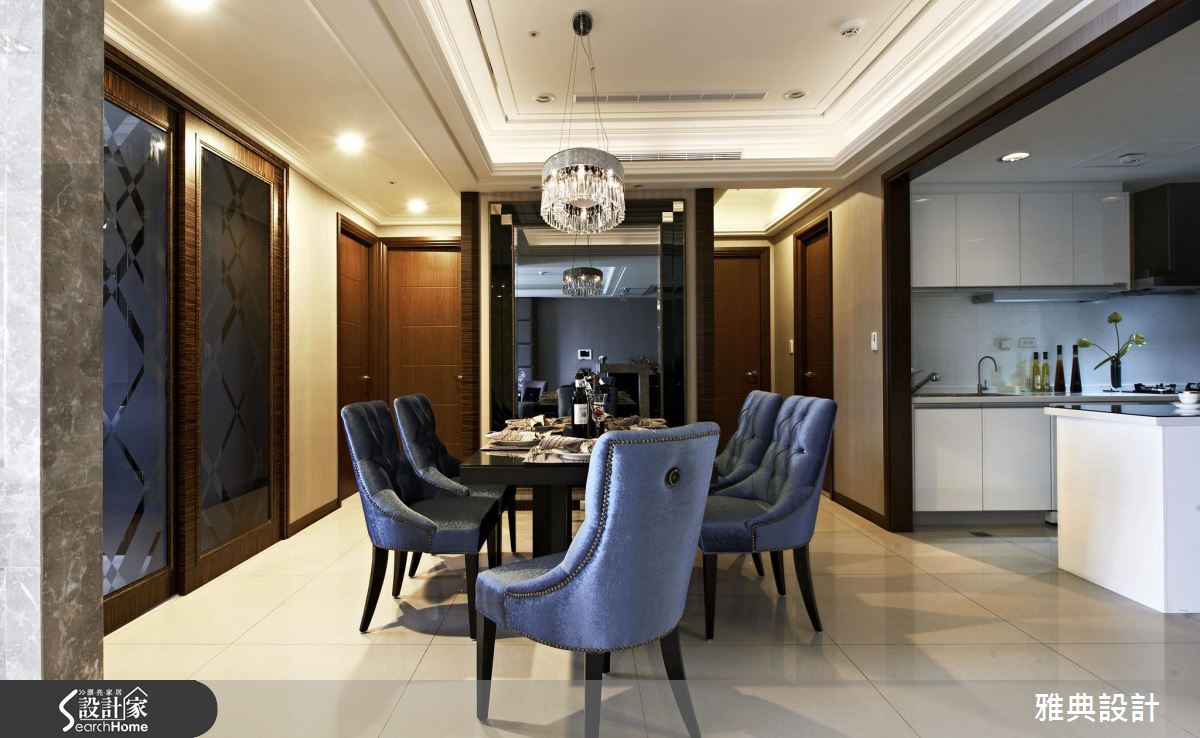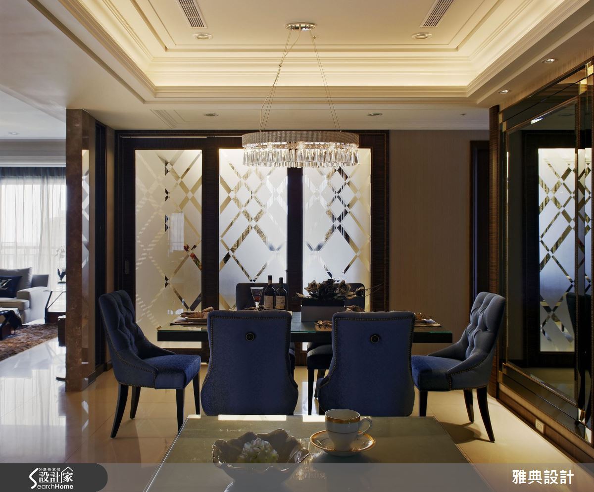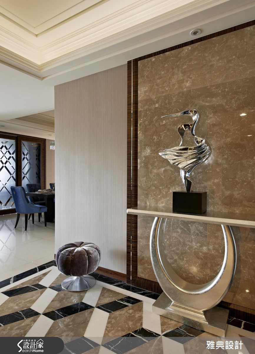 玄關處以幾何線條的大理石地坪鋪陳,搭配鏡面以及銀色雕塑打造的藝術端景牆,烘托氣派十足的迎賓序曲。轉角處透過限量珍藏的水晶展示櫃,巧妙界定出玄關與吧檯,同時展現屋主的時尚品味;我們隨著躍動的光澤,走進大地色系鋪敘的公領域裡,門拱造型的大理石框構出電視牆造型,伴隨兩側鏡面質材的妝點,傳遞漸層視感,體現空間之美,且與石材質感的吧檯相互輝映,彰顯大器之姿;沙發背牆兩側以繃布安排,中央飾以兩幅藝術畫作,賦予奢華新意象;餐廳是整體空間的核心,以畫中畫的概念創造一面主體牆,利用黑、灰鏡飾底,藉由精緻的金箔畫框收邊技法,讓視覺有不斷向外延伸之效;餐廳的另一側則透過拉門設計,區隔出書房領域,拉門以菱格紋的視覺造型,同時兼具透光與隱密性,透亮的質感更展現輕盈、精巧之美。