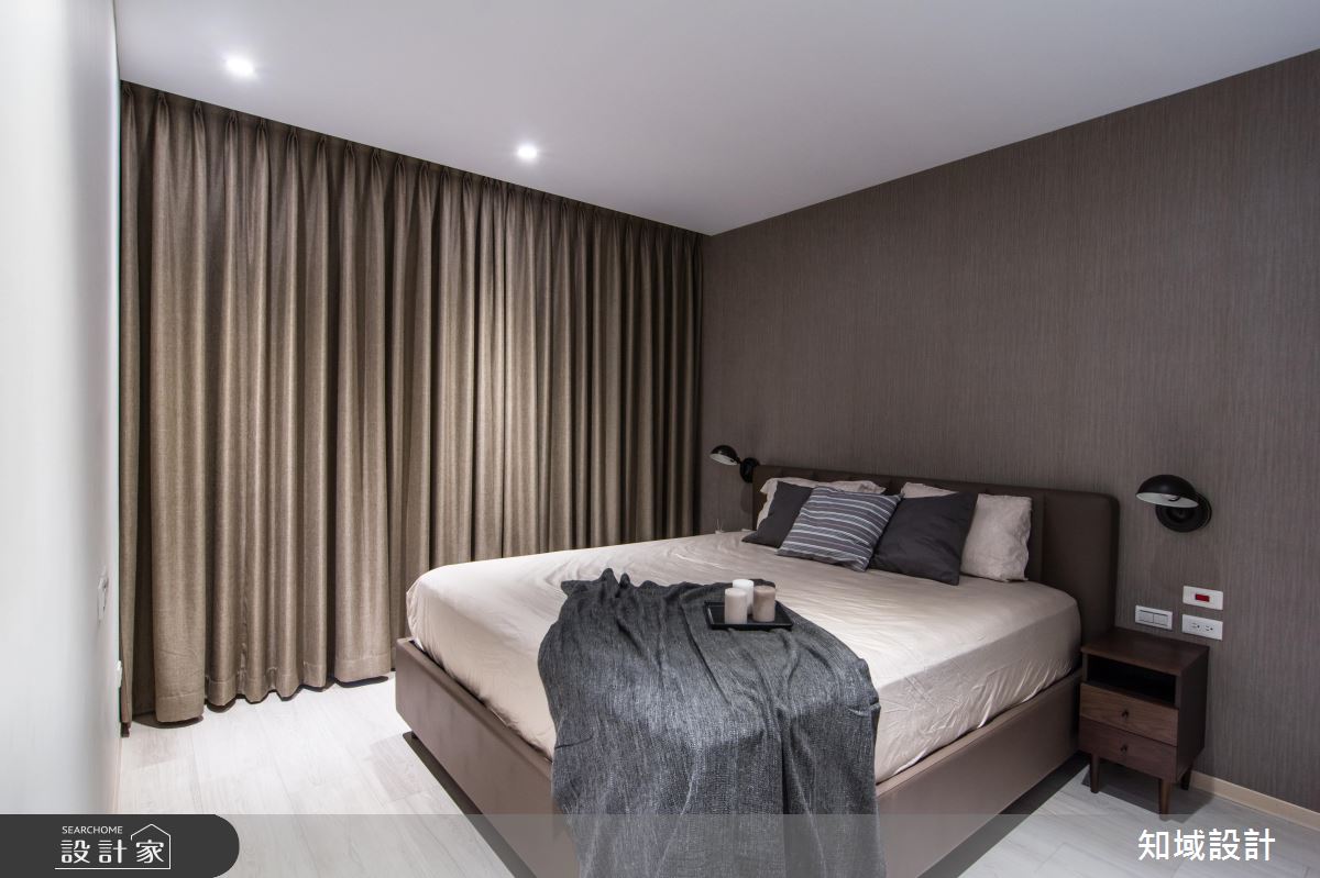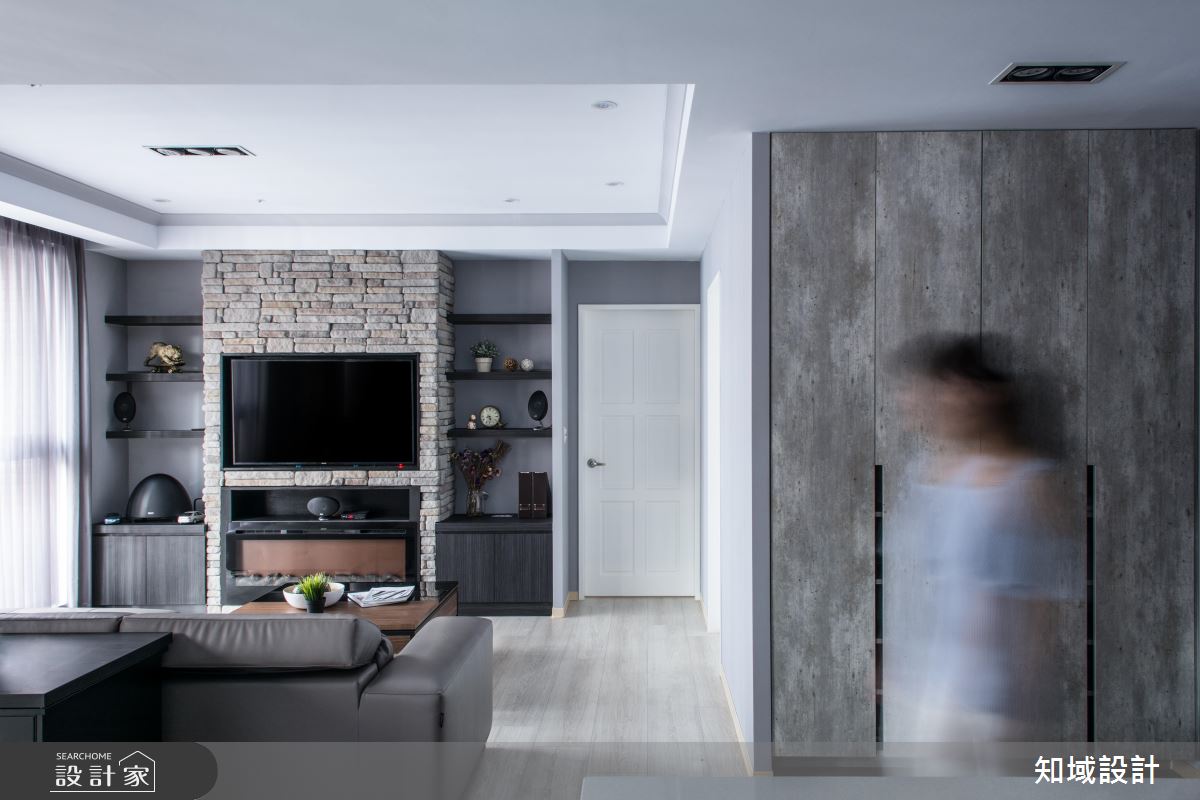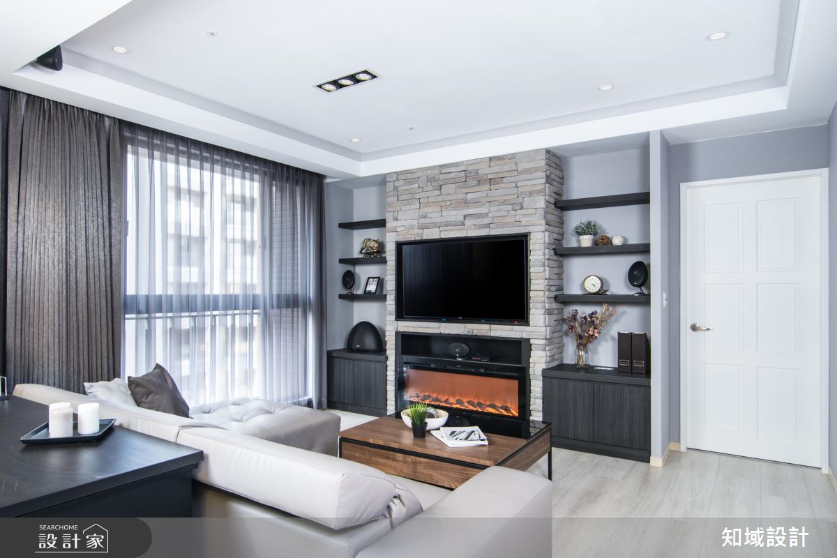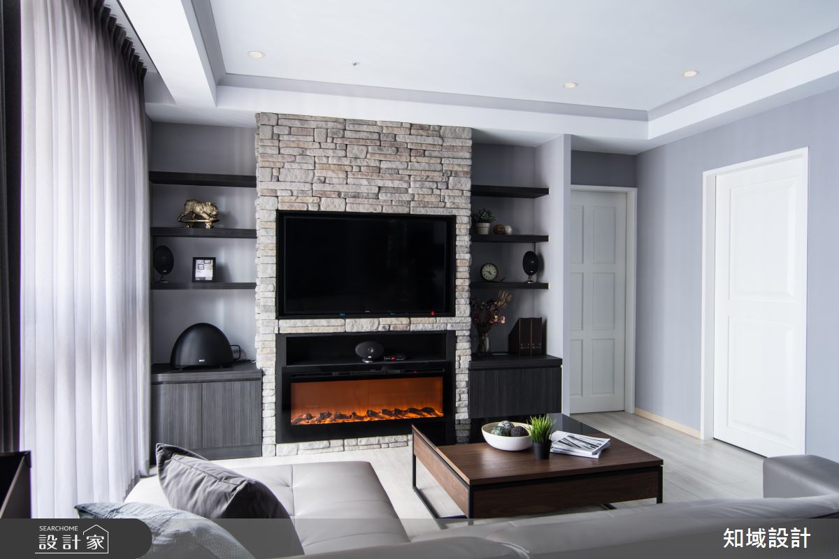 玄關處以與廊道平行的大面積木紋櫃體提供充裕收納機能,右側規劃為客廳及臥房,左側則為書房與廚房。公領域牆面以淡雅的藍灰色塗刷,將帶有復古氣息的粗獷文化石電視牆襯托得更加突出,並結合壁爐與展示收納機能。客廳後方設置開放式書房,搭配大面積純白格狀展示架,成為知性唯美的端景。由於人口單純,以 L 型開放式廚房與中島吧台結合取代餐桌,並利用右方電器櫃達到家電的妥善收納,讓烹飪動線更加緊密流暢。主臥色調以沉穩大地色系為主軸,並打造收納量充足的更衣間。