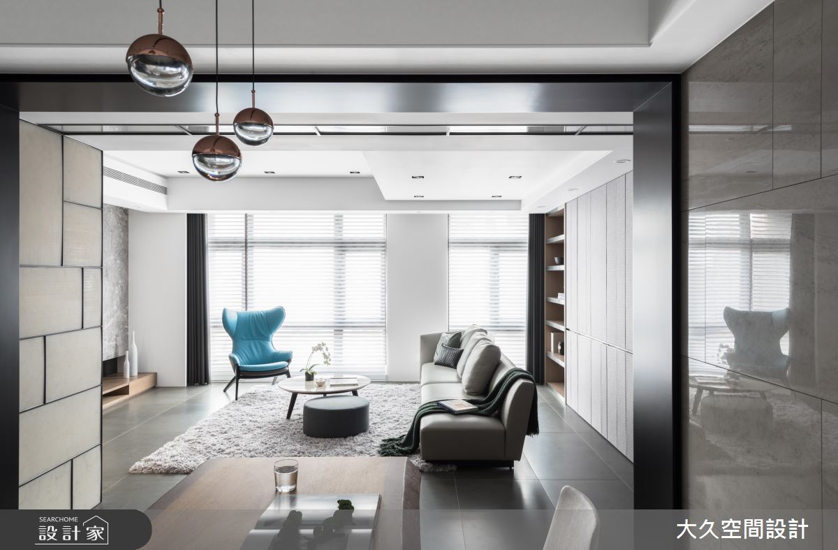 客廳,以灰色大理石建構電視主牆,呈現大器質韻,並於下方安置視聽櫃,強調整個立面的延展尺度,且加入灰階軟件布藝、灰色沙發背牆等,藉此呼應石材色調肌理,鋪敘沉穩的生活氣場,一座藍色單椅則恰到好處形成亮點,達到提亮視覺的作用;過渡至餐廳區,則透過鐵件修飾框景,不僅弱化橫亙的大樑壓迫,型塑領域間的界線,更構成延展視野的效果,並接納來自陽台、客廳的雙向採光,挹注明亮氛圍;同時給予公私分明的動線規劃,沿著客廳沙發牆旁的過道彎轉進入,即可來至私領域地帶,寢臥內,沒有過多不必要的裝飾,以機能齊全做為主要訴求,賦予素樸簡約的鋪陳,營造令人安心的休憩感!