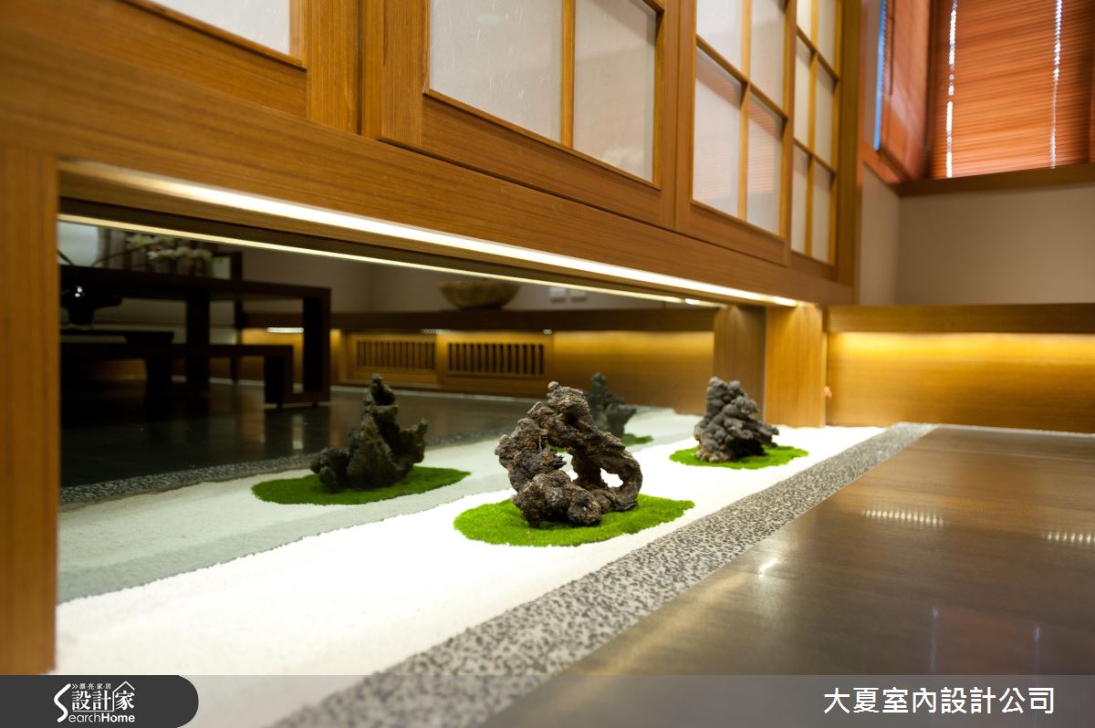 推開大門入室後,沿著地面以抿石子鋪陳的走道直抵電視牆,沉浸在幽靜的日系氛圍裡。架高的木作拉門下方,讓白卵石、人工草皮與奇石創造出一幅雅致的乾景設計,與茶几上的蓮花意象相互呼應;上方的日式格子門則利用四片內嵌雲龍紙襯底,隱約、朦朧的視覺呈現讓人想一窺門後的景致,將拉門敞開後,原來為電視牆設計;沙發背牆以巨型的網狀壁燈點綴,替客廳領域聚焦、定位;餐廳空間洋溢著人文藝術的氛圍,以白色人造石特製一張T型長餐桌,茶壺器皿擺設於桌面,壁面則利用兩排鏤空造型,搭佐嵌燈設計,將屋主收藏的茶具陳列其中,另一側則嵌入菱格狀的木紋書櫃,隨著書籍不同角度的擺放,創造出富層次的美學生活。