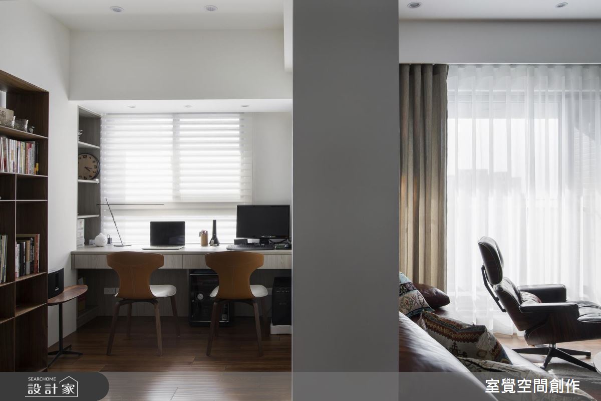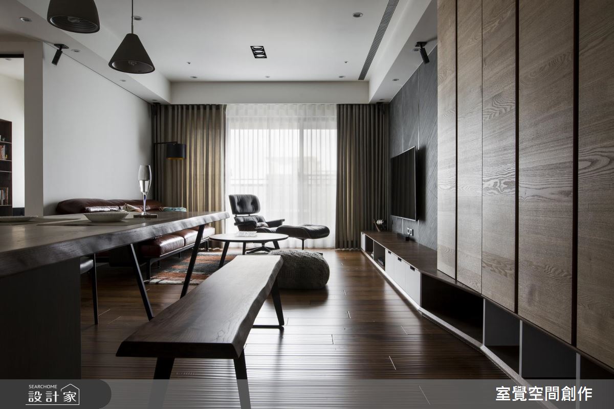 格局為 3 房 2 廳的單層住宅,擁有不錯的採光條件,但由於空間坪數偏小,設計師簡化線條的使用,讓空間看起來簡約而大器,電視牆與櫃體以垂直梳絡的線條相互呼應,鐵灰色的岩質電視牆間或加入些許金屬材質,更彰顯俐落個性。餐廚區則以鐵件玻璃拉門隔絕油煙,並取代常見的中島搭配餐桌形式,直接改以 240 公分的木長桌,讓好客的屋主可以擁有更加寬敞、舒適的空間招待親友和客人。書房是男主人平時上網工作的秘密基地,延續了木質的溫潤質感,以及充裕的收納設計,打造適合專心思考的舒適空間。主臥室則相當有設計旅店的風格,運用木質、灰色壁布,以及溫馨的壁燈,營造簡樸寧靜的紓壓臥室氛圍。