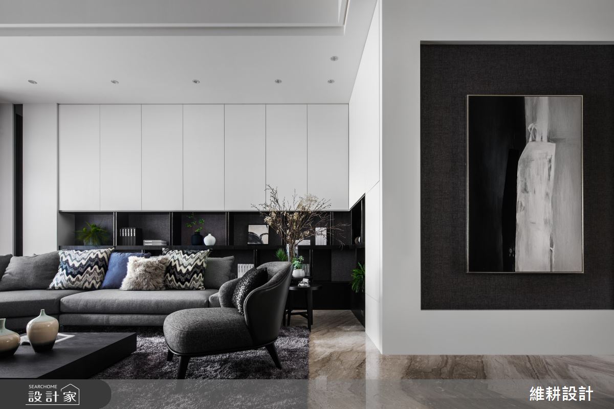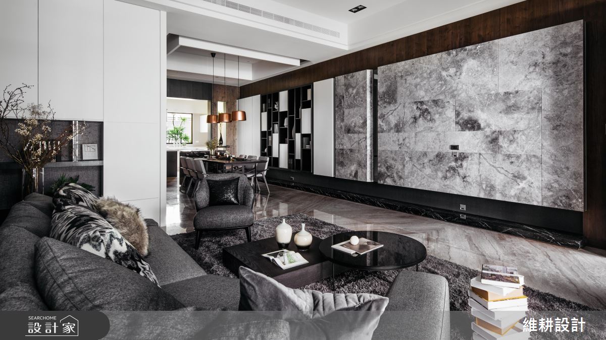 客廳,可見到風格獨具的軟飾搭配,藉由灰階搭佐深藍,構築優雅和諧的場景,一旁則運用落地窗帶來採光及景觀,呼應著室內植栽擺飾,造就生動的生活畫面,並讓大理石立面串聯領域,從客廳一路平整延伸至餐廳,轉換成展示牆背景,點出牆面的雅韻表情;餐區以一座中島挹注機能,搭襯飄逸自然的花藝陳設,以及極具質感的吊燈佈置,落實品味十足的用餐氛圍;臥房內,除了賦予偌大的空間感,更配置書桌、起居、更衣間等飯店式機能,再加入層次分明的場域佈局,使視覺可一路與戶外陽台連貫,劃出充滿延伸性的寢居軸線!