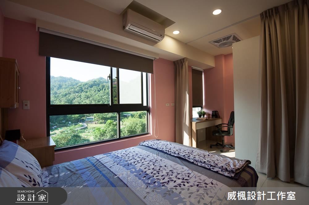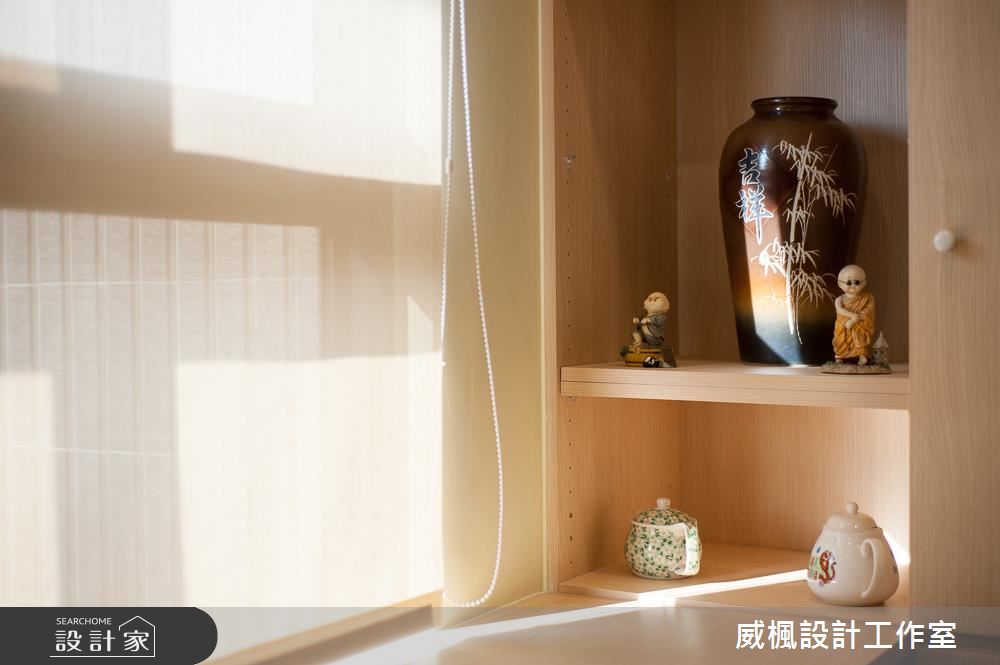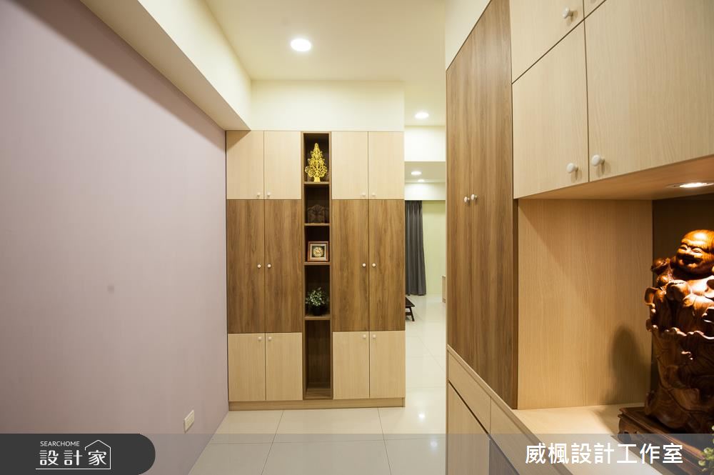 入口處,設計師以系統櫃規劃鞋櫃,運用深淺木色的相互穿插,點出視覺豐富性,並循序漸進地導引入內動線;公領域,則配置大量的系統櫃,挹注機能與美感,並讓電視牆結合收納櫃體,突破制式的立面表情,後方則可延伸進入佛堂,透過玻璃建材營造光線流動,讓此道牆面發揮極大的實用價值;餐區則搭配木餐桌椅與簡約餐邊櫃,留有充滿餘裕的走道空間,帶出簡單、俐落的場域視野;私領域內,則藉由木質櫃體型構溫潤質感,搭佐粉色系的跳色床頭牆,使室內盈滿甜美氛圍,並給予窗面採光、綠景陪襯,打造療癒放鬆的休寢時光!