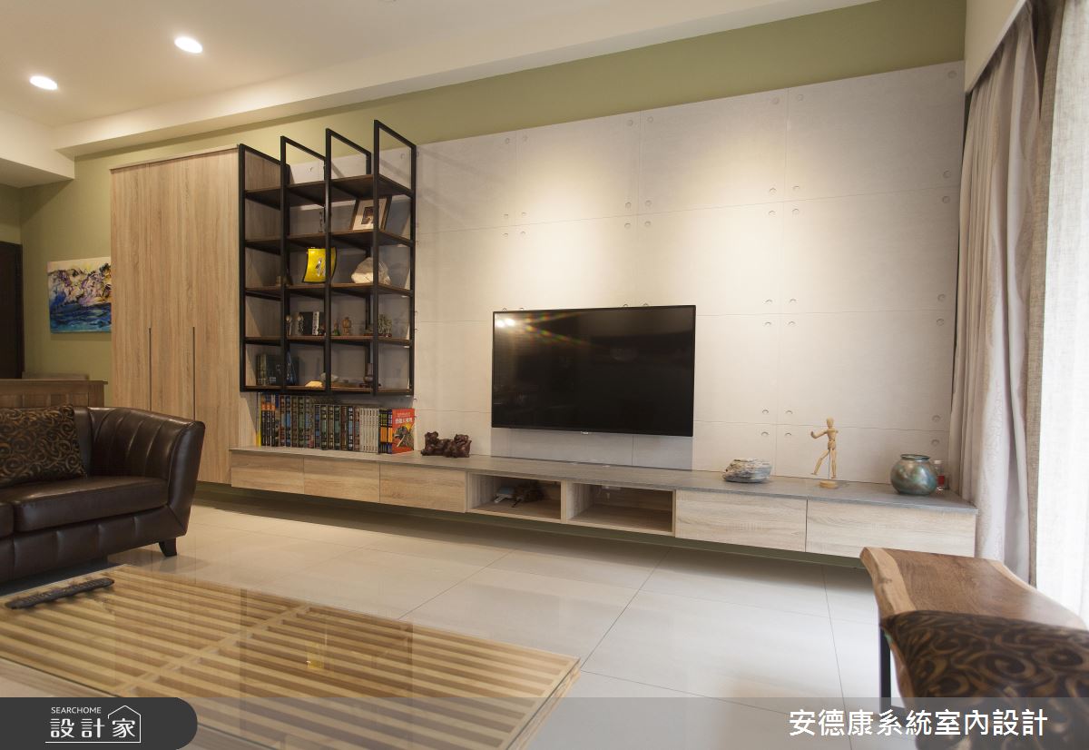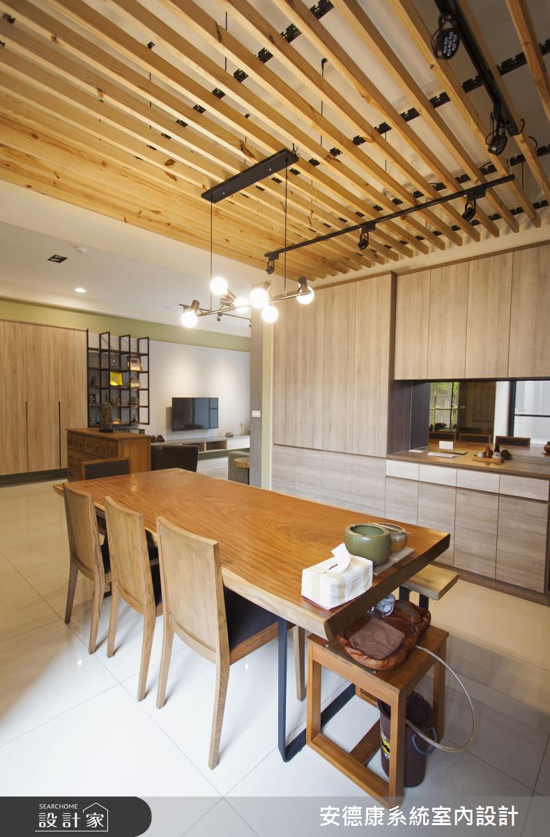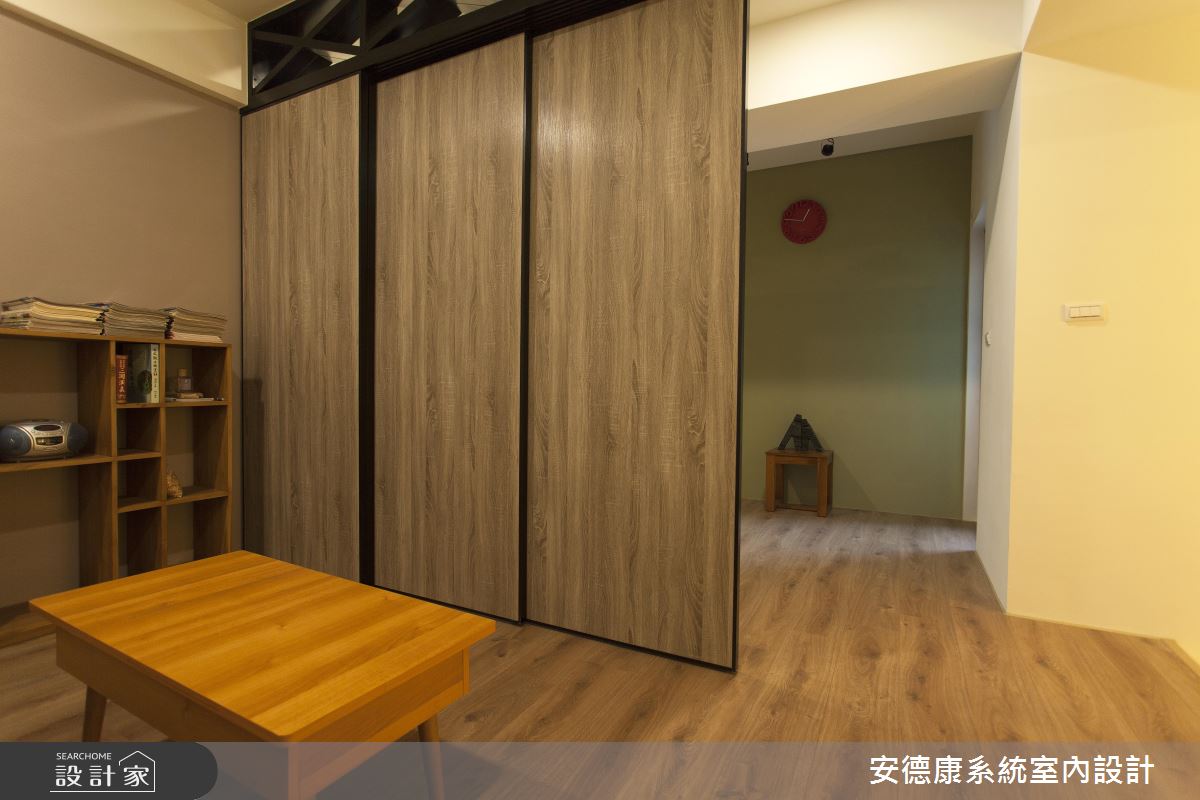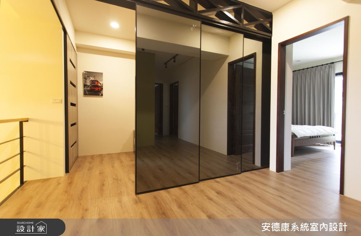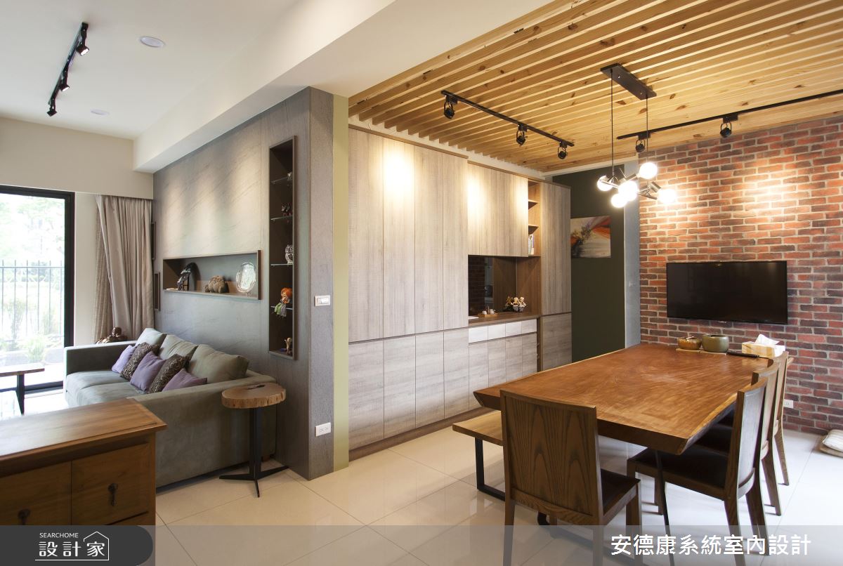 一樓玄關入口處,藉由一座端景櫃挹注機能,並界定出玄關、廳區的各自範圍,電視主牆則採以仿清水模水泥板鋪陳,彰顯寧靜質樸的簡單背景,再運用系統板仿鐵件鏽紋架構懸吊式層架,創造出復古的視覺亮點,沙發背牆為了修飾掉上方壓樑,透過仿板岩磚的系統板材構築立面,佐以中段鏤空設計,形成生動的展示平檯;步至餐廳,選用大面積仿紅磚文化石砌築主牆,並配置壁掛式電視,同步網羅視聽娛樂,且特選的實木大方桌,無形中與木質格柵天花產生呼應,凝聚有如鄉村般的溫潤氣氛;二樓起居室,以超耐磨木地板塑造溫柔氣氛,另設置活動推拉門,背面刻意作成茶鏡材質,讓此處不僅兼具起居及獨立客房之用,也藉著鏡面放大空間感,放大場域的視覺比例!