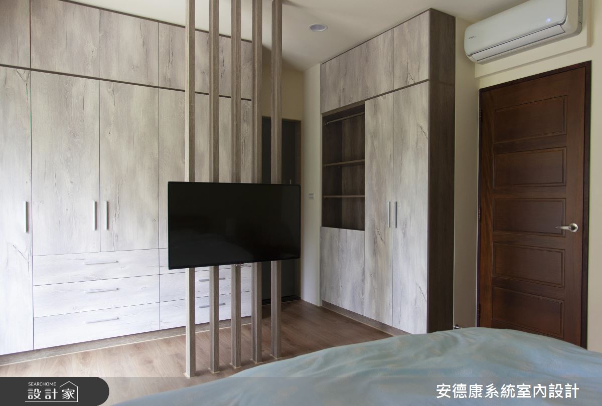主臥內,礙於坪數限制,故以衣櫃搭配壁掛電視,除了劃出睡眠與更衣機能的隱約界線,也在造型格柵的延伸下,拉長了空間垂直向度!