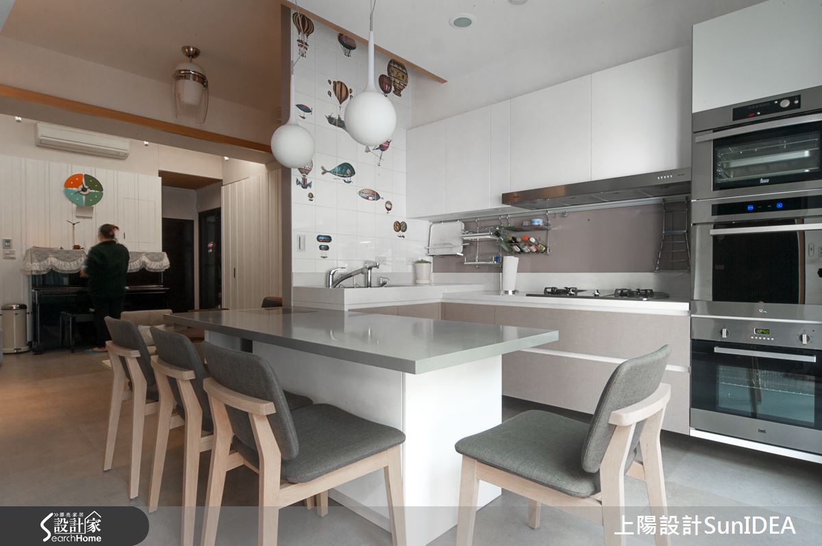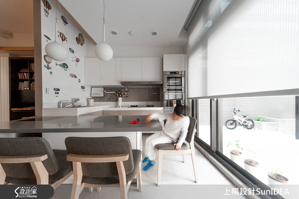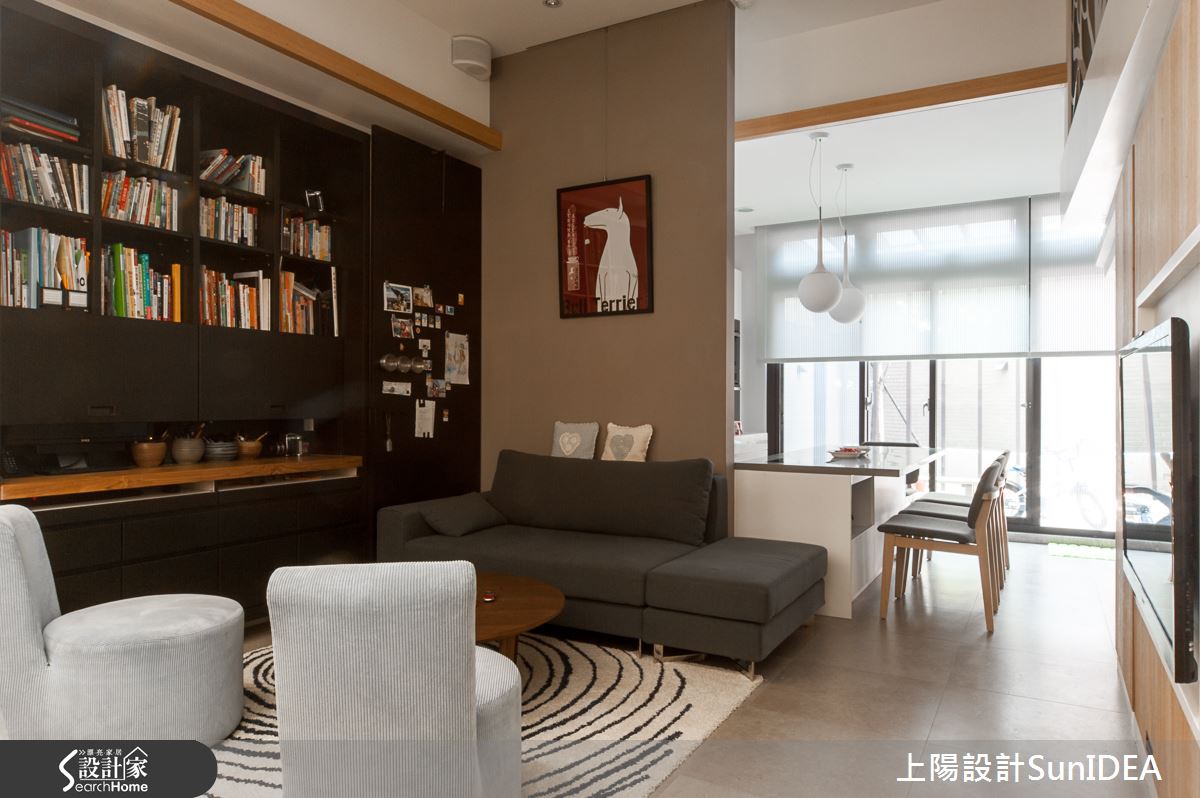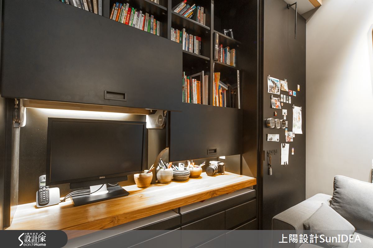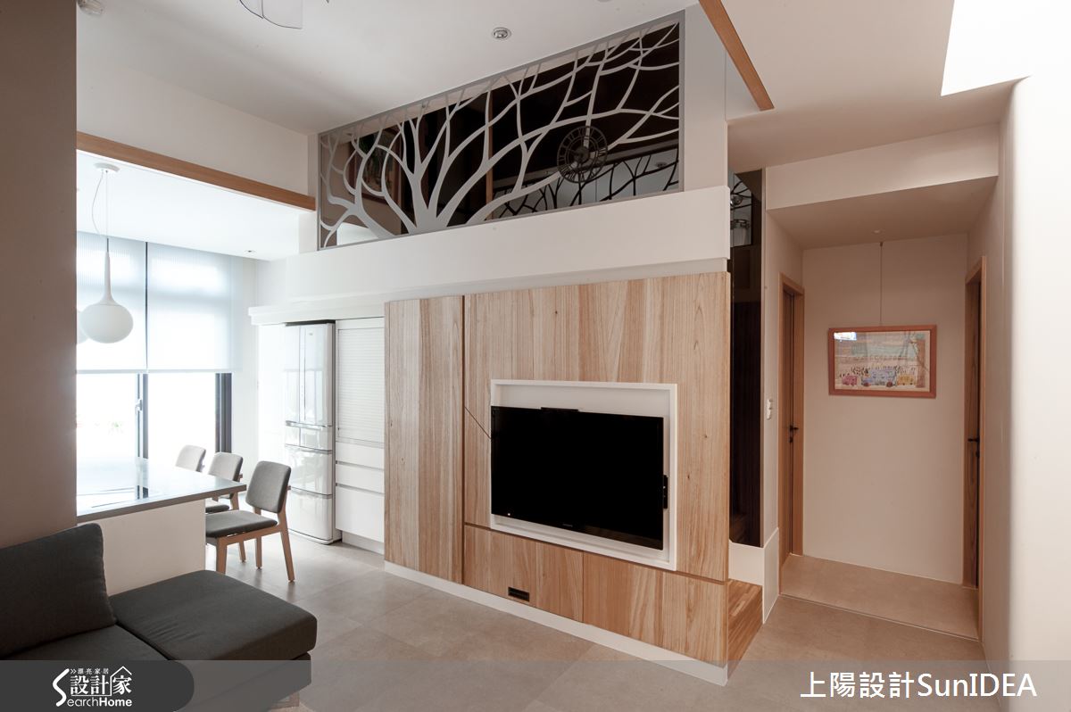 客廳區,將電視安嵌於木質主牆,於上方銜接黑鏡與鏤空枝葉語彙,帶出自然而生動的意象,使人不自覺將視線聚焦於上方,達到延展空間高度的作用,而此牆更同時容納電器、收納機能等,且兼具樓梯側牆功能,在多主題的整合之下,聰明精省居家坪效,而沙發旁的立面也充滿妙用,不僅是書櫃,也兼作展示留言板,拉開櫃門,更可見被隱藏的電腦屏幕;來到後方餐廚場域,則運用一小面隔間與廳區稍作界定,維繫開放式的互動情境,並給予淺色基底和落地採光,闡述明亮好感的用餐氛圍;主臥內,以線條帶出俐落韻致,展現極簡的都會風情,再善用空間高度,於睡眠區上方配置小巧夾層,使臥房內的可運用面積更具餘裕!