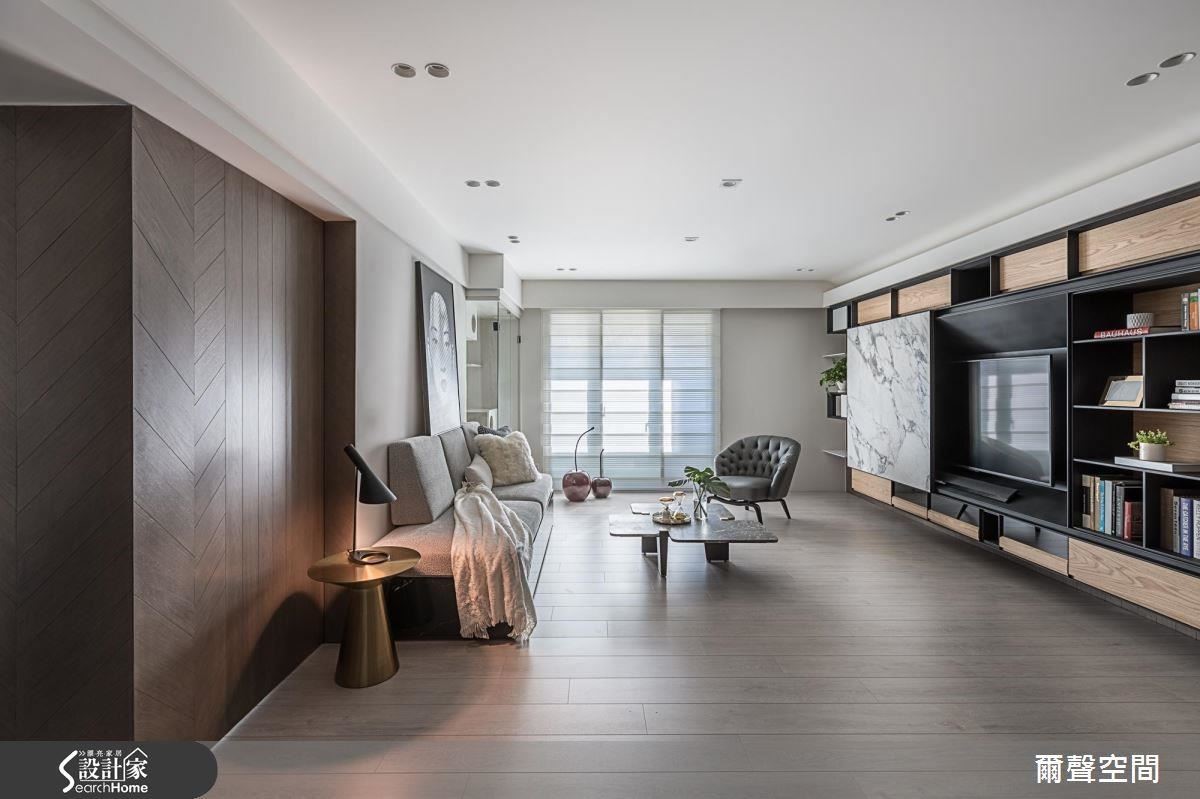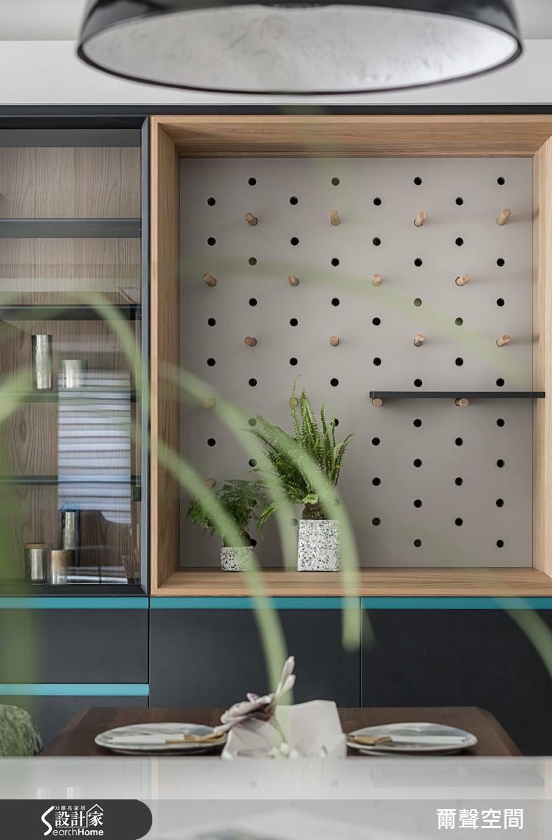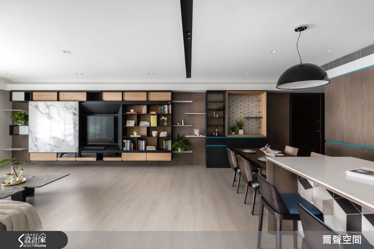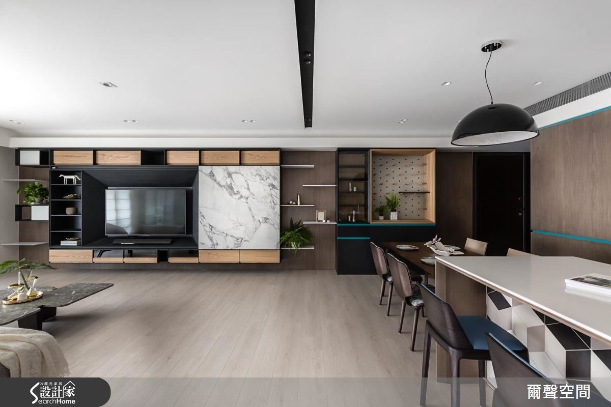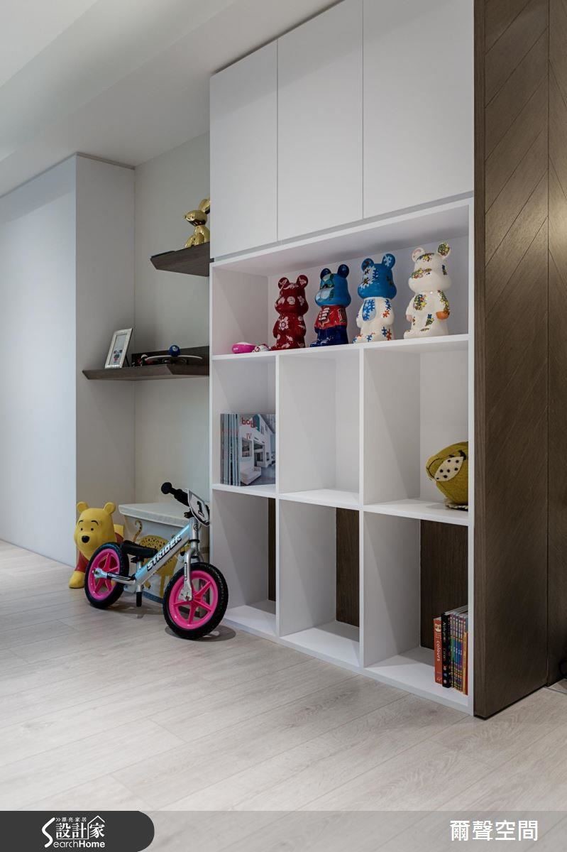 電視牆其實包括多種機能,以深淺木皮搭配出鞋櫃、展示櫃、書櫃及電視區,選用進口 0.6 公分超輕薄仿銀狐大理石紋的磁磚當門片,是男主人極為滿意的選擇。而爾聲設計總是會為屋主留一塊彰顯自我的空間,這個展示櫃有著靈活運用的層板,可以擺放旅遊買回的小紀念品,或是懸掛孩童們的遮陽帽以及鑰匙,下方以倒角設計,貓咪無法立足就不擔心牠們搞破壞了。