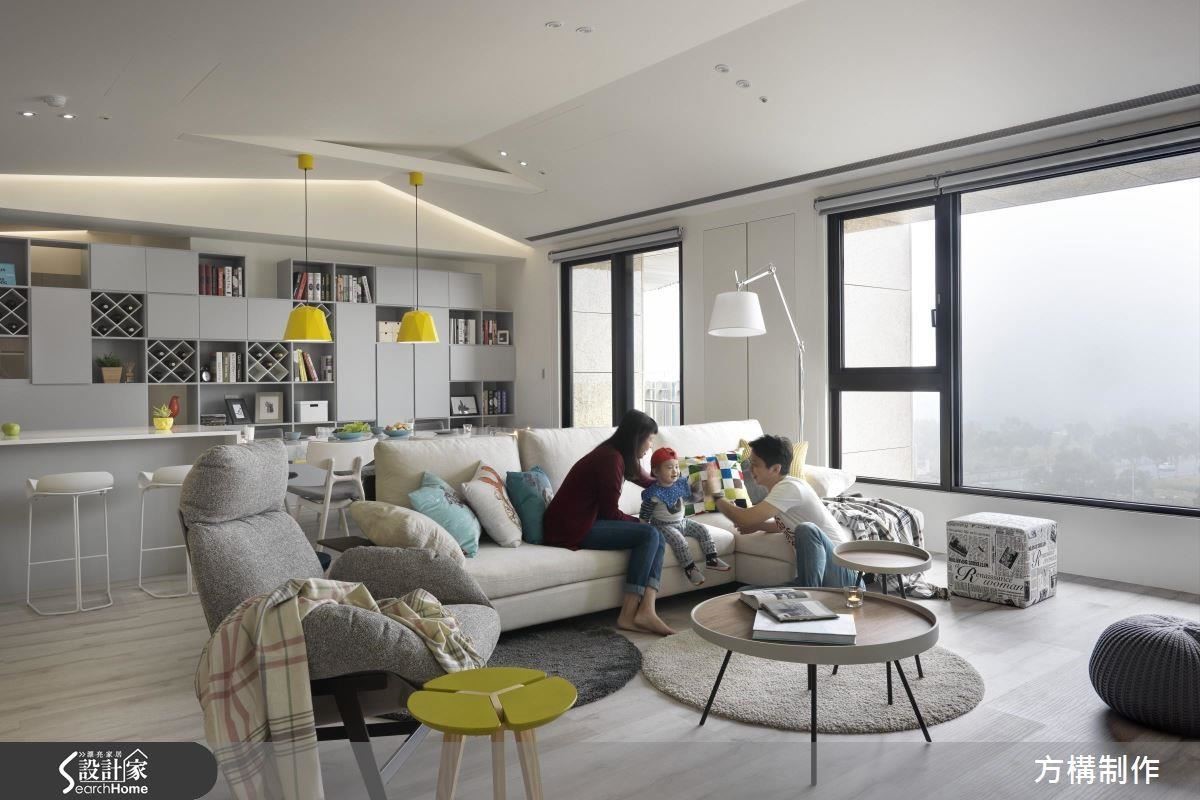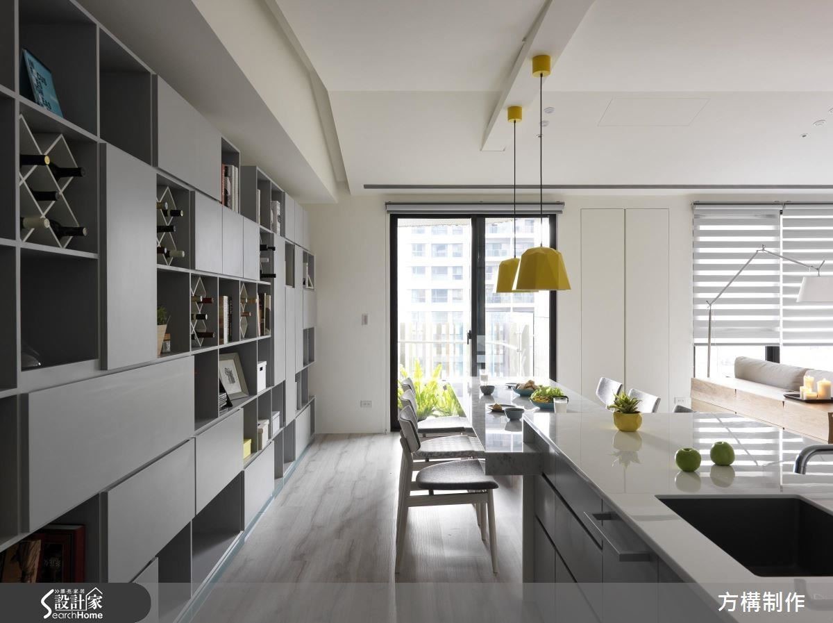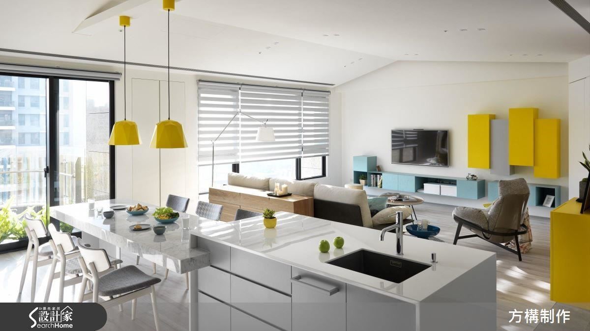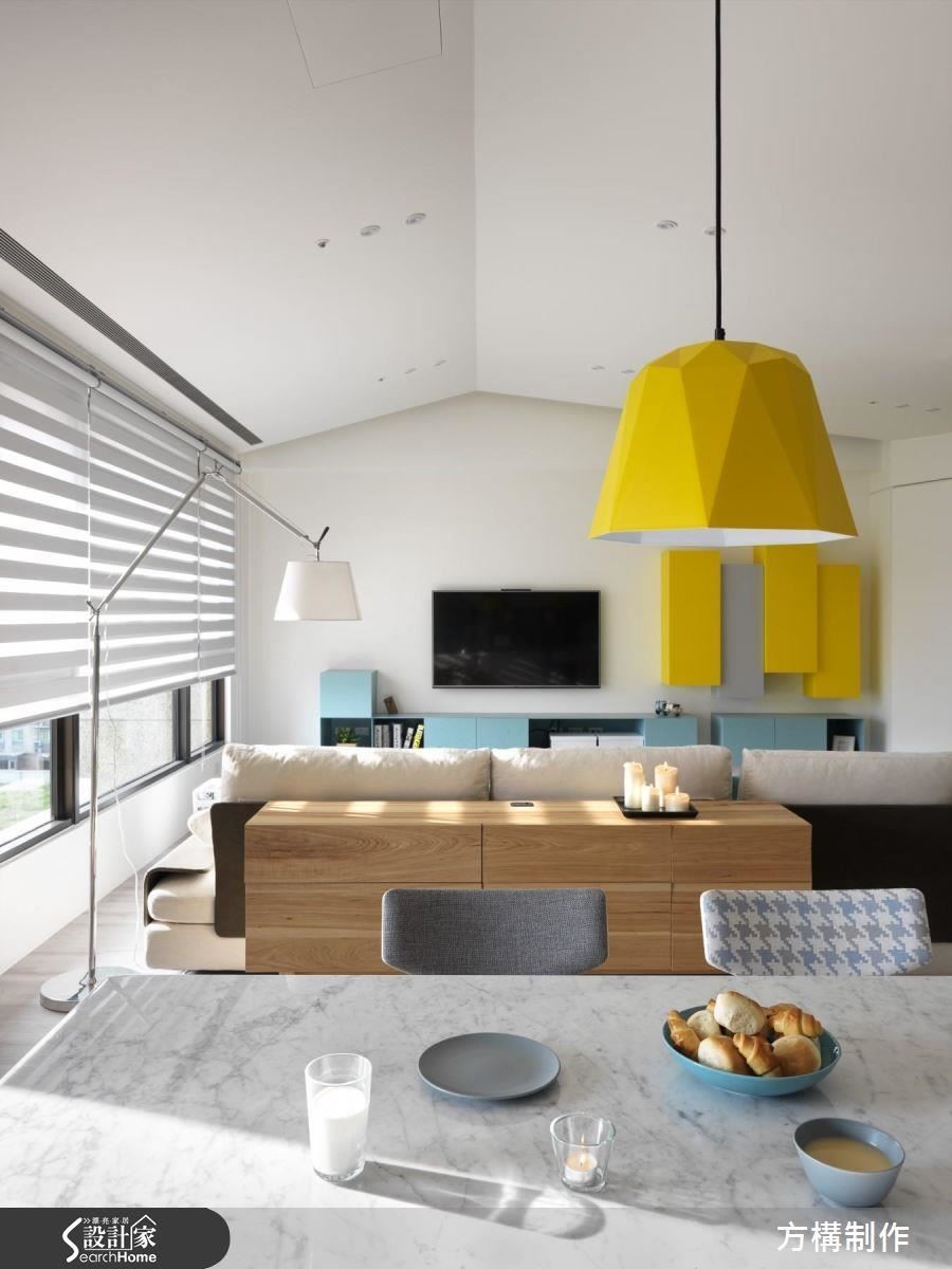 方構制作空間設計對豪宅的重新定義,不在於空間本身之大,而在於放大的空間感;不在於奢華貴氣的質材,而在於心靈的享受感;若從一此角度來看,房子本身就必須俱備足以設計出豪宅的基因。以此案 62 坪而言,即因家庭成員僅三人,得以大開公共領域的格局,加上天花板原本的管線裝置,正好給予拉高屋頂的條件。當天地牆都向外擴展之後,即可運用巧思,大玩鮮豔的跳色、不規則的線條,以延伸放大量體,加強了空間的氣度,也增添生活更多的趣味性和自由感。