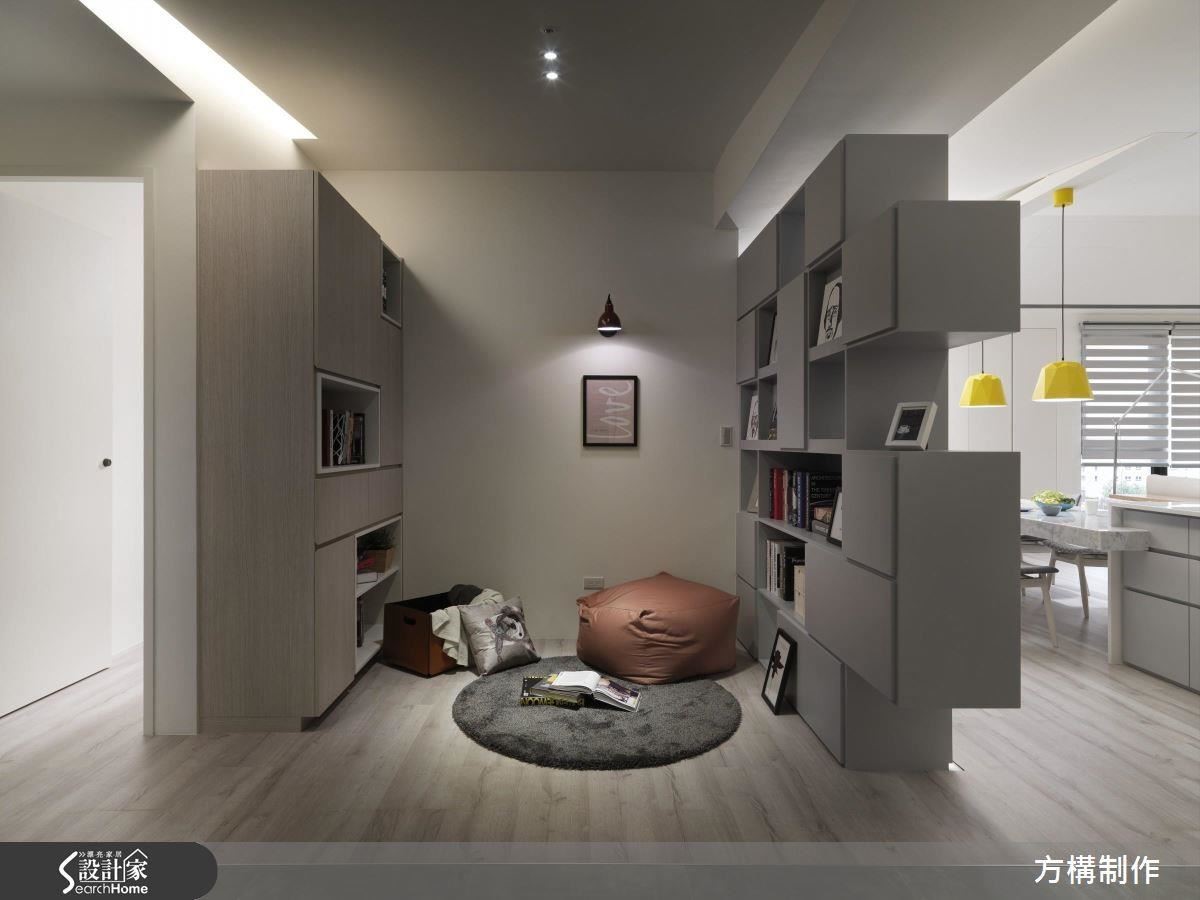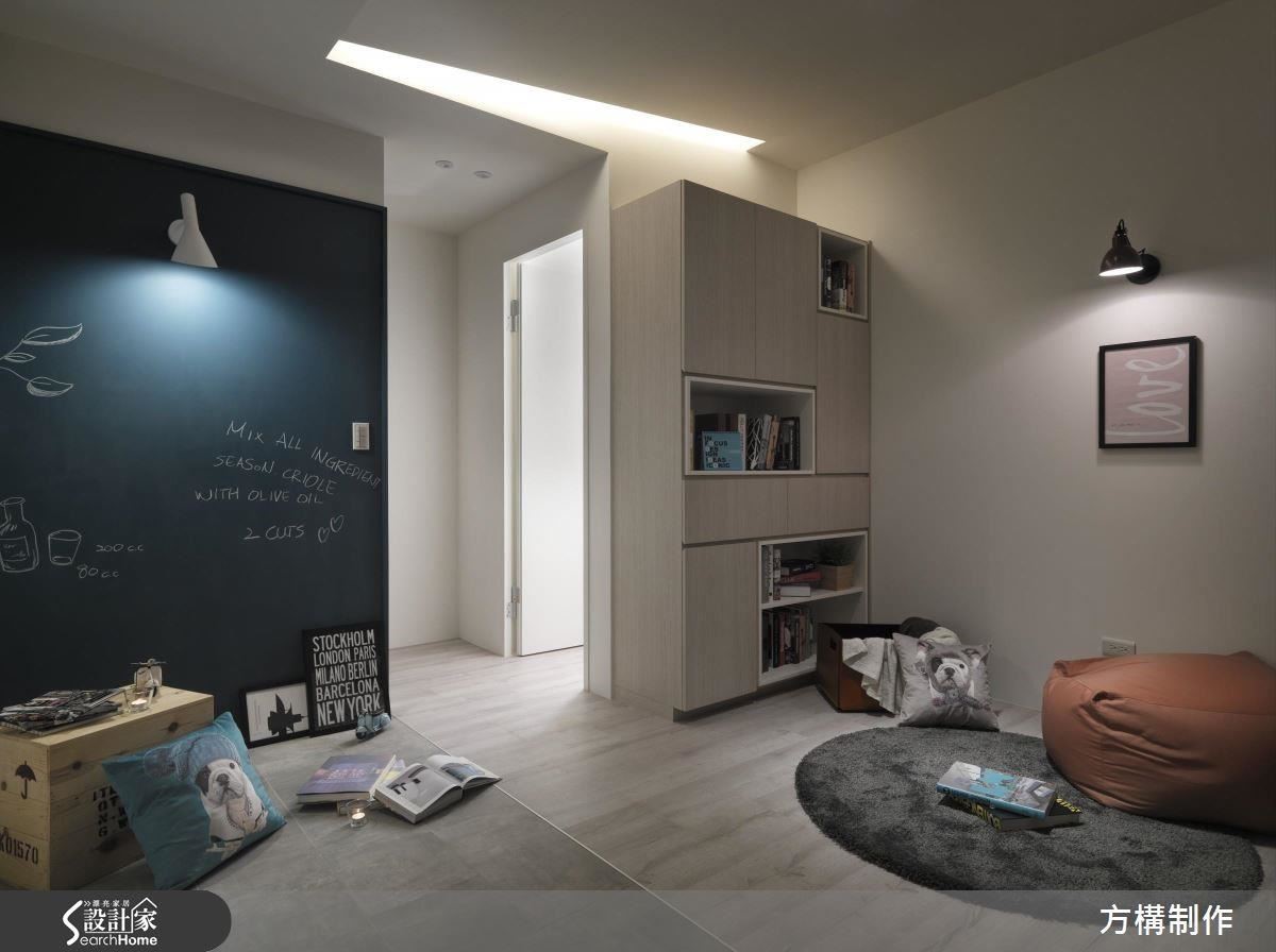 客餐廳後的閱讀區,以開放格架和門片設計為牆,形成若隱若現的仿屏風,並可兼放書籍、零食的多功能,而後方再多一層櫃架,更讓此區半開放包覆如溫馨的小角落,享受隨手取閱的疏懶氣息;櫃上的菱形格架則用以置入紅酒,讓坐於輕食區也享有品酒的浪漫。而巧妙的亦在於和閱讀區相鄰的遊戲區,簡單的黑板牆設計,就可讓孩子信手塗鴉,可說明此區濃縮了每一個家庭成員各自獨立又相融的多元樂趣。