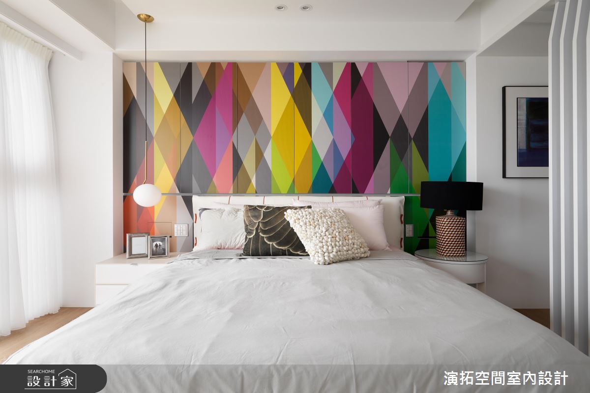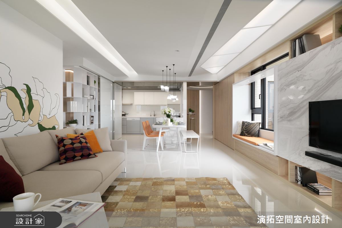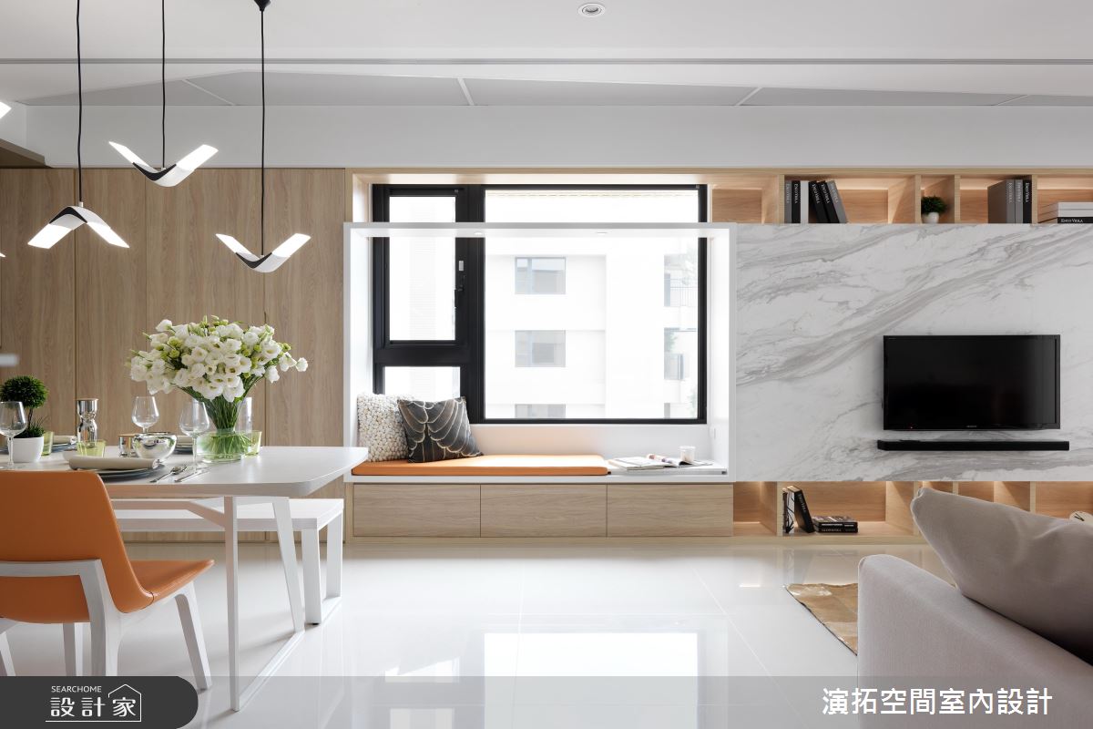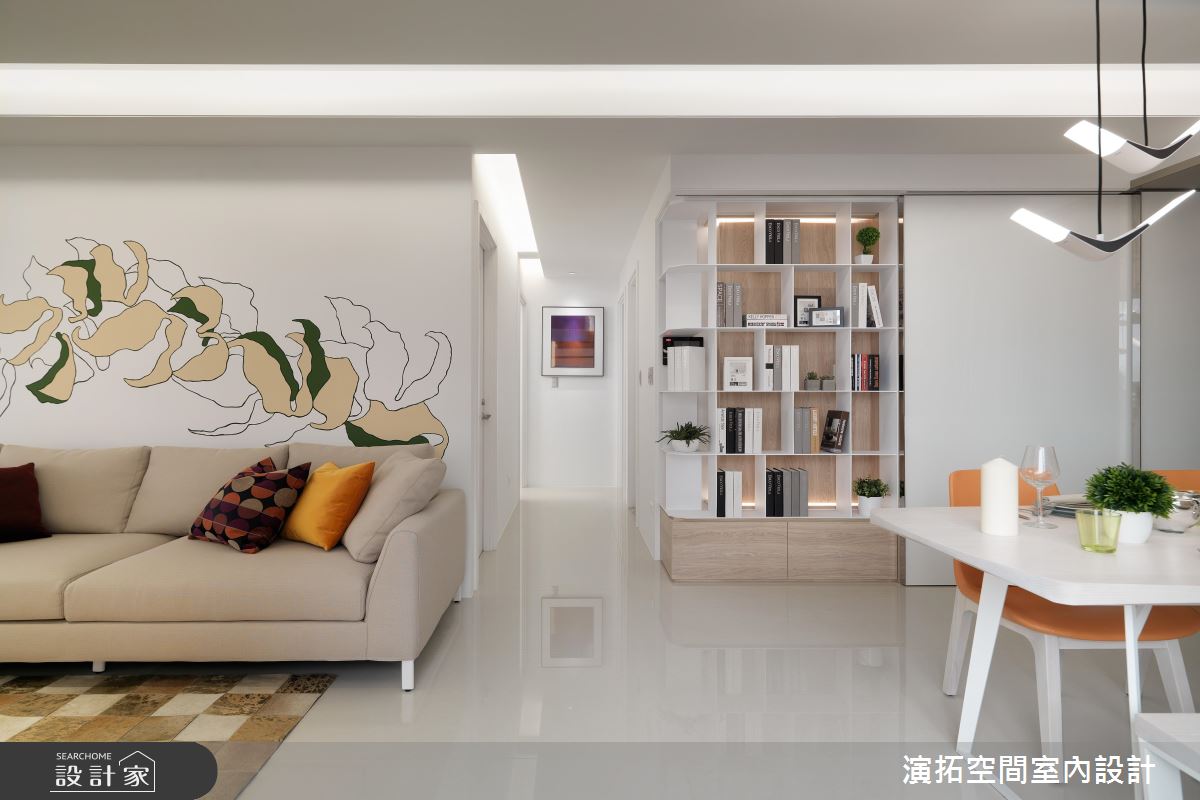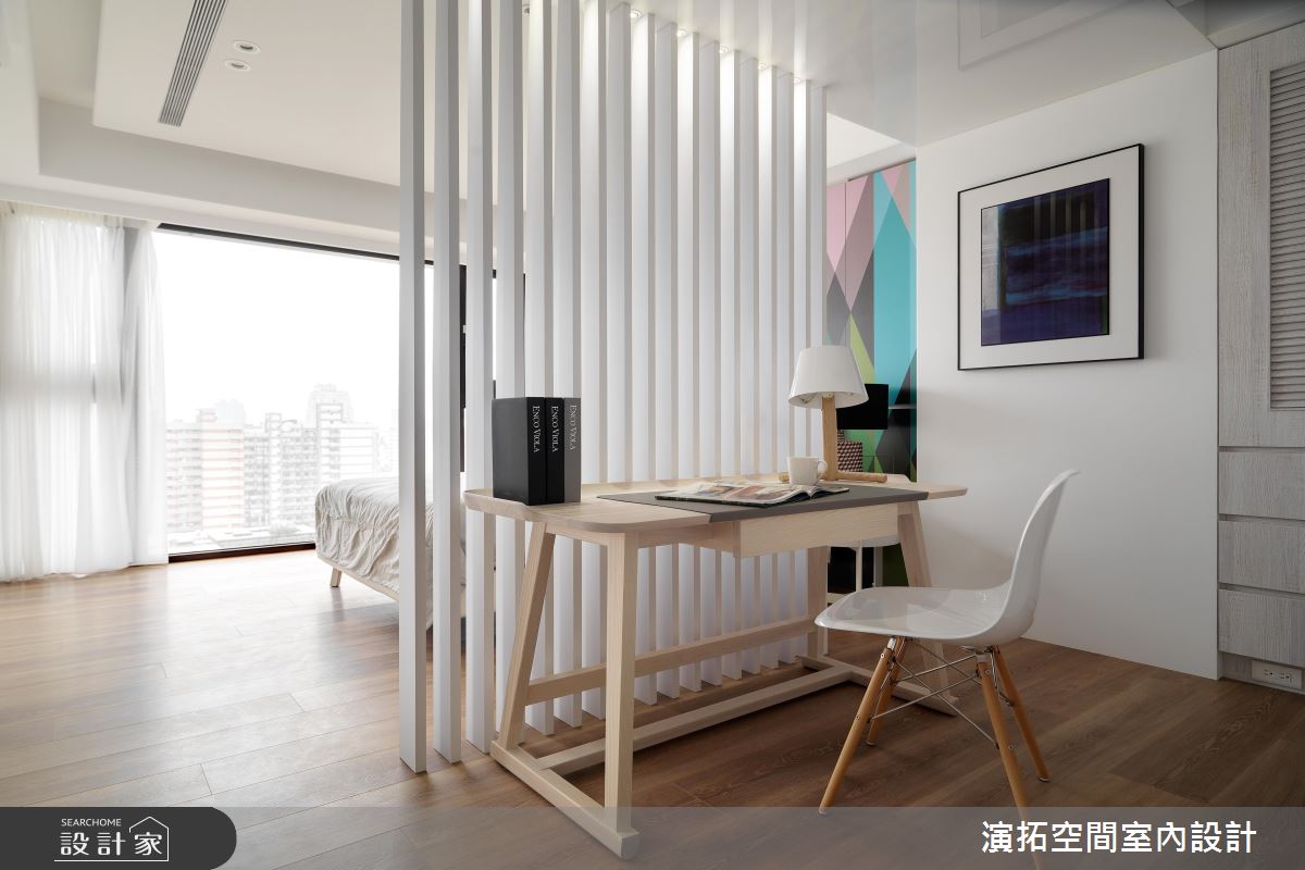 玄關處,加入了圓弧型的格局設定,搭佐鏡面及穿透式屏風,導引循序漸進的居家動線;步入公共場域,則可見櫃體、電視牆連成一氣的表情,從木皮過渡至窗邊臥榻,來到大理石主牆,再搭配天花板的延伸燈帶,拉闊了廳區的寬廣尺度, 沙發牆那優雅內斂的花卉圖樣,則促使視覺層次更為豐富;餐廳部分,考量到屋主有許多馬克杯收藏,特地配置了展示櫃結合餐水櫃,讓屋主的杯子有了容身之處,不只美化視野,亦兼具機能實用性;寢臥內,承襲著雅致的白色基底,於床頭鋪陳大圖輸出,以多彩色塊造就活潑的牆面風貌,並做出格柵隔屏,用以界定書桌與睡眠區範疇,同時維持著場域之間的視線穿透性!