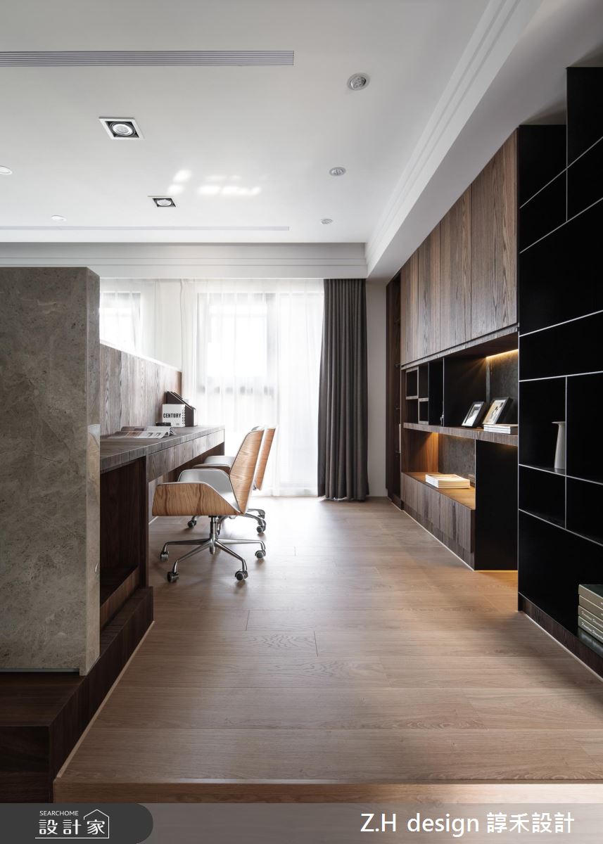 入口處,設計師透過煙燻木皮結合燈光烘托,強調靜謐的端景意象,鋪展出雋永的人文風景,來到公領域,則可見中性的彩度鋪陳,開啟沉寧氛圍,並利用電視牆定義書房與客廳場域,搭配著細緻的溝縫修飾、建材的天然紋理,闡述內斂而精細的空間表情;書房刻意架高地坪,以大面積木皮型塑溫潤風情,且刻意讓書牆呈現大小不一的格櫃造型,搭佐高級的單椅陳列,充滿質感且溫度十足;餐廳則承襲著木質肌理,同時妝點一面深色鏡面牆,既維持一貫的沉穩色調,也促使空間感放大,更添延伸感;寢臥內,運用半高床頭牆作為界定,保持睡眠區與開放更衣室的獨立性與穿透性,除了滿滿的收納機能外,一角更結合梳妝檯規劃,將一切夢幻機能統整於小小空間之內!