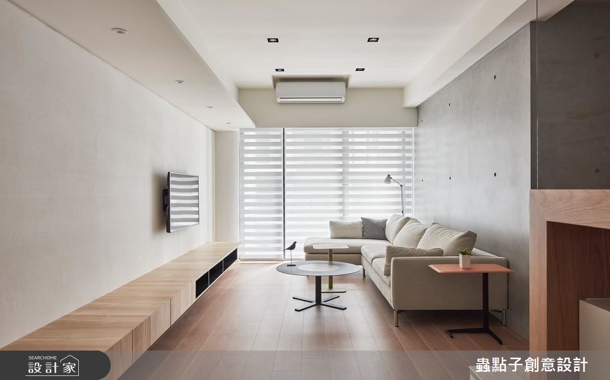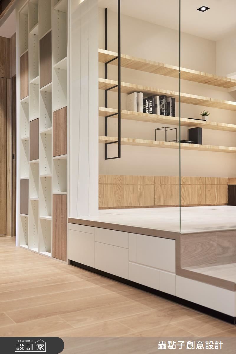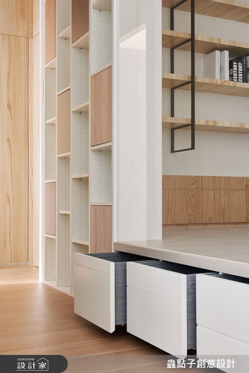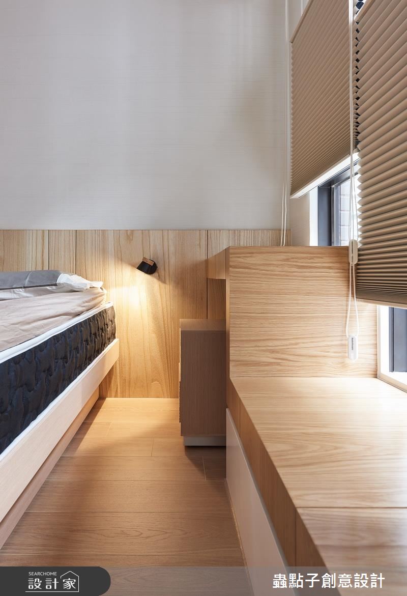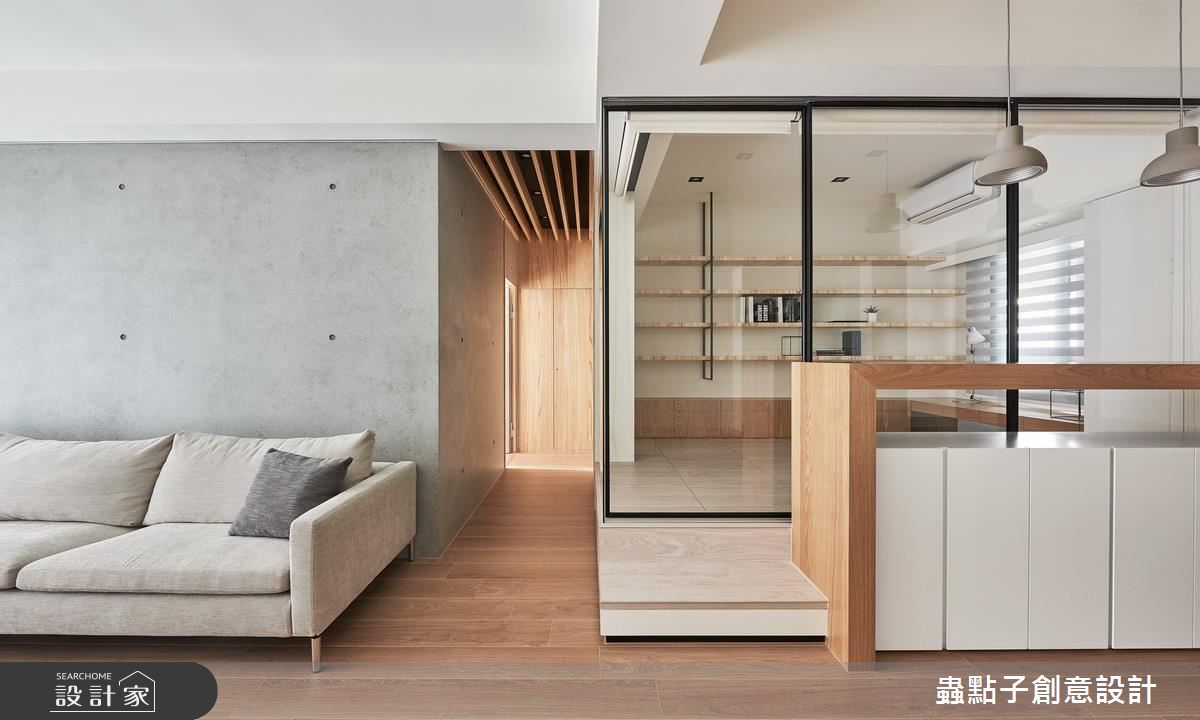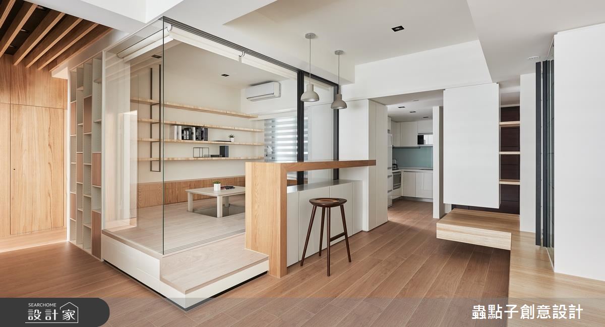 走進這處居所,設計師以純白、木質、玻璃和清水模的灰調元素,構成了清爽、簡約的生活樣貌,全室鋪上木地板,也大幅提升了生活的舒適度。為了打造屋主期待的和室空間,設計師拆除入口處房間的隔牆,改以玻璃和拉門劃分領域性,並將部分吧檯的用餐位置移到和室裡,讓和室空間更加放大;和室內部則設有可收折的小桌,成為全家人閒暇時聚會、聊天的核心聚點;另外,架高的木地板與吧檯檯面下方也能妥善利用,作為日常的收納儲物用途。沿著廊道走進臥室區,承襲了公領域的簡潔線條和色調,一體成形的木質桌面和臥榻,一次滿足兩種生活情境,藉由流暢的線條,也讓坪數有限的臥室看起來更加寬敞。