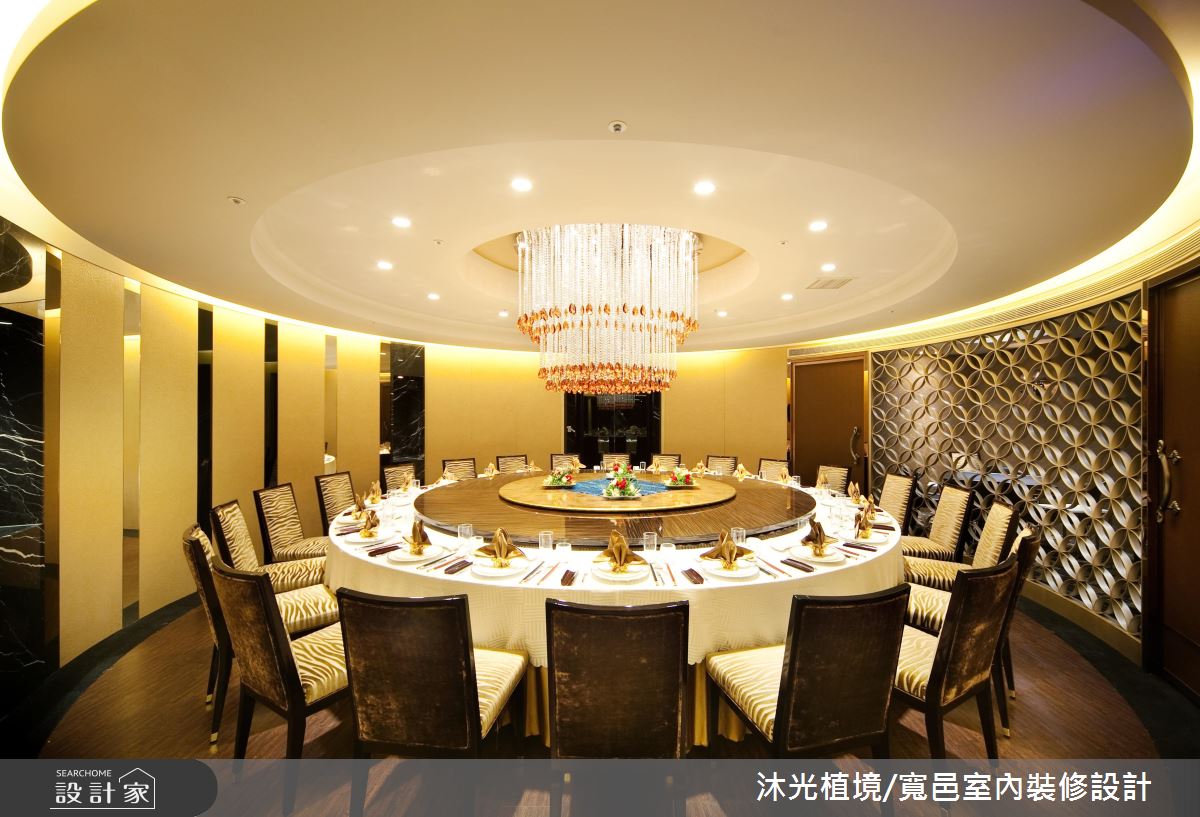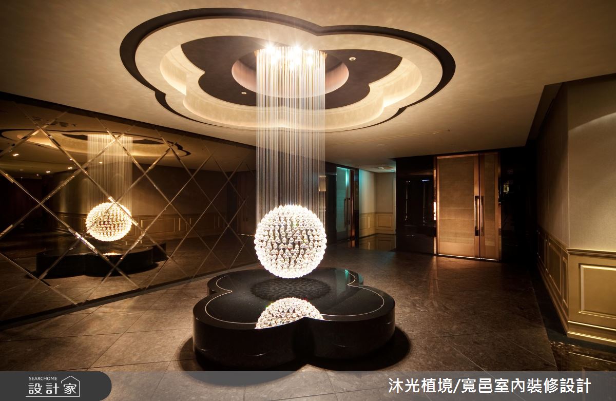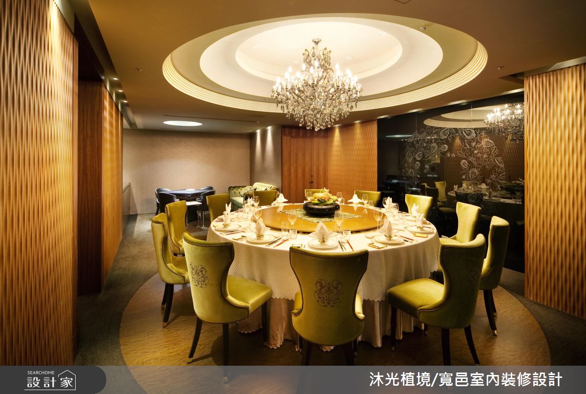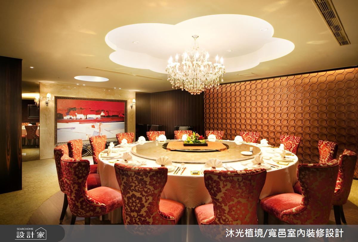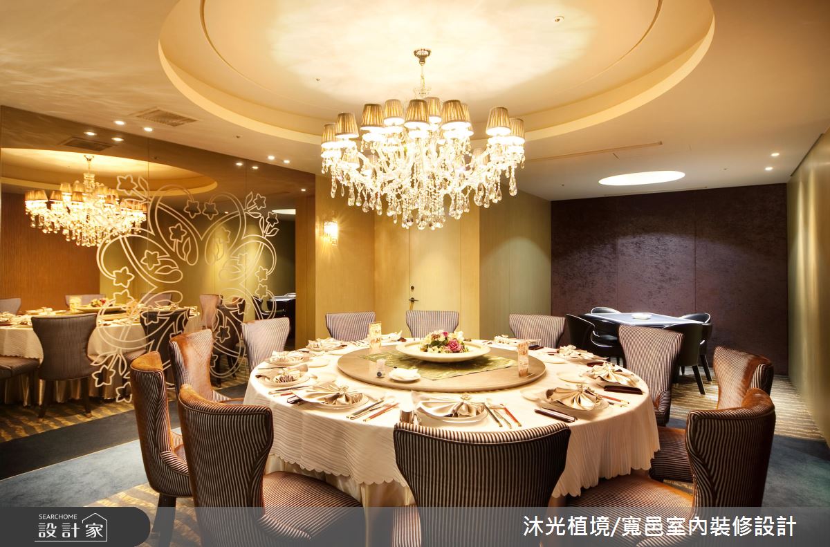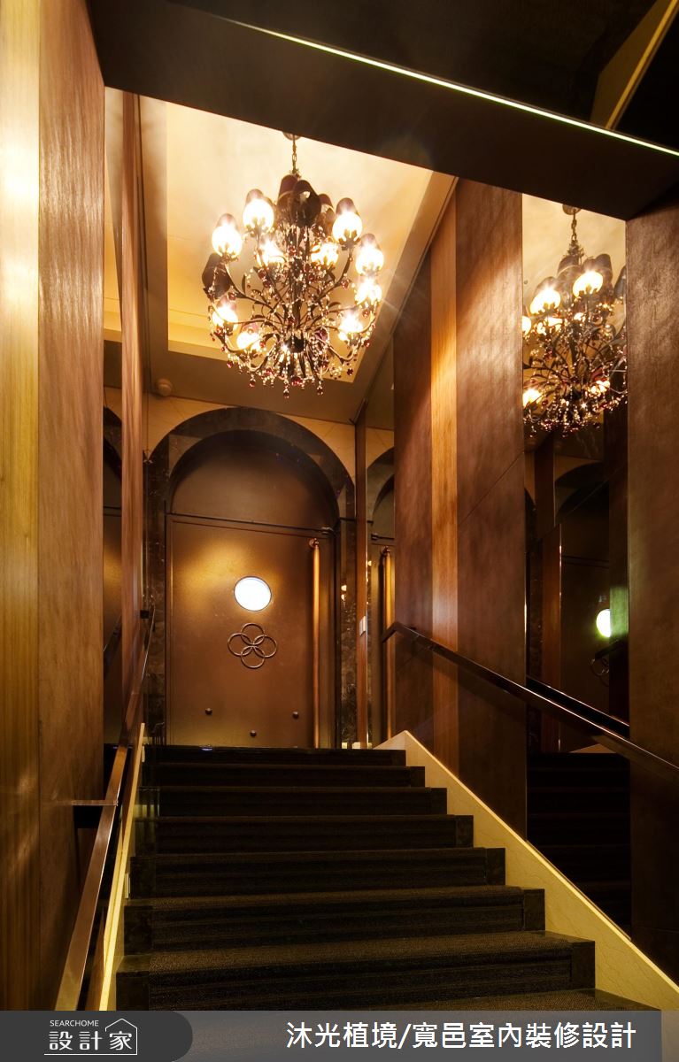 循著暈黃光源照亮的階梯,醞釀一股神祕的氛圍,上方高掛一盞華麗的水晶吊燈,吸引人們前往一探究竟的慾望,階梯兩側的壁面以鏡面鋪陳,讓狹長的階梯增添些許寬敞之意。廊道盡頭打造一處動人端景,天花板延伸出一條條細膩的光線,緊緊繫住璀璨的水晶球,彷彿一道從天而降的藝術之光;整體空間裡規劃幾個不同的用餐包廂可供選擇,天花板以花朵、漸層線板,或是內嵌照明搭以水晶吊燈的層次光意,彰顯非凡氣勢;在室內空間的風格運用上,無論以冶艷紅作為視覺主題,讓畫作與椅身展現時尚朝氣,還是搭配條紋視覺的椅子,與雕花鏡面相互輝映,甚至是尊爵質感的絨布椅背,搭以古典線條描繪,皆盡顯高級私人餐廳的經典奢華風範。
